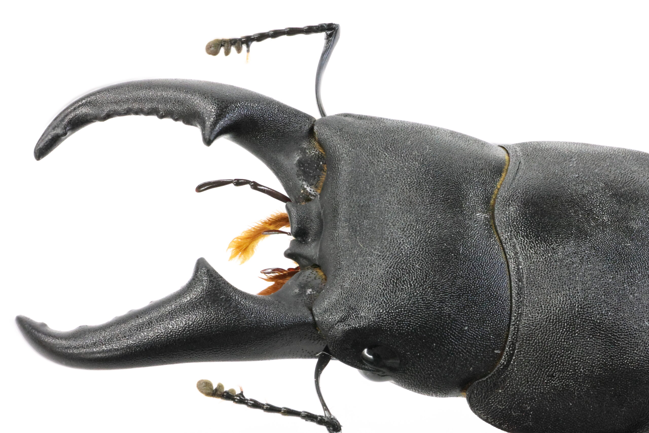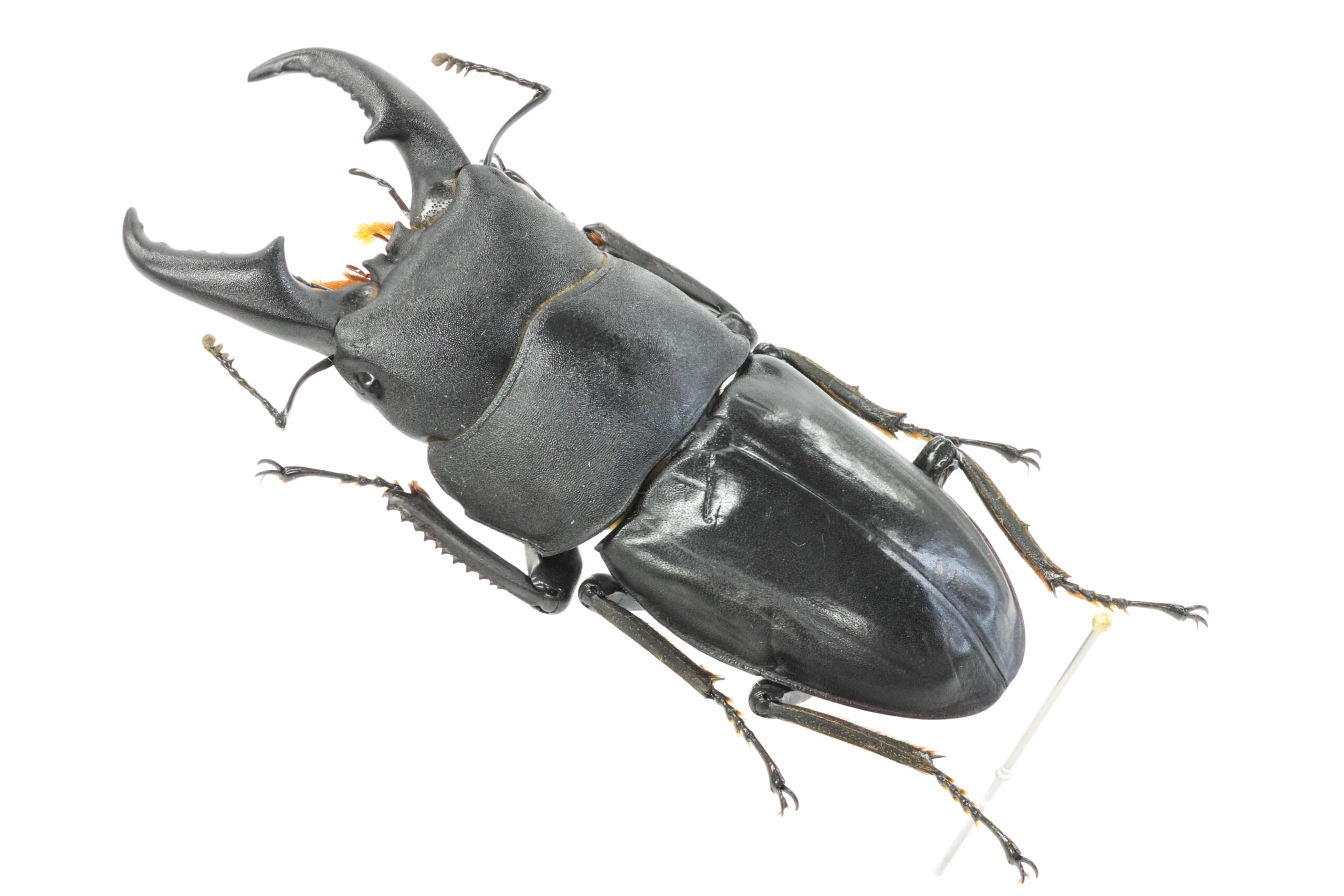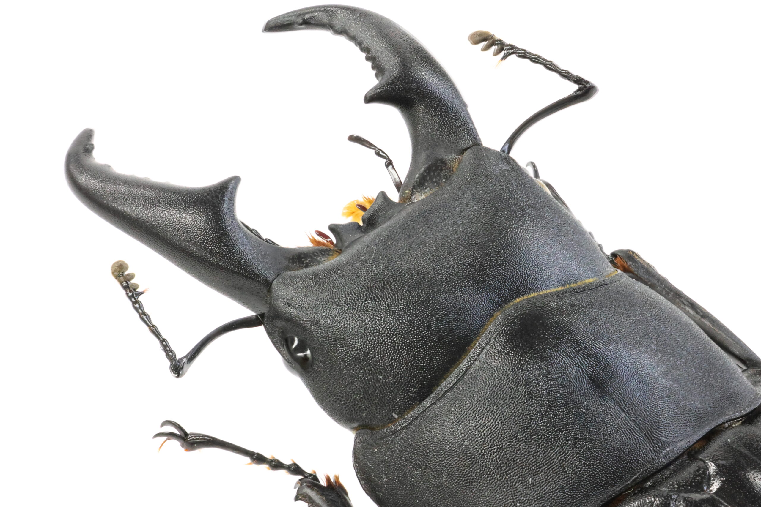 沖縄亜種も、この個体を見る限り、同じように感じます。65ミリクラスになるとボディも太いですが、大アゴも太くて短い!アゴ先が摩耗し、左上翅の傷も野武士のような渋さがあって、なんと格好良いこと。大アゴの太さで知られたタカラヒラタ(ヒラタクワガタ宝島亜種)のようにも見えてきます。沖縄亜種の野外最大個体は7センチを超えてきます。7センチってお化け個体ですね。