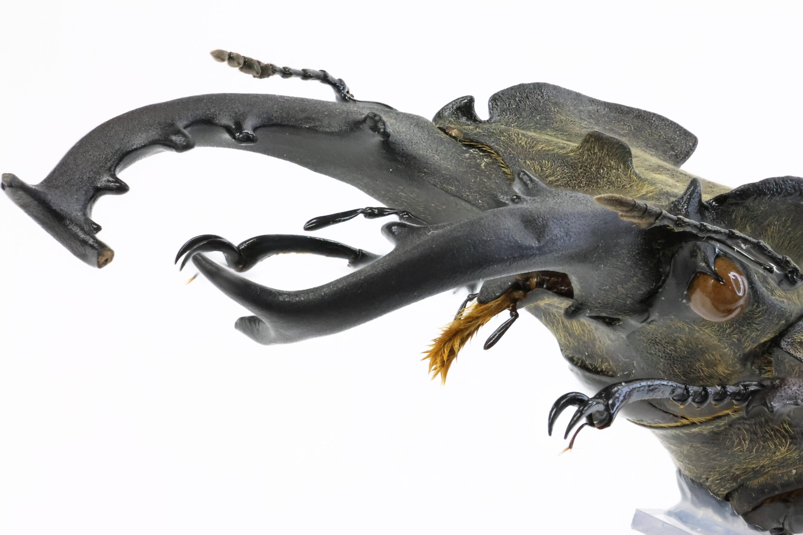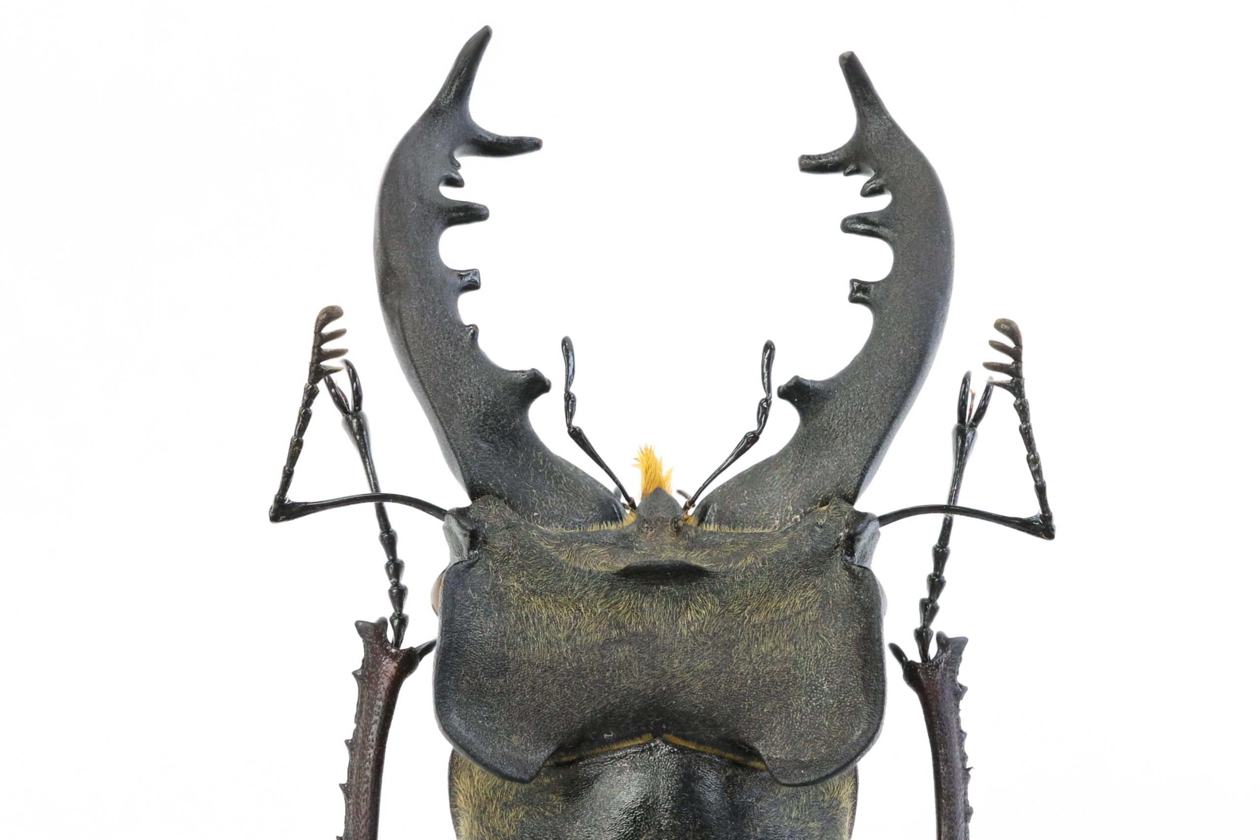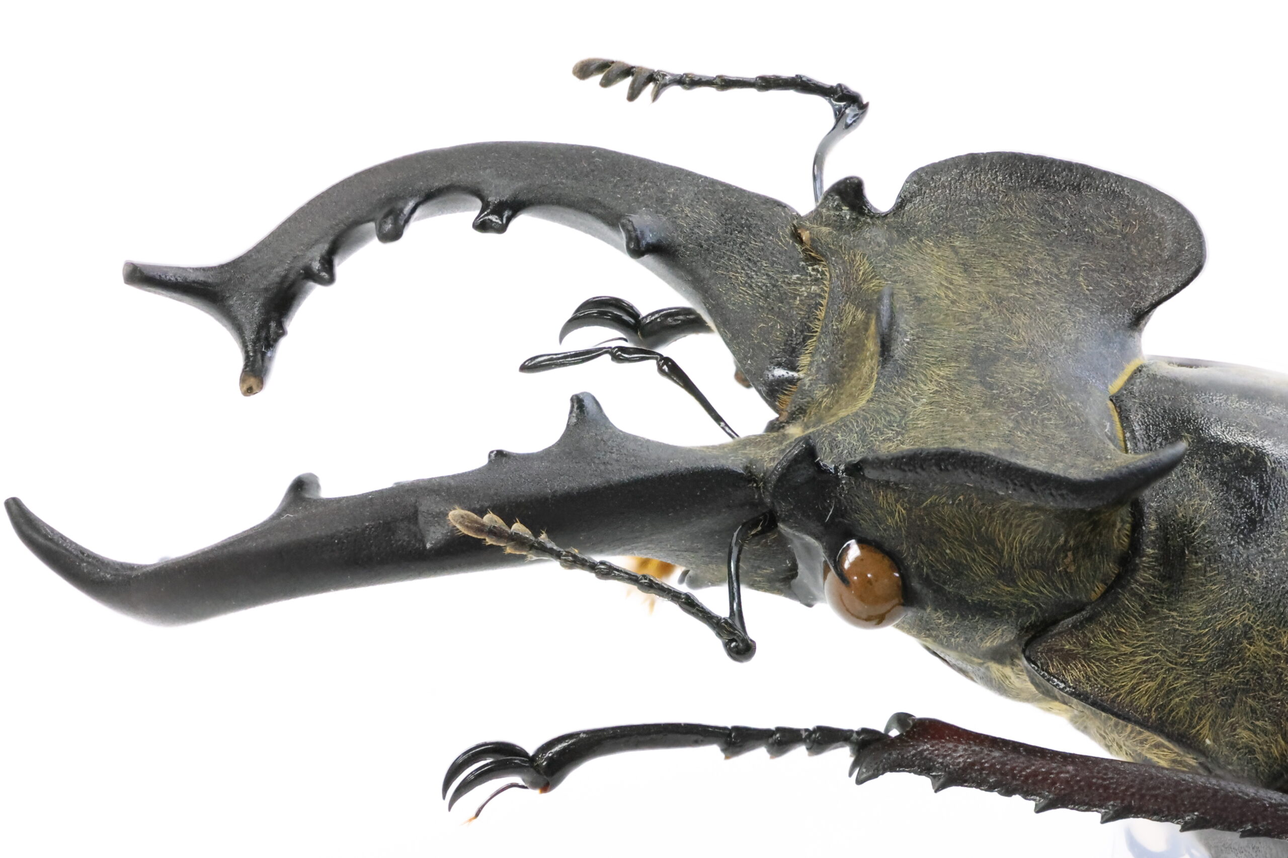 シカ角のように広がった大アゴ先端がなんと雄々しい!蝦夷型フォルムが人気なのがわかりますね。右アゴ先が少しかけています。7月後半に採集されたミヤマです。様々な強者と戦っていたのかもしれません。野外で採れたミヤマの多くは、大アゴのどこかが欠けていたりします。この武器を様々に駆使して生き抜いているんですね。