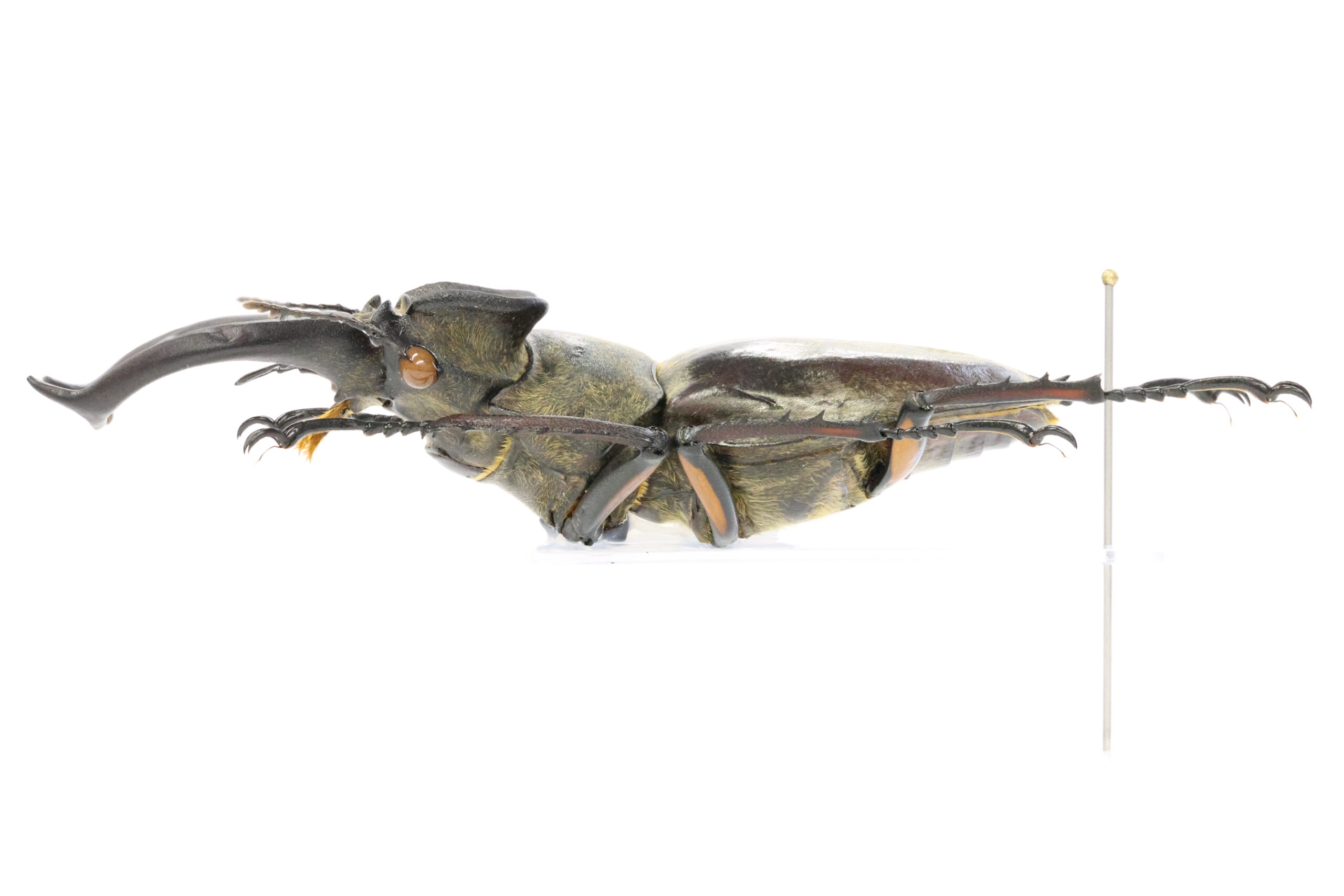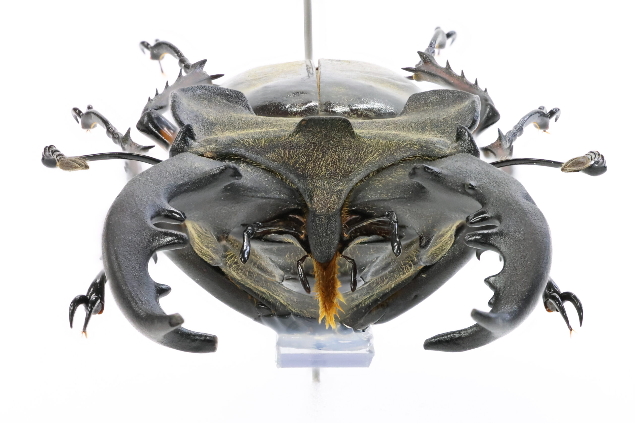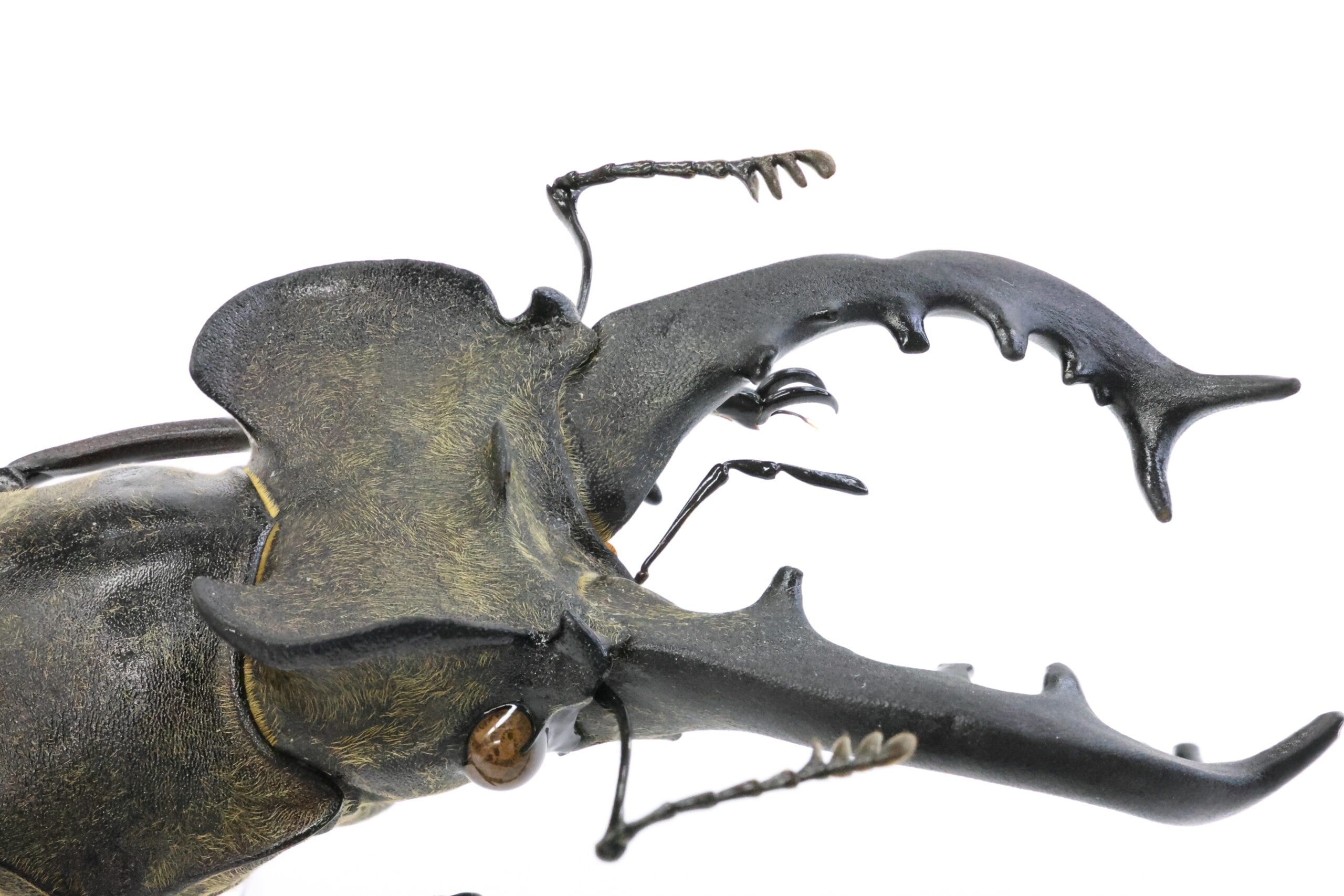 シカ角のように広がった大アゴ先端がなんと雄々しい!蝦夷型フォルムが人気なのがわかりますね。右アゴ先が少しかけています。7月後半に採集されたミヤマです。様々な強者と戦っていたのかもしれません。野外で採れたミヤマの多くは、大アゴのどこかが欠けていたりします。この武器を様々に駆使して生き抜いているんですね。