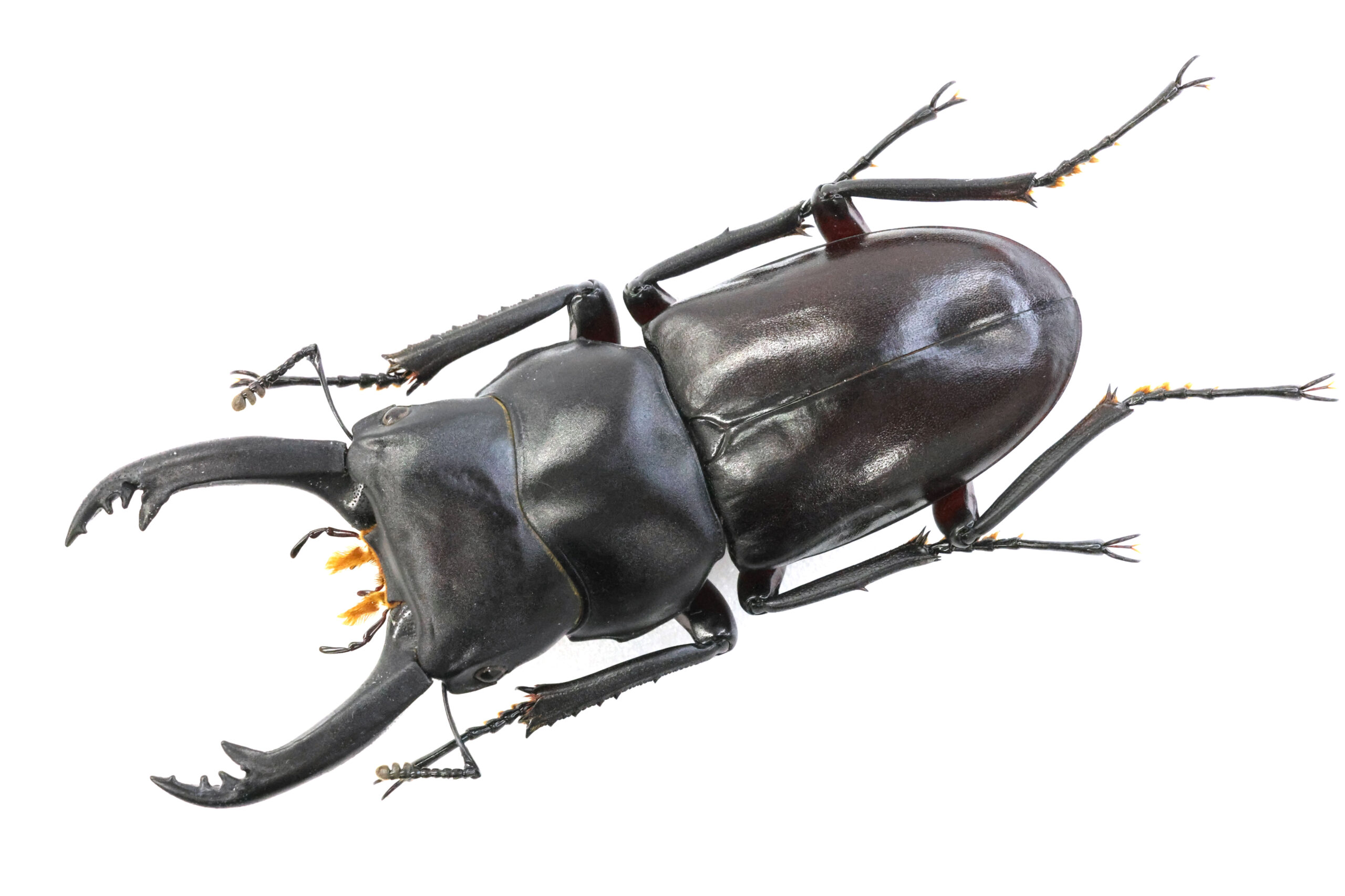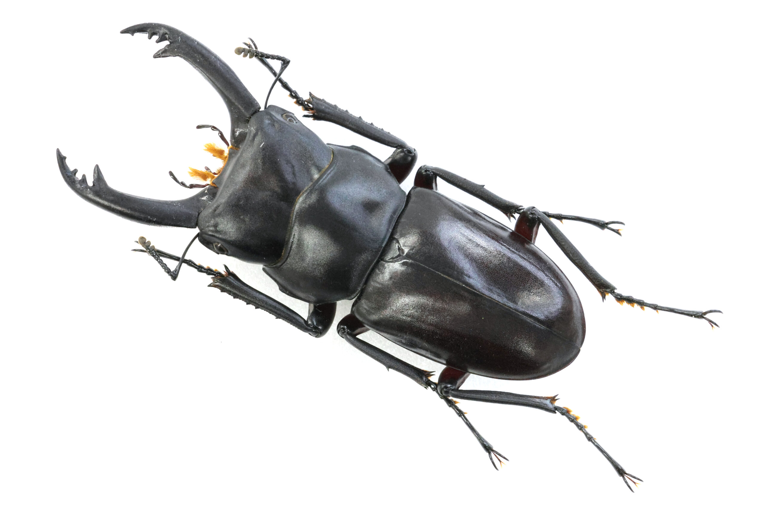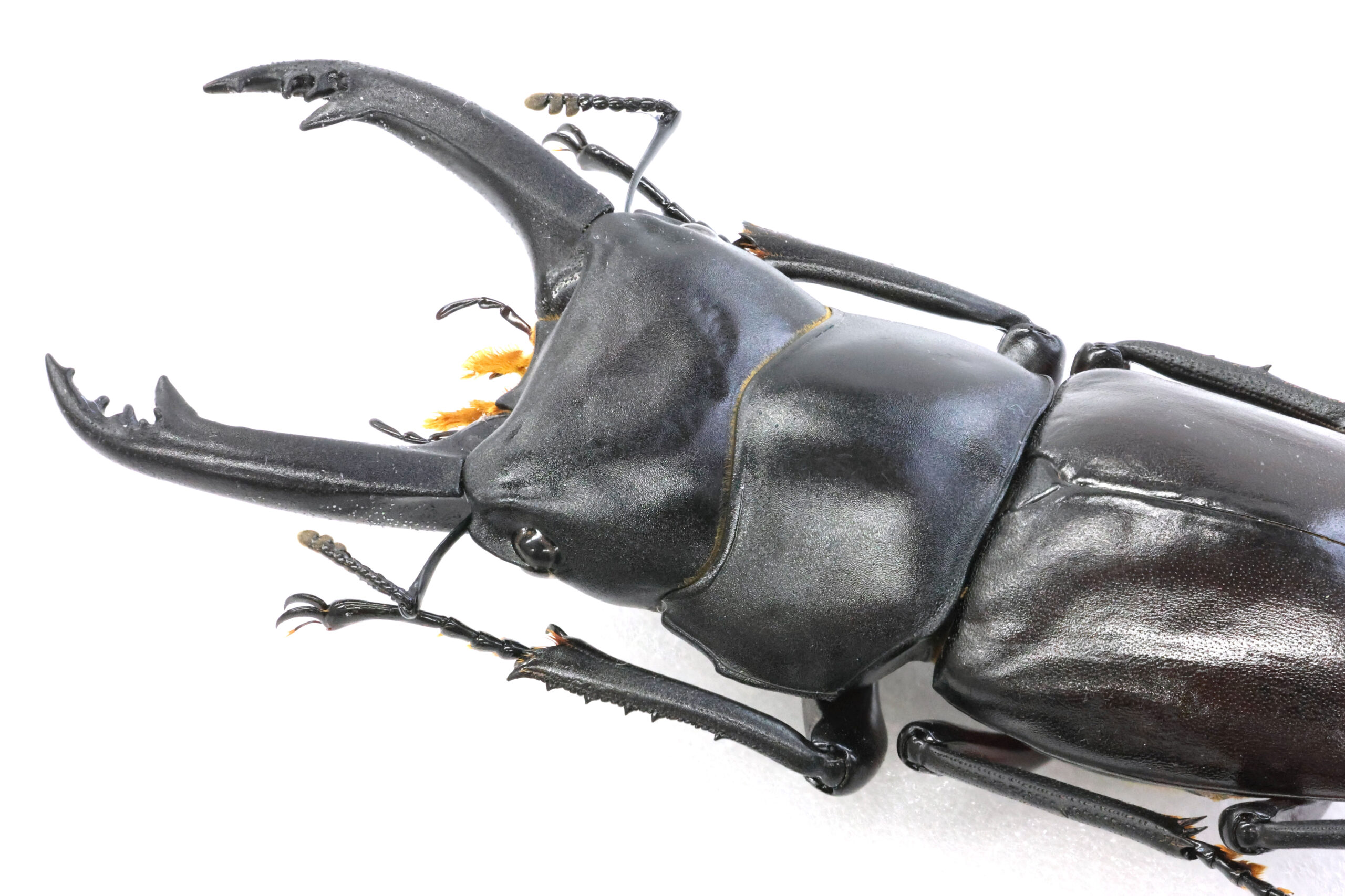 幼い頃の私にとっては、図鑑の中だけで見ることができるクワガタでした。大アゴはスラっと直線的に伸び、アゴ先のギザギザがエレガントなアクセントになっています。艶のある黒をまとい、お腹を見ると、美しく赤い。私の中では、漆塗りの高級漆器!日本の伝統美術工芸品のようなイメージです。