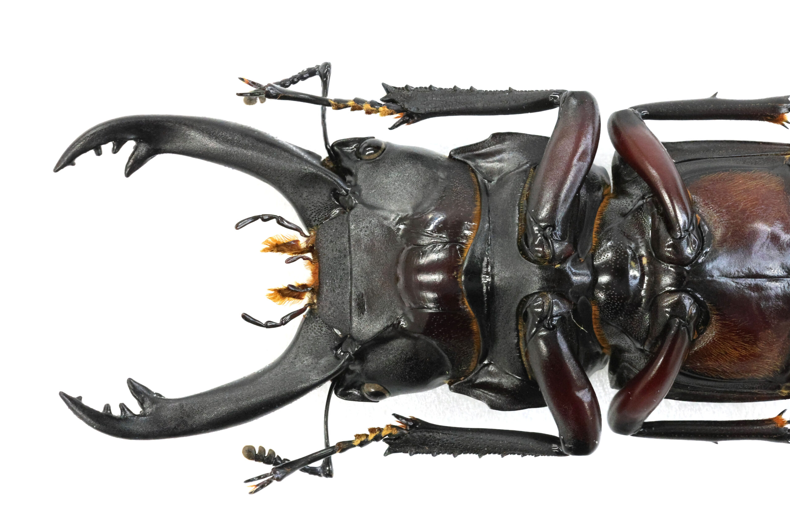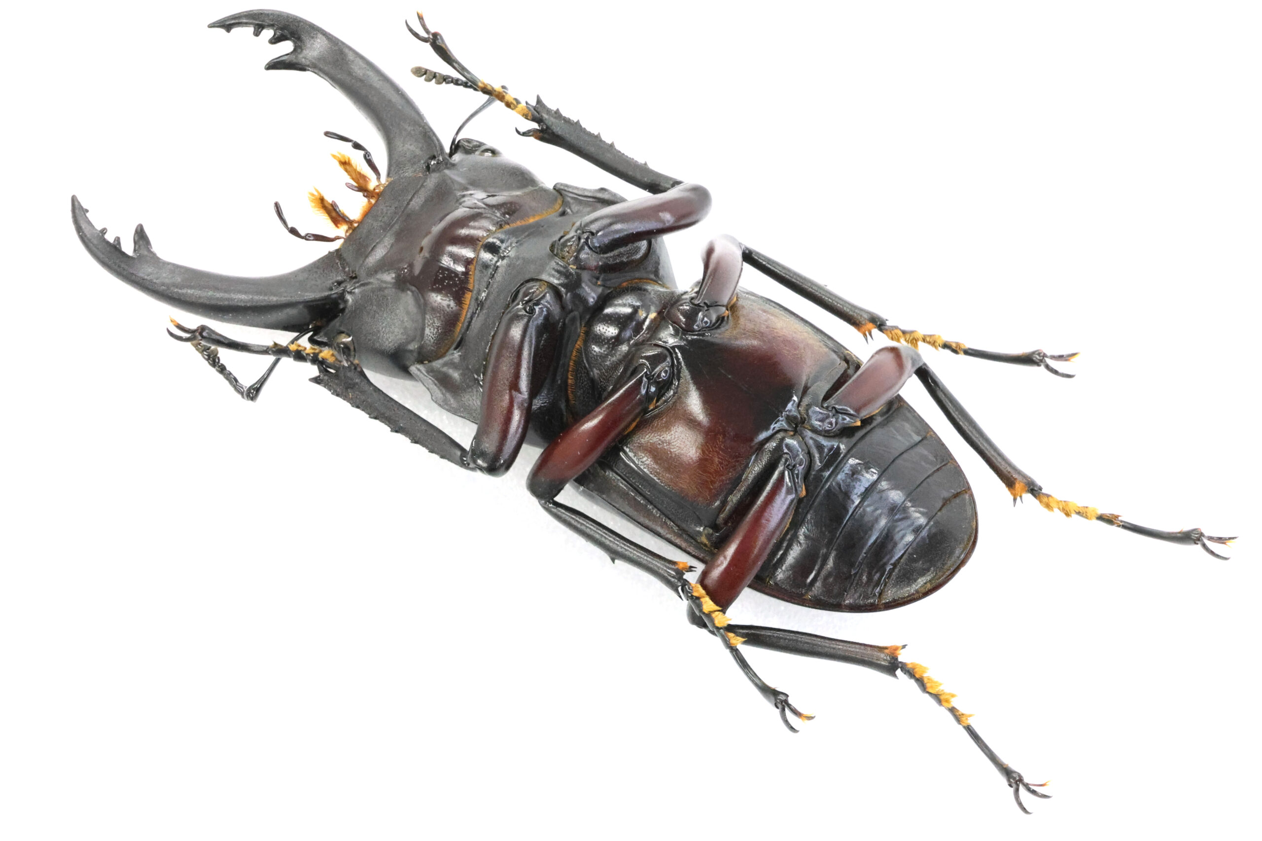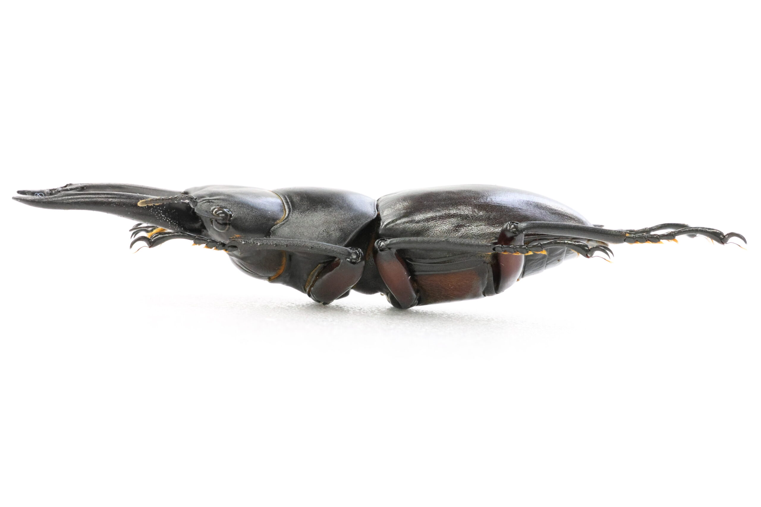 さぁ、腹側をじっくり見てみましょう。この美しい赤!両生類にアカハライモリという種類がいます。名前の通り、お腹が赤いからこの名前が付けられました。このクワガタも脚だけではなく、胸部や腹部もかなり赤いです。「アカハラクワガタ」でも良いのでは?
