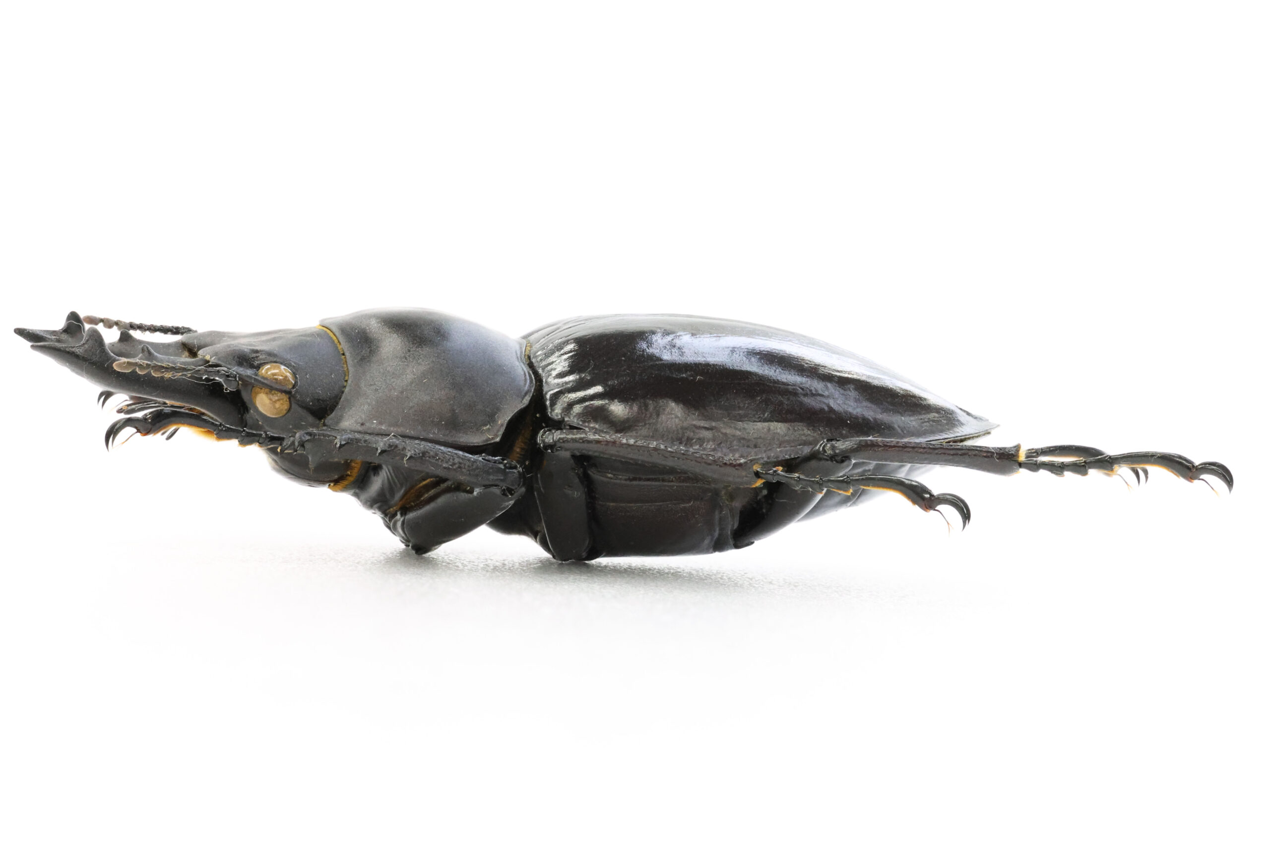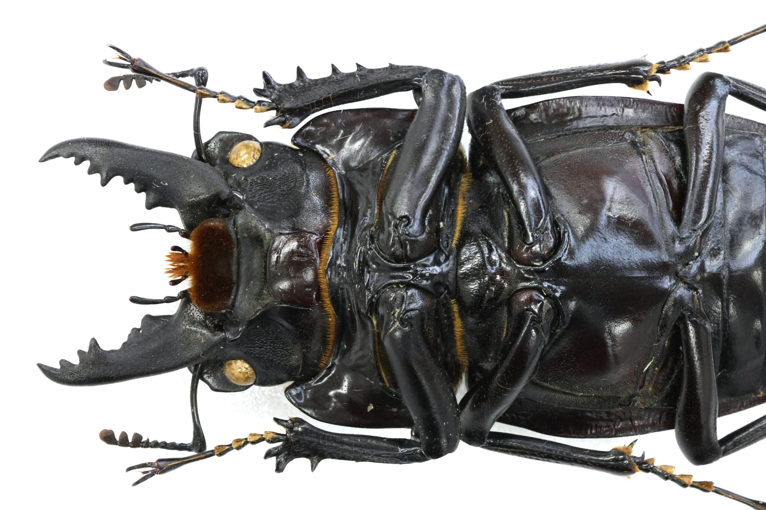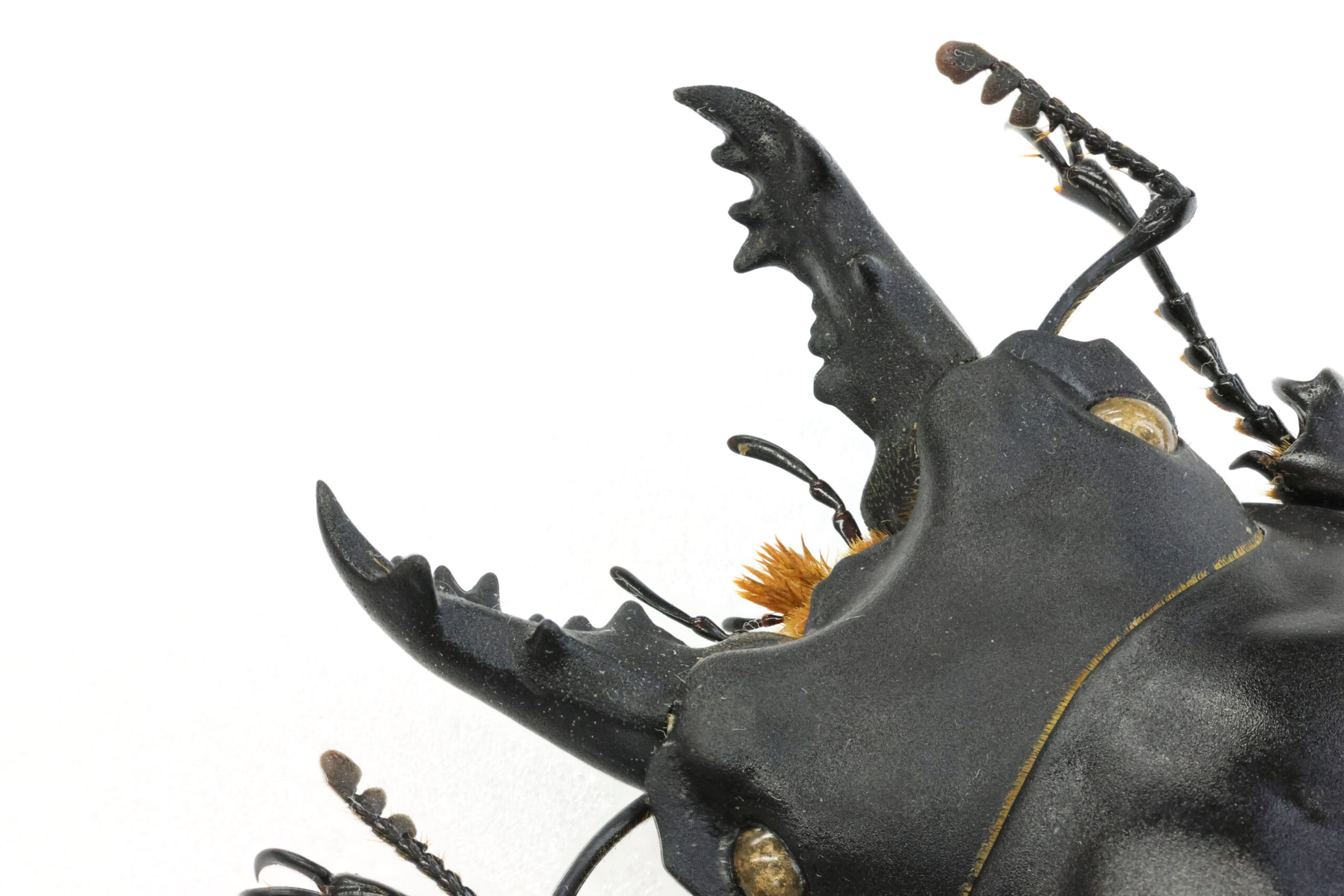 大アゴをサイドから見ると、垂直に角が立ち上がっています。この個体は大あごの発達が良いため大アゴの先端だけでなく、中央にも縦角が見えます。特徴的な大アゴを象徴して、以前は日本で見られるマルバネクワガタのことを、タテヅノマルバネクワガタと呼んでいました。