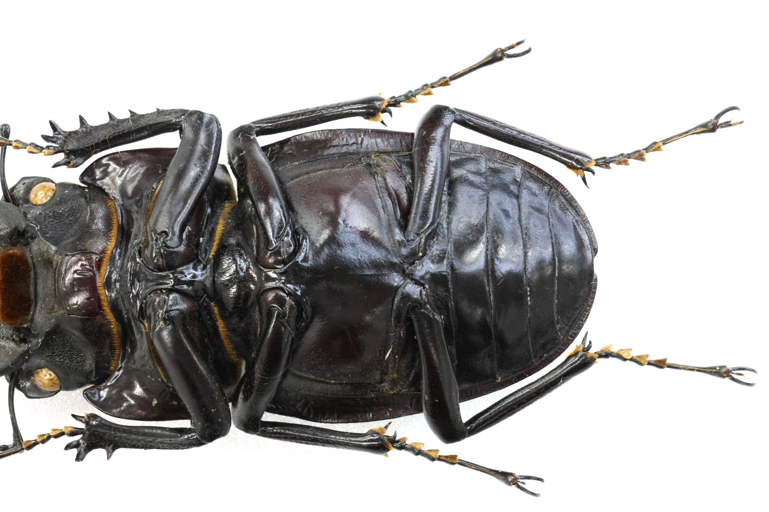 もちろん、この個体は指定前に採集された種親(幼虫)から累代したBreedものとなります。沖縄在住のSさんは、クワガタ飼育のスペシャリストとして有名な方です。特にマルバネクワガタの飼育技術はトップクラスです。歯型を見て下さい。野外ではなかなか見ることができない中歯型です。野外で見られるアマミマルバネクワガタのほとんどは、小歯型で短い大あごに、単調なギザギザが並んでいる個体ばかりです。こんなに歯が乱れている(言葉の表現が!?ですが)個体は滅多に見ることができません。