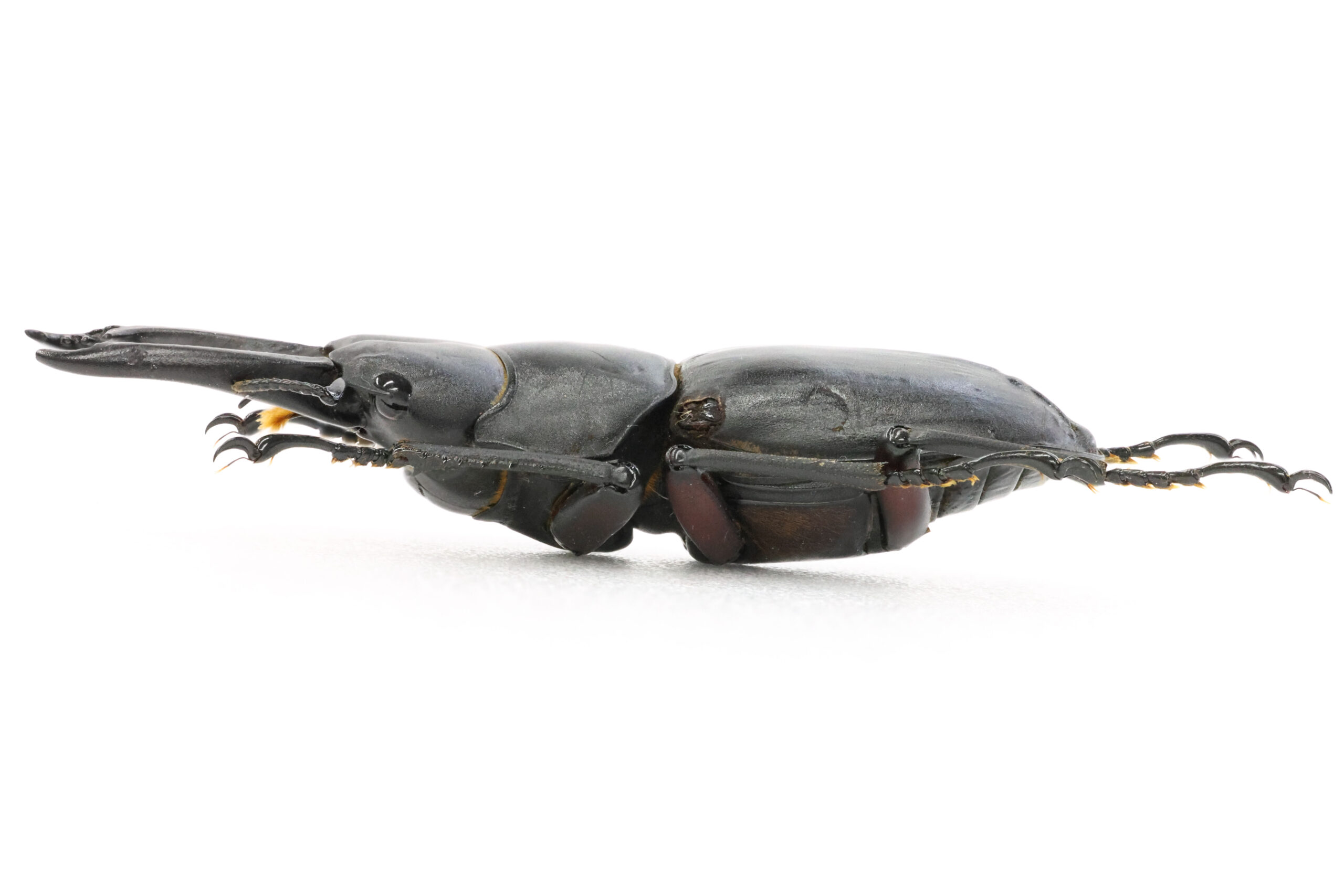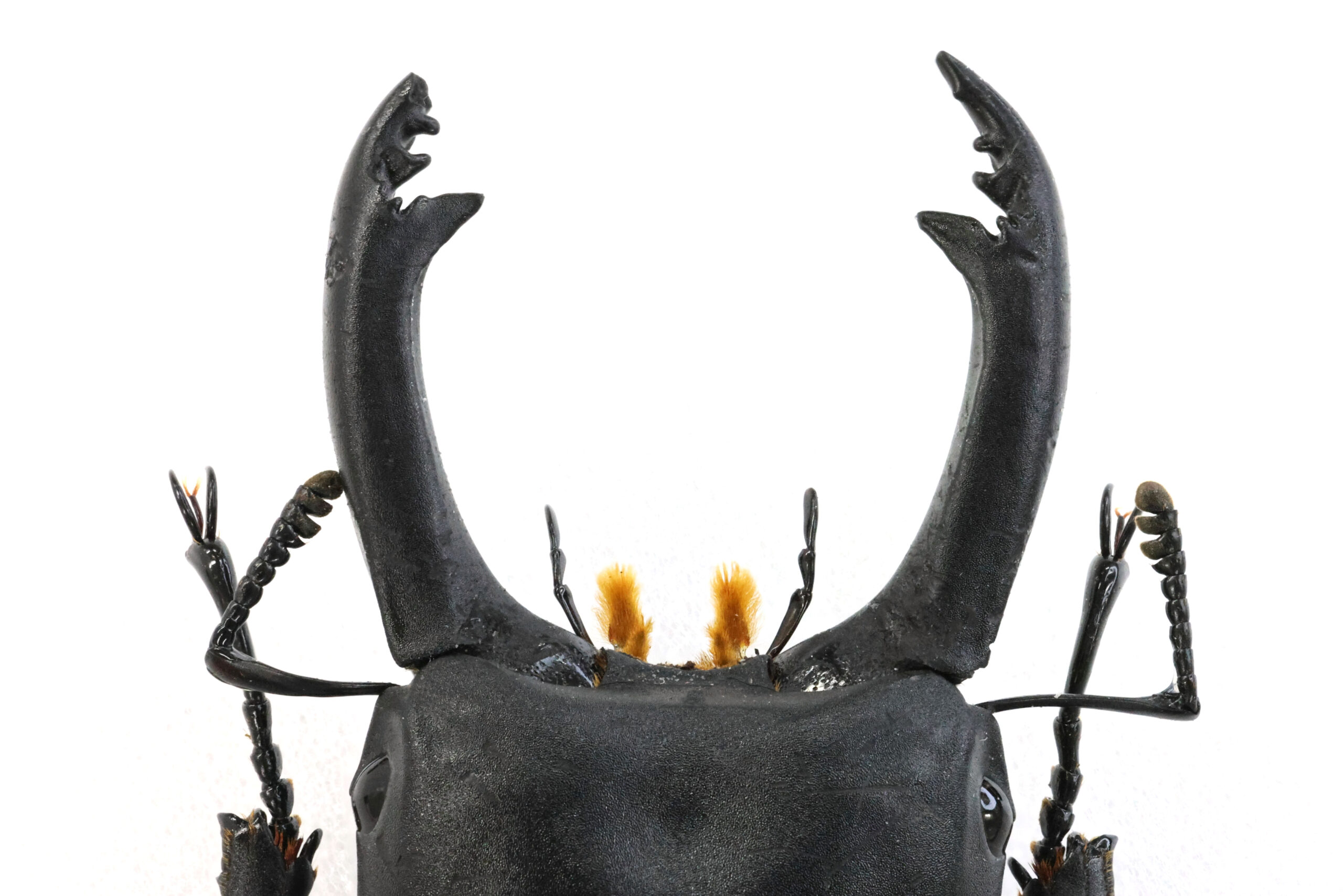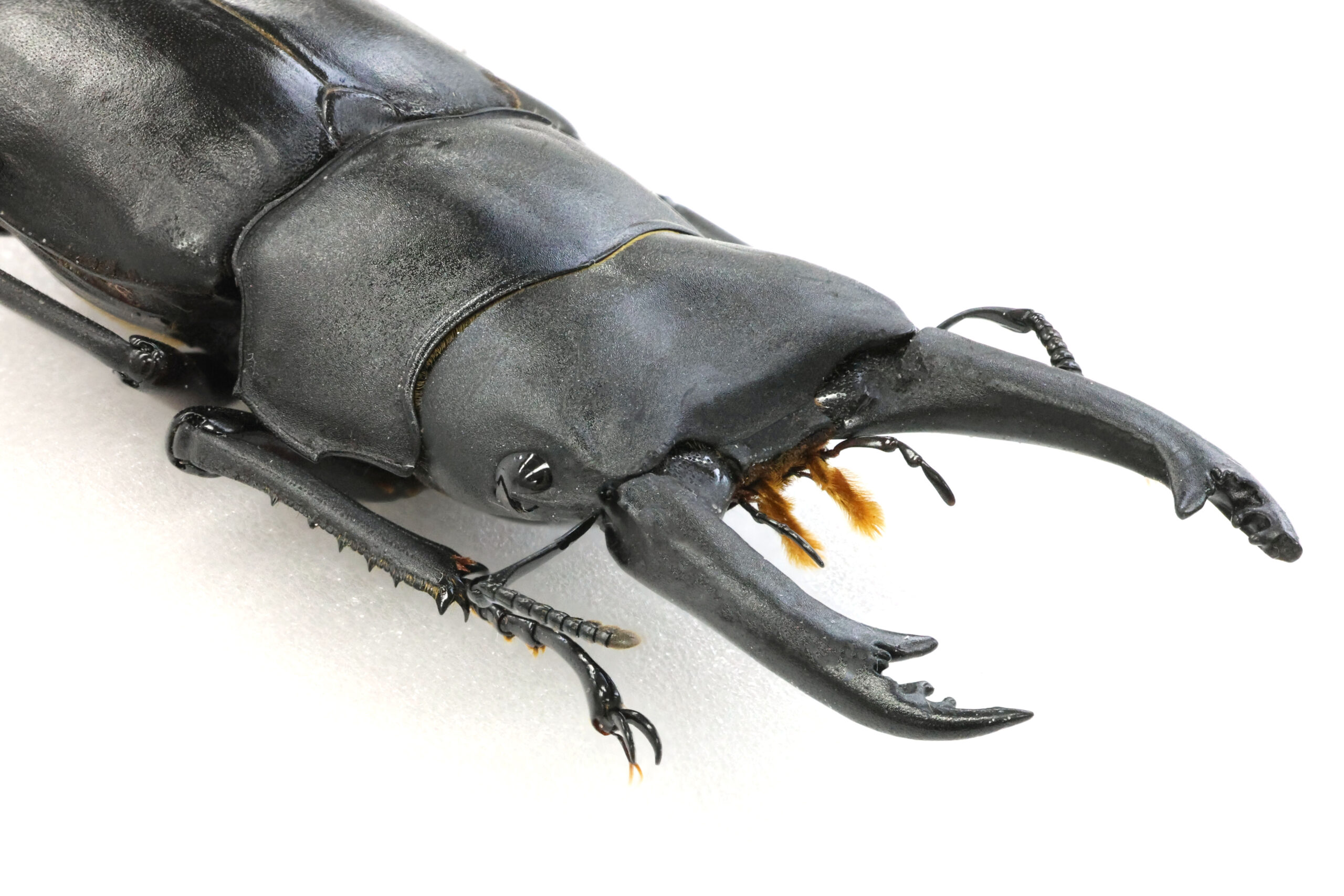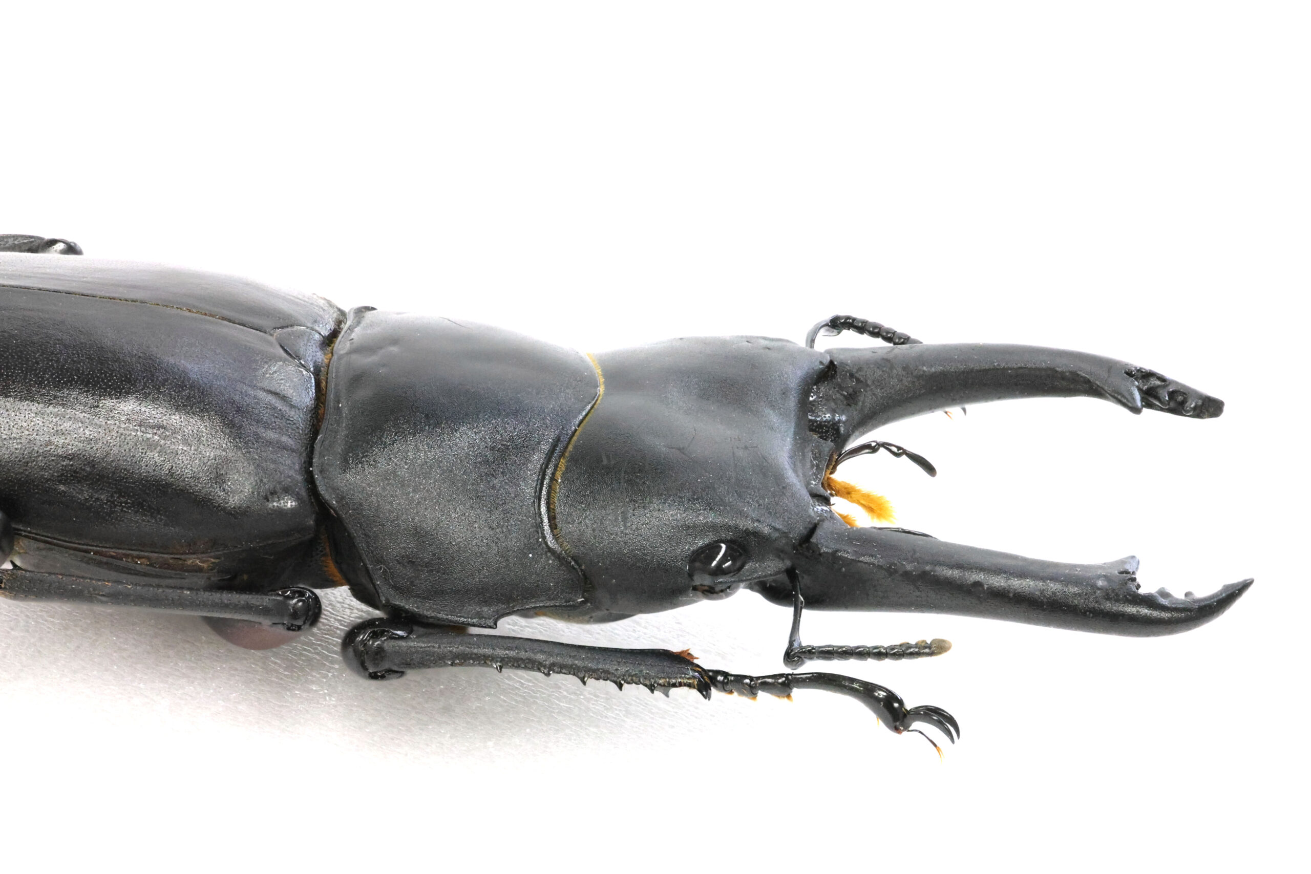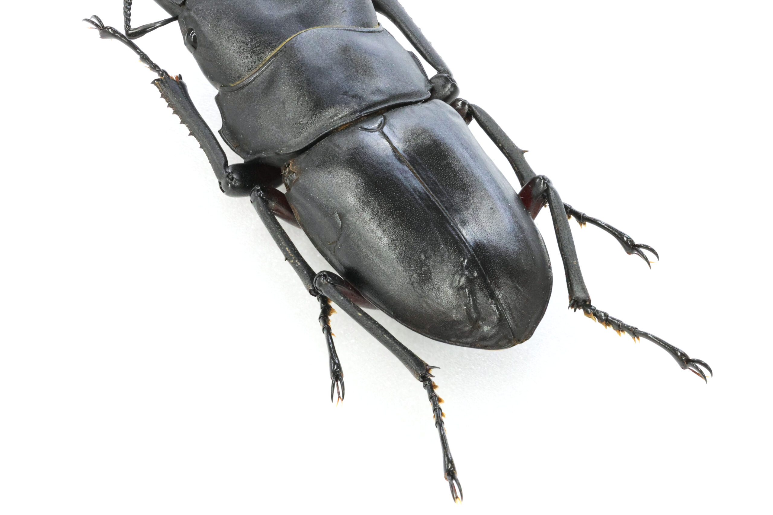 そんな条件でも、これだけ大きくなったのですから、すごいポテンシャルを持っている個体かもしれません。アカアシとしては横幅のあるタイプ!アゴ先が折れて、上翅にも削れやコブがあることで、歴戦の勇者のような武骨な格好良さを感じます。