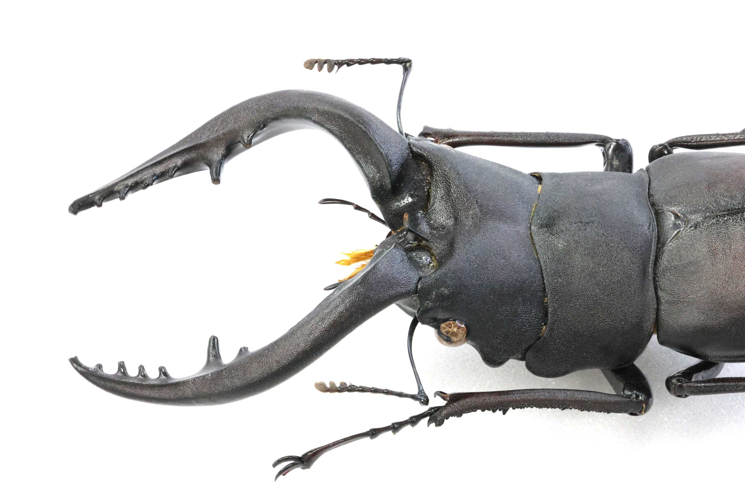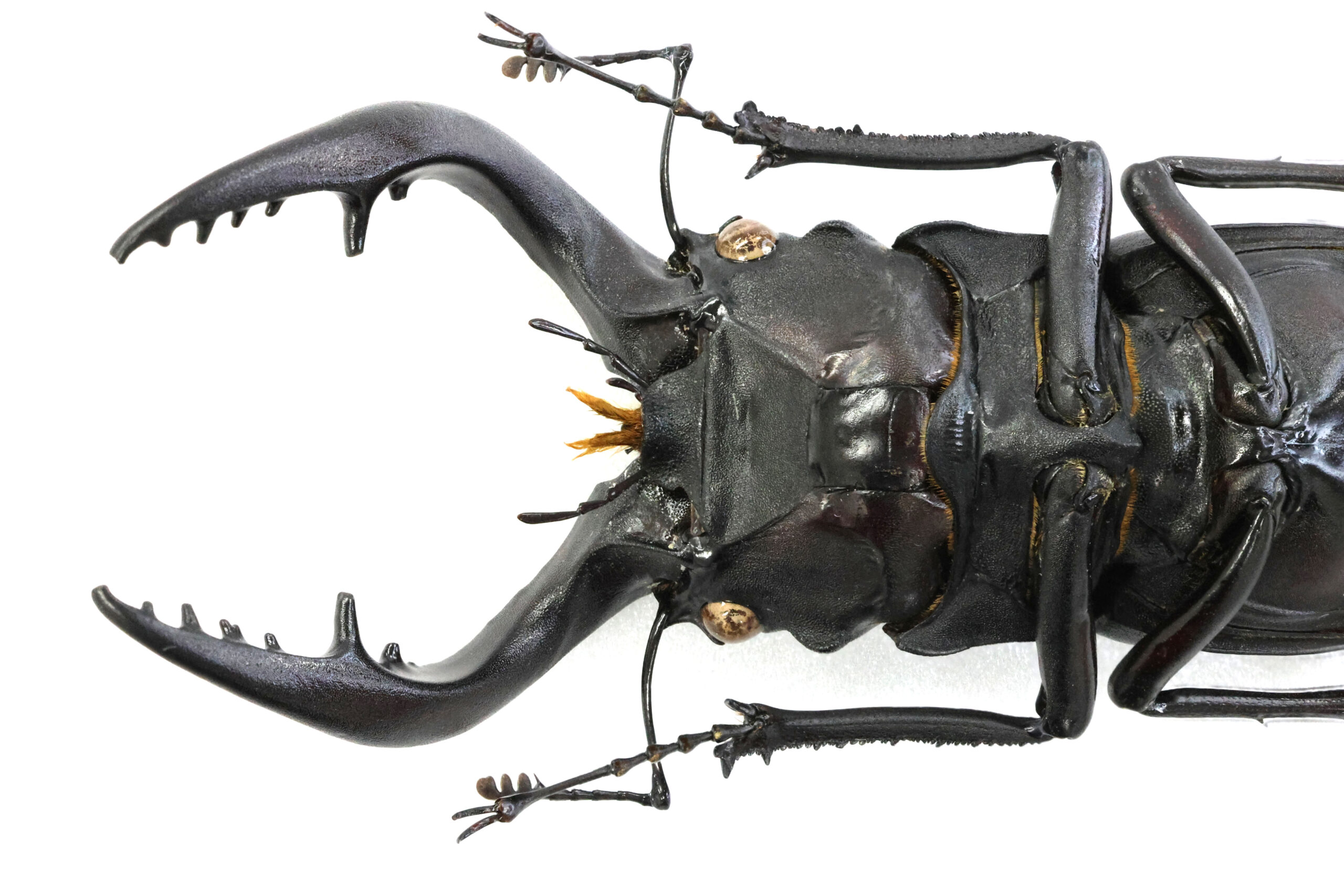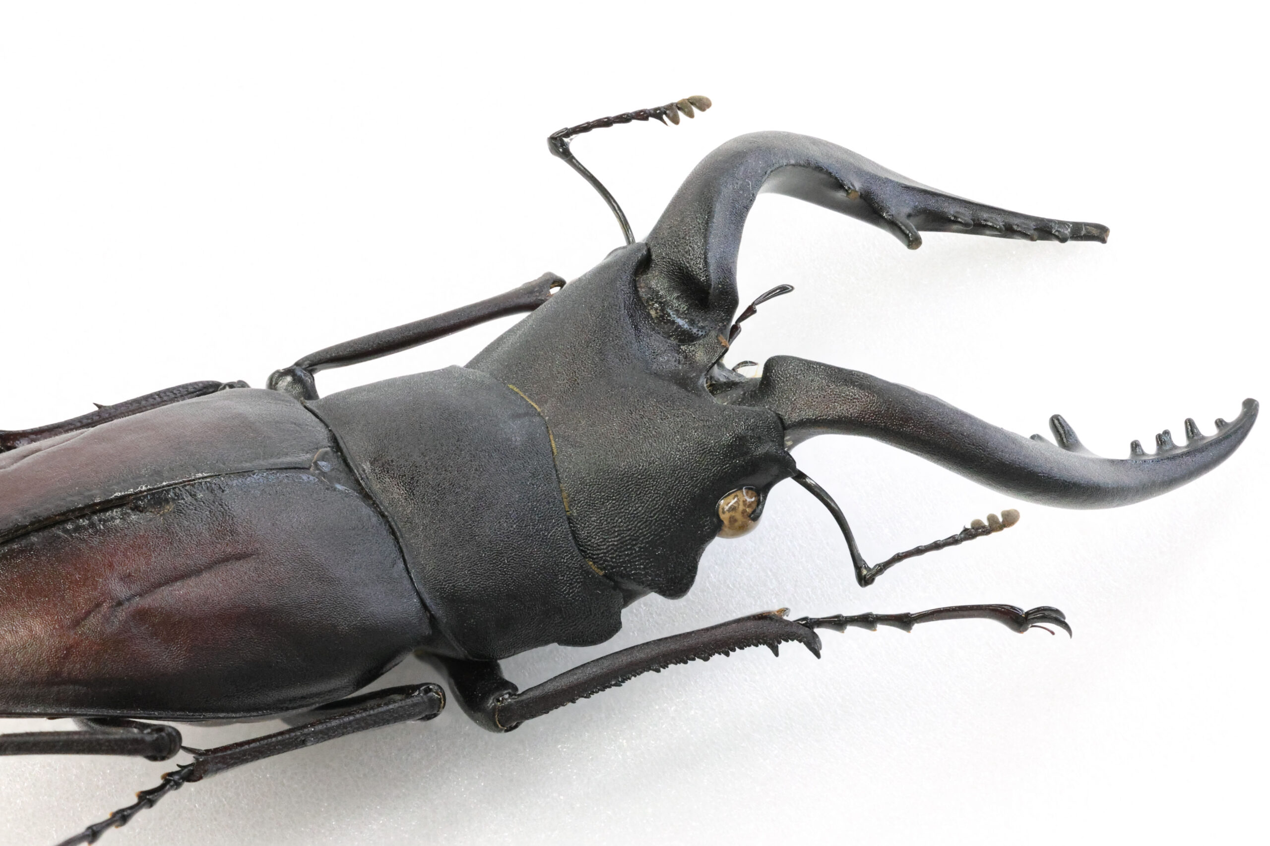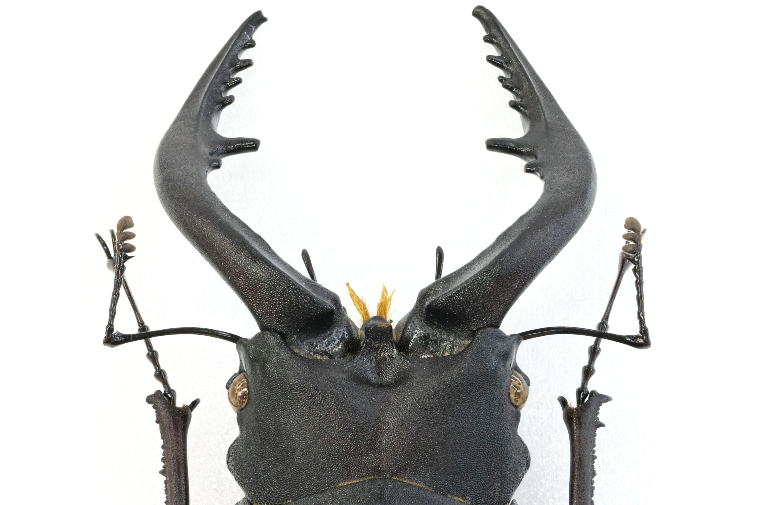 左アゴ先が少し欠けて、短い方の小顎鬚(しょうがくし)が切れていますが、それ以外は完品です。大あごの湾曲も良くて美しいラインが出ていますね。上翅には、穴は開いていませんが深い傷が見えます。クワガタ同士で挟みあってできた傷なのでしょうか?傷はオスの勲章!格好良い。