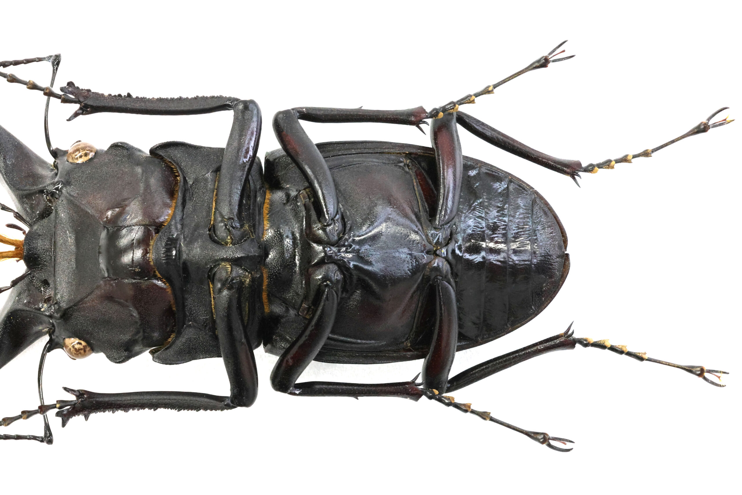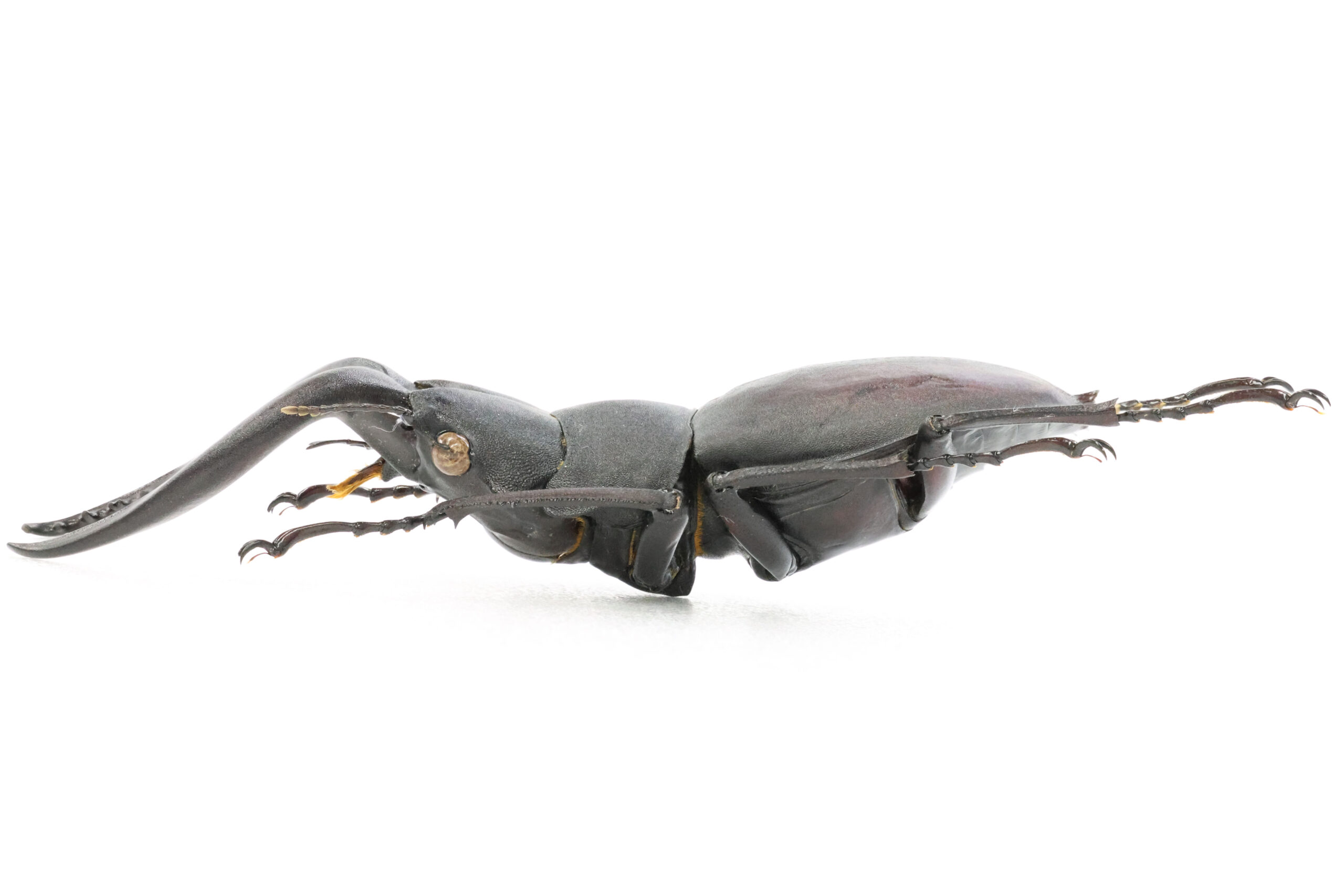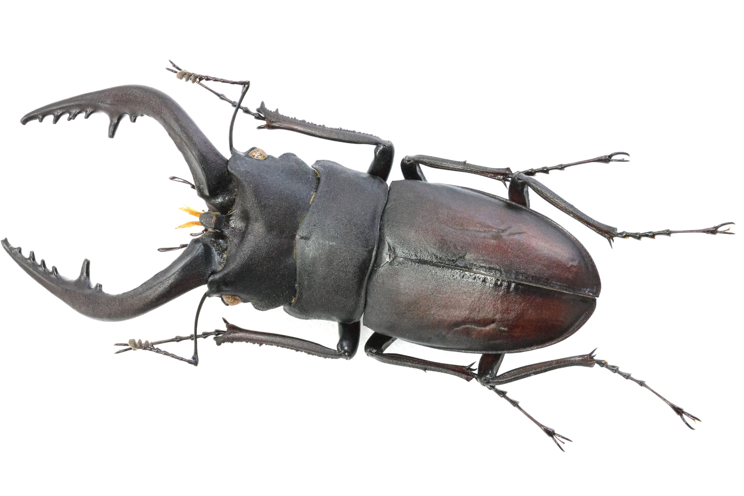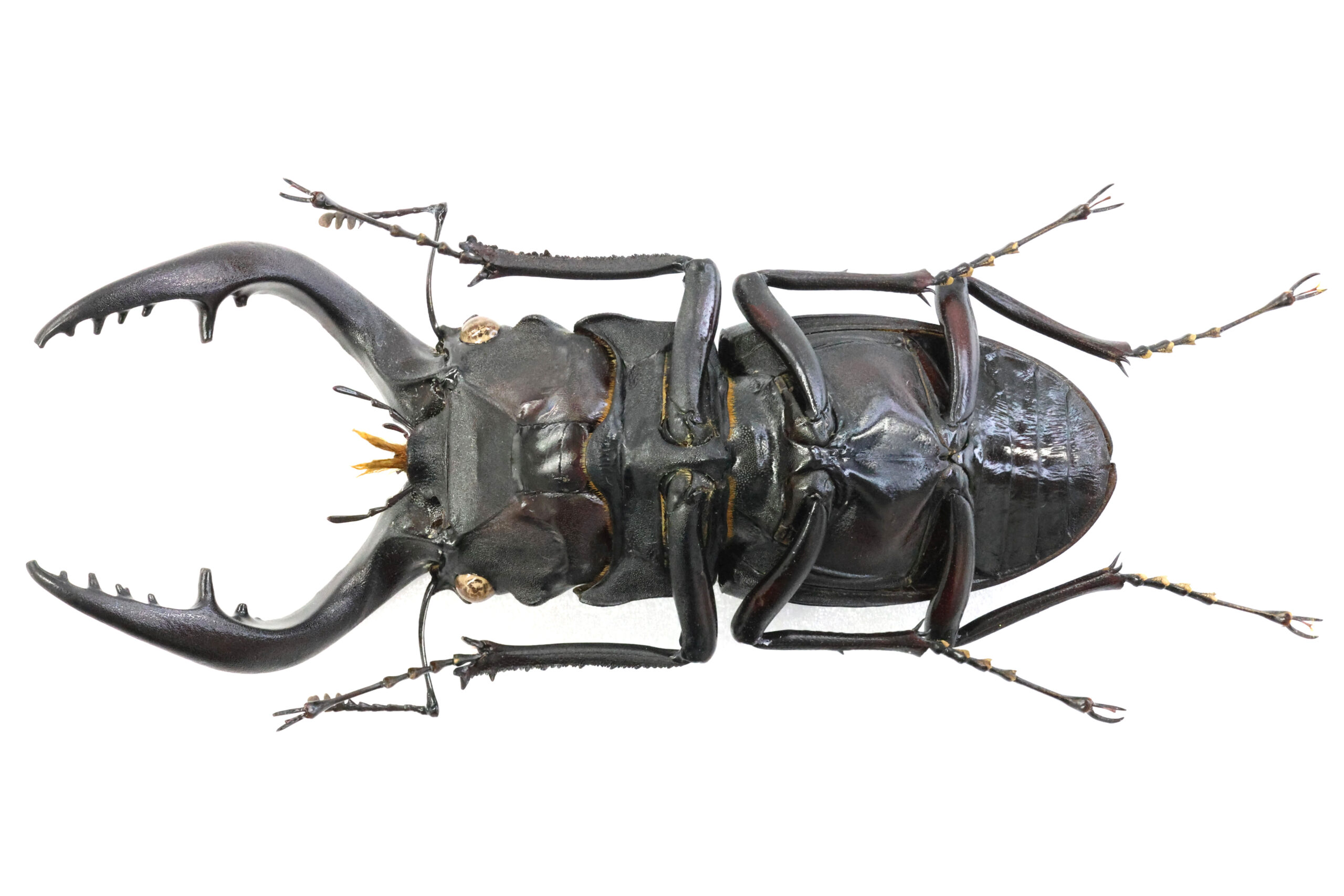 左アゴ先が少し欠けて、短い方の小顎鬚(しょうがくし)が切れていますが、それ以外は完品です。大あごの湾曲も良くて美しいラインが出ていますね。上翅には、穴は開いていませんが深い傷が見えます。クワガタ同士で挟みあってできた傷なのでしょうか?傷はオスの勲章!格好良い。
