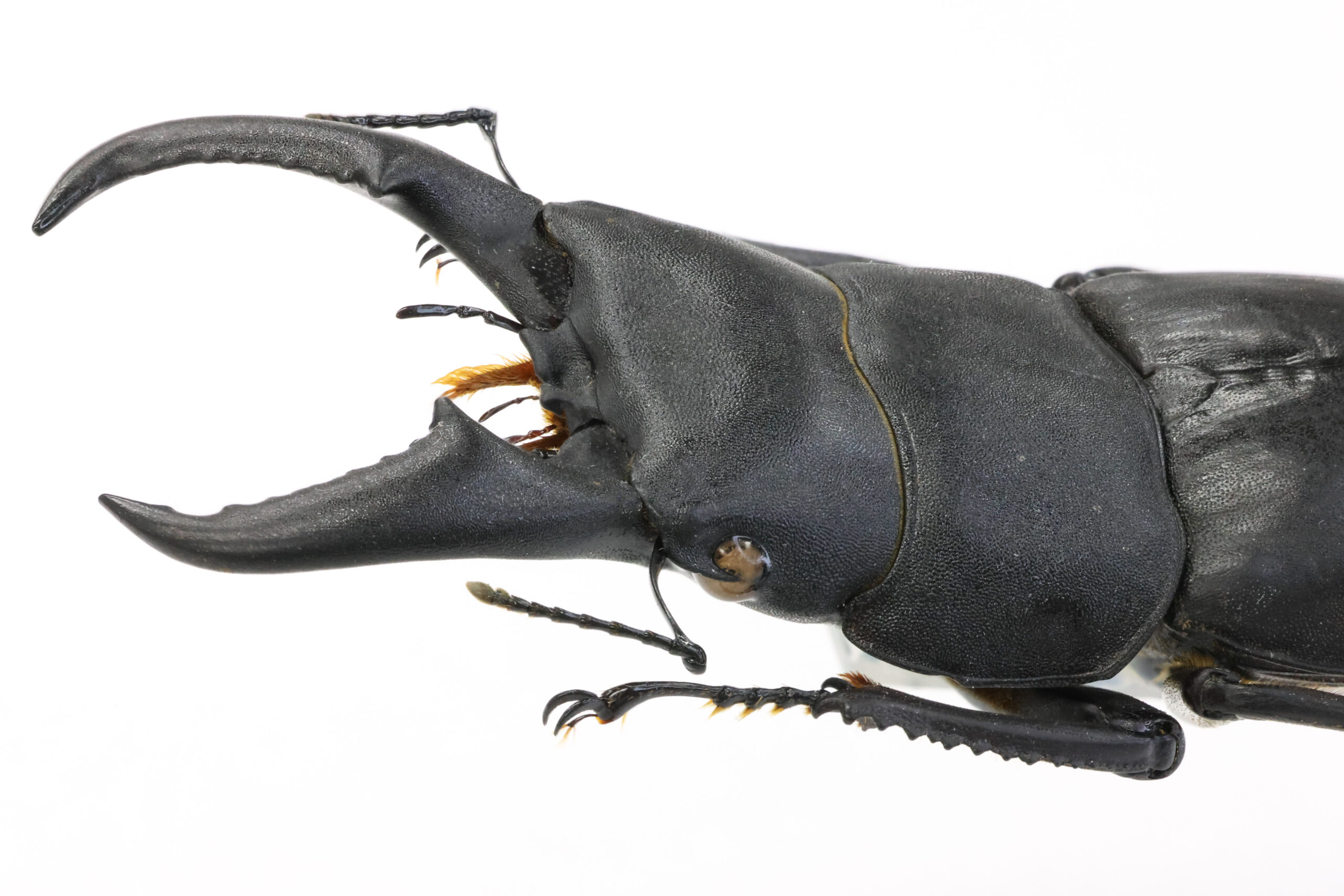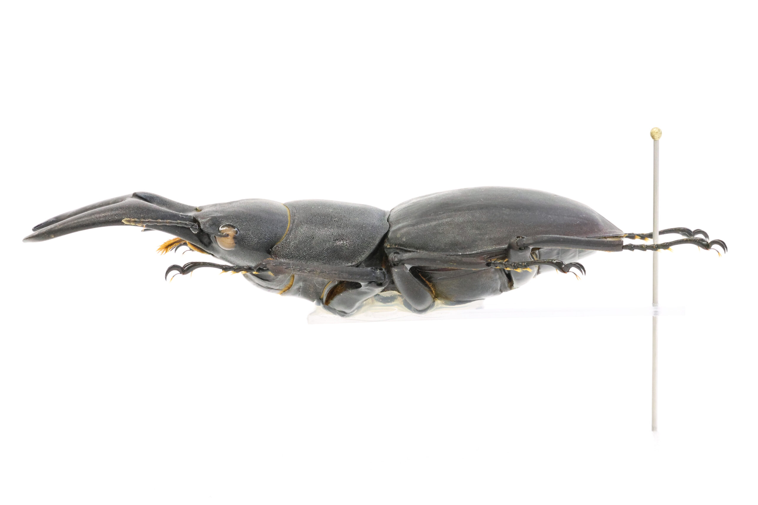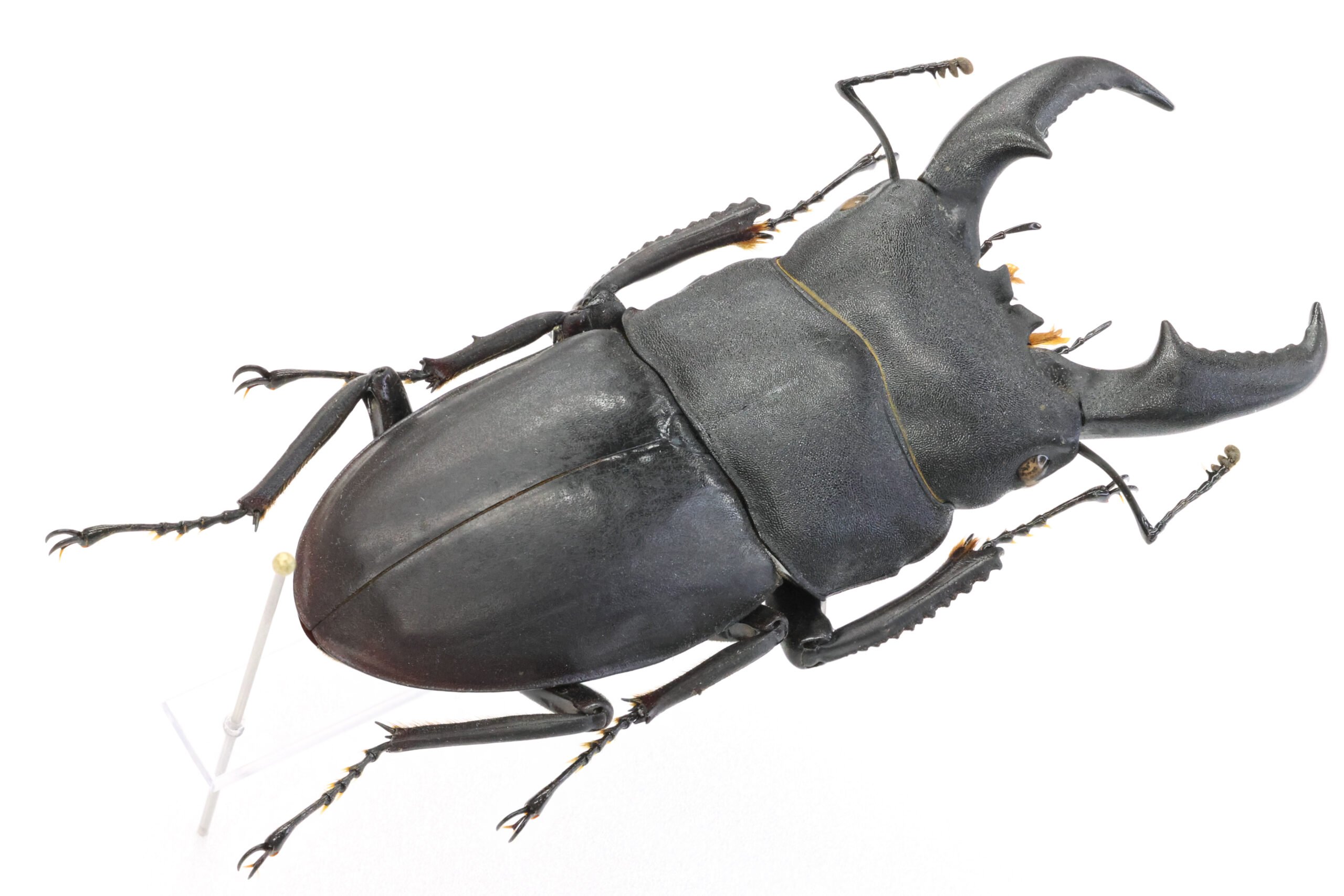 本個体を見て下さい。大アゴの発達も良く、太さもあって魅力的な個体です。艶消しはヒラタクワガタの大型個体の特徴です。チビ個体はピカピカですが、この個体を見て下さい。羽化してから少し長く生きていたように思います。上翅が擦れているため、さらに艶消し感が出ています。惚れ惚れするフォルムです。