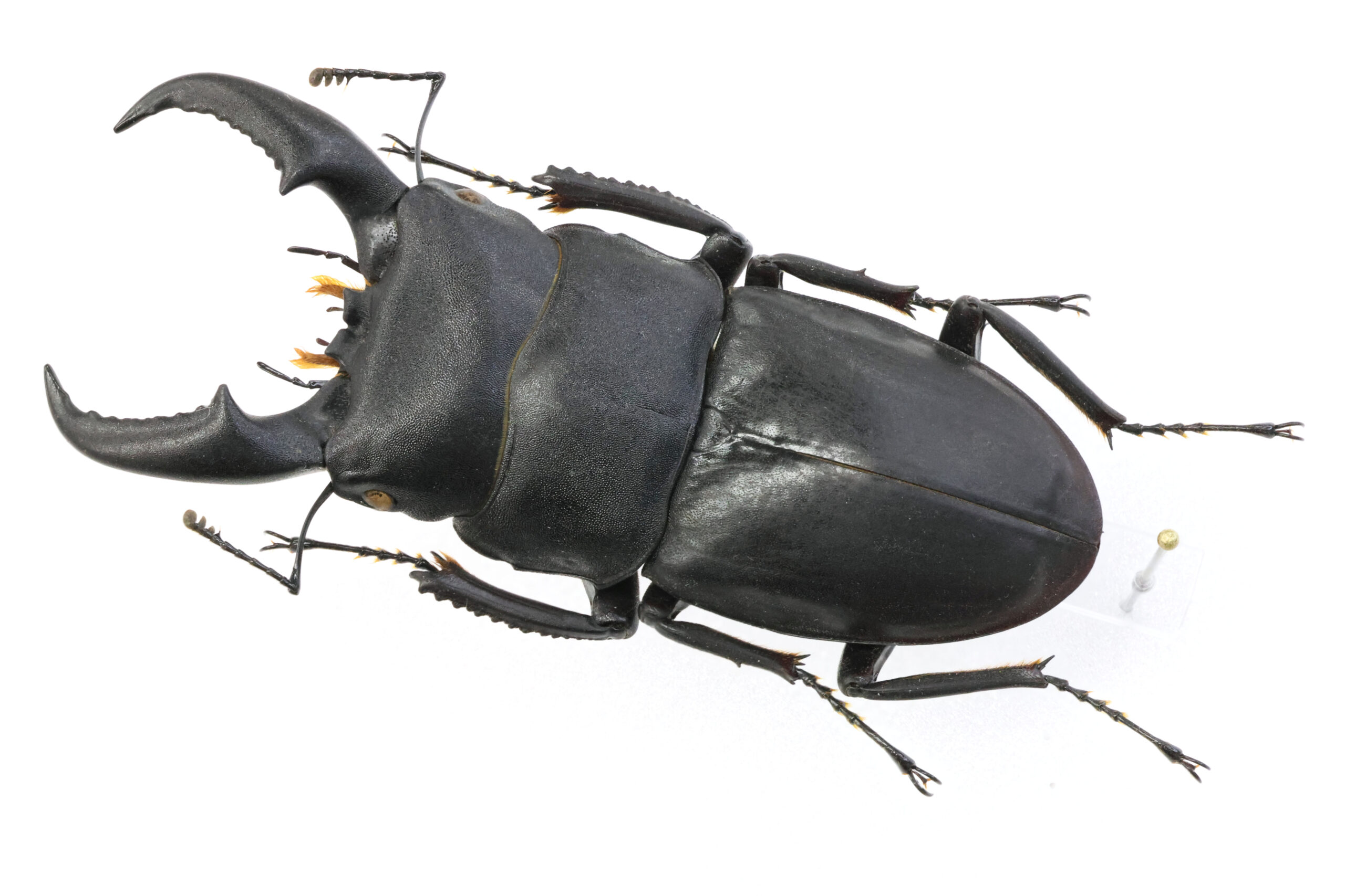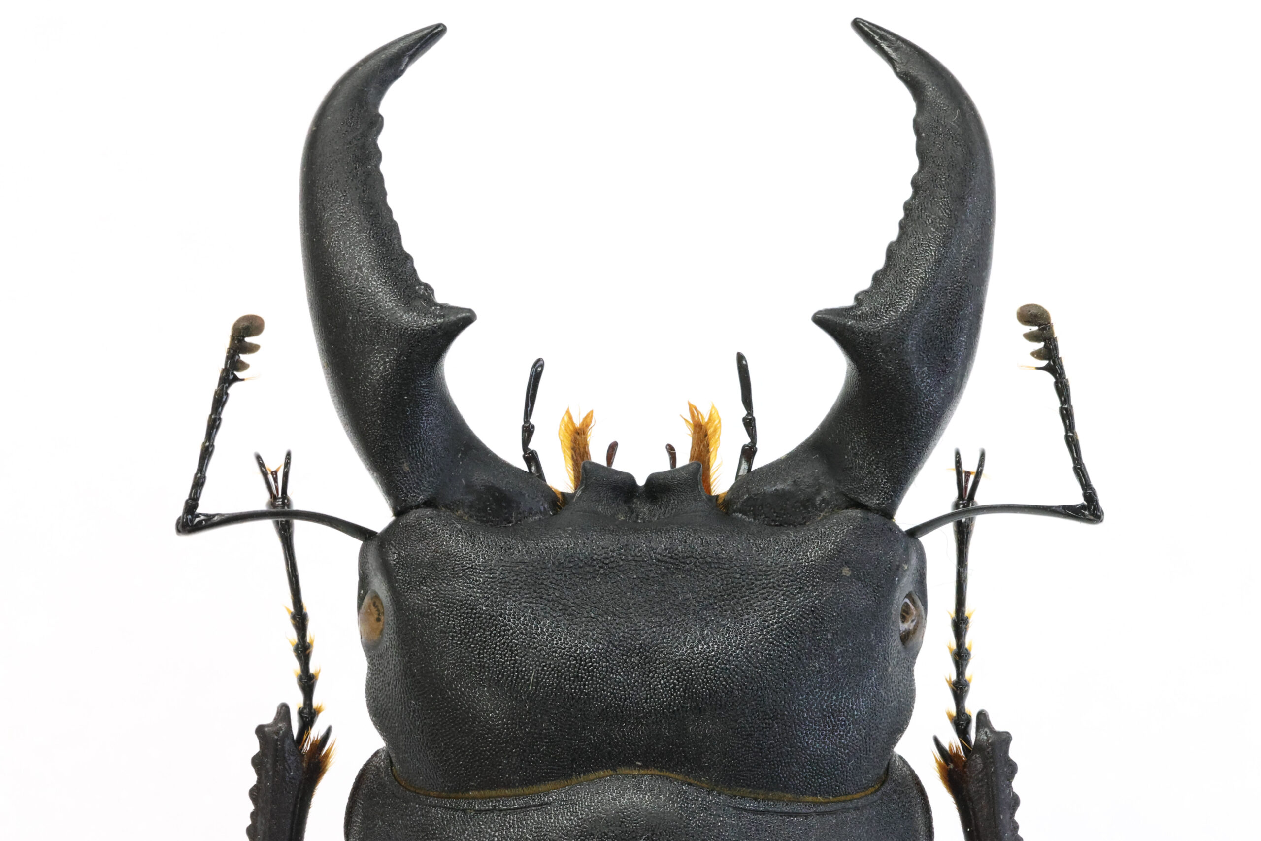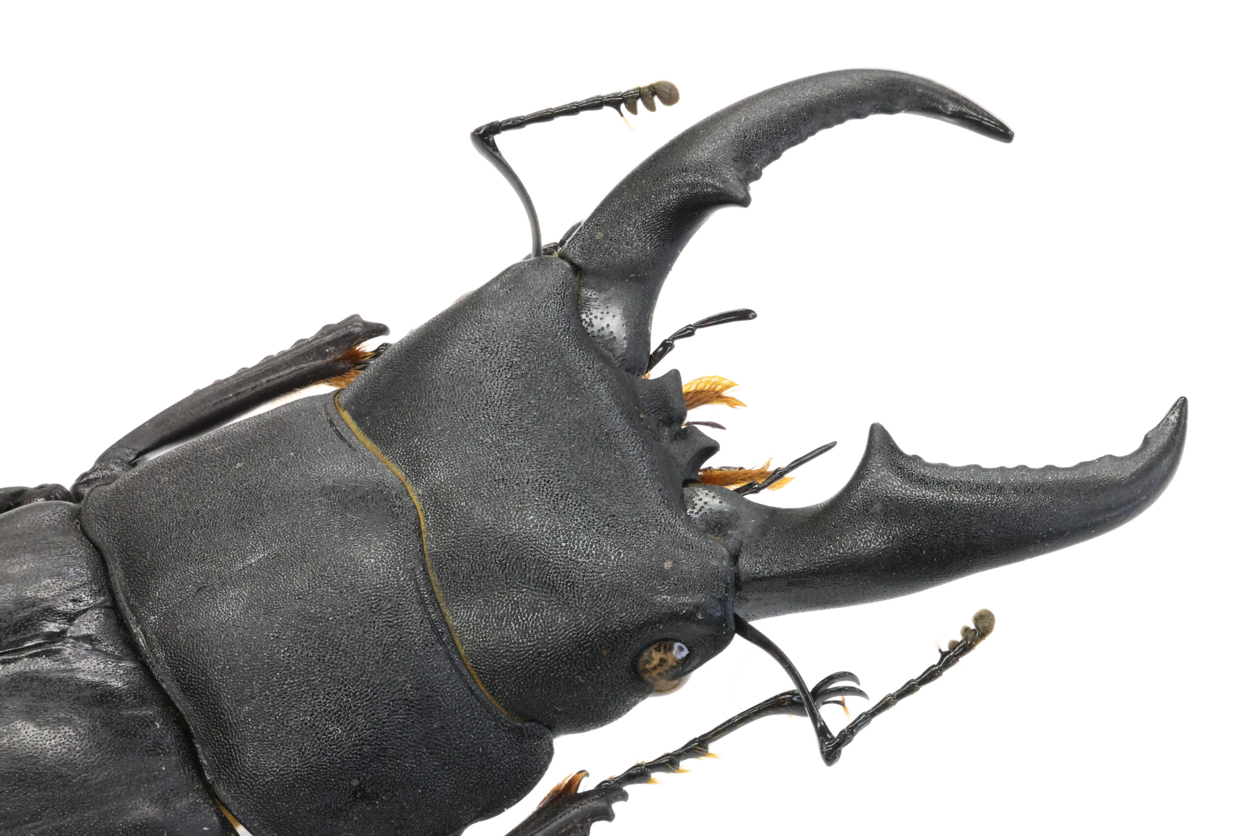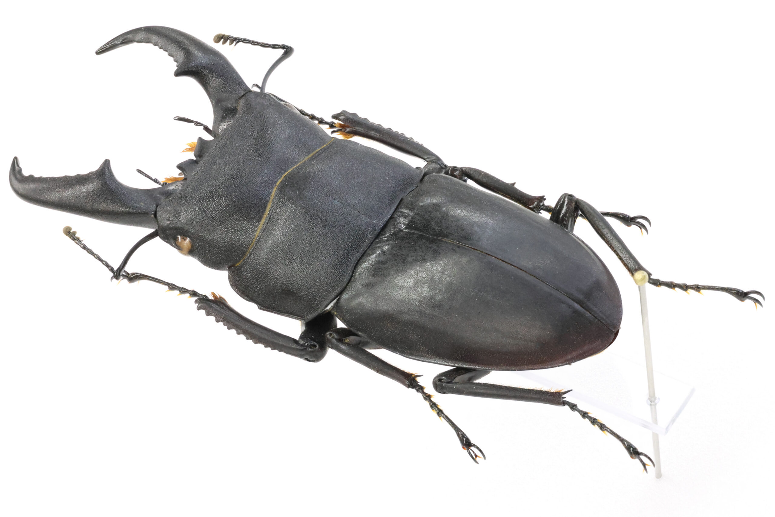 本個体を見て下さい。大アゴの発達も良く、太さもあって魅力的な個体です。艶消しはヒラタクワガタの大型個体の特徴です。チビ個体はピカピカですが、この個体を見て下さい。羽化してから少し長く生きていたように思います。上翅が擦れているため、さらに艶消し感が出ています。惚れ惚れするフォルムです。