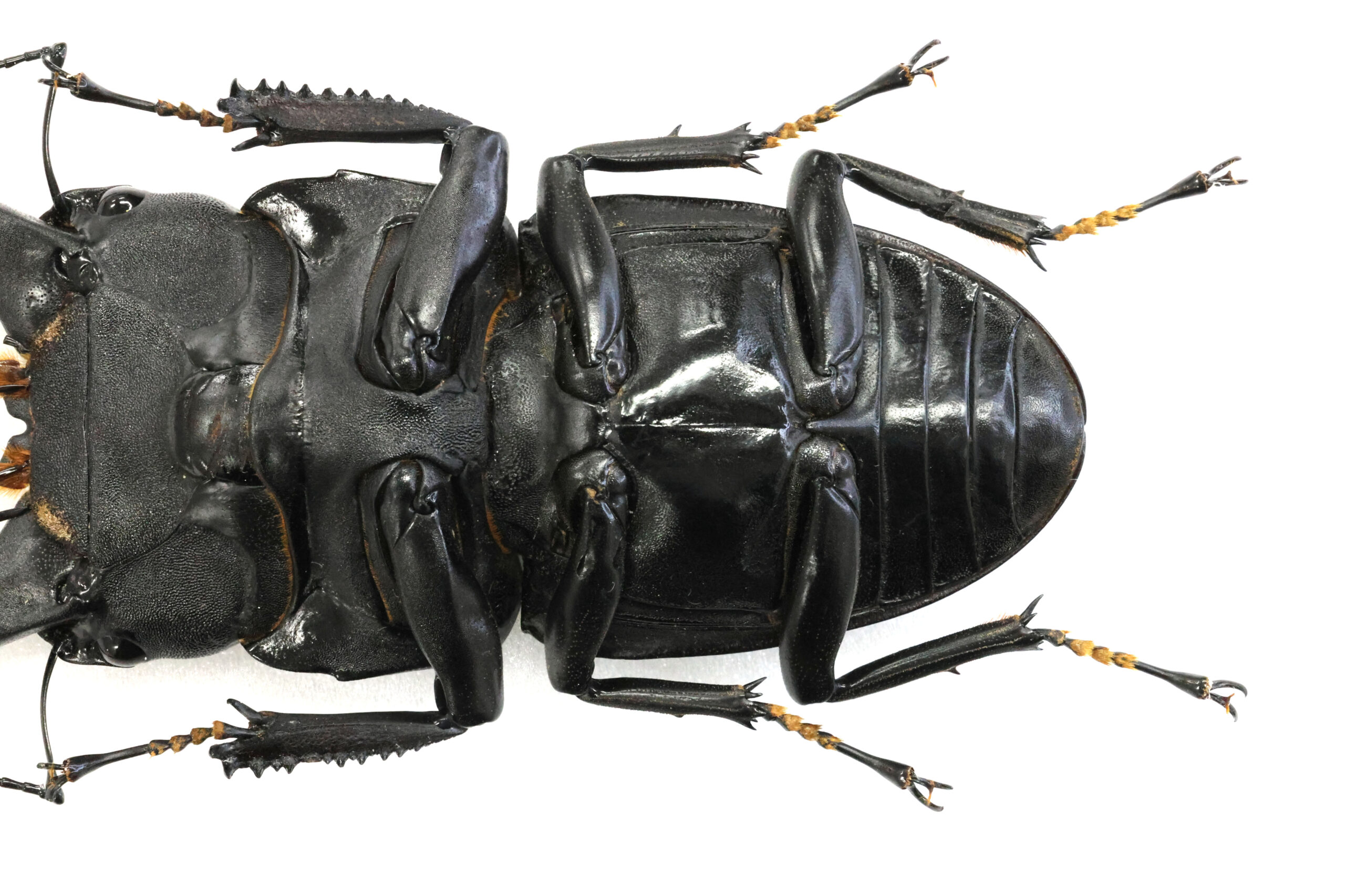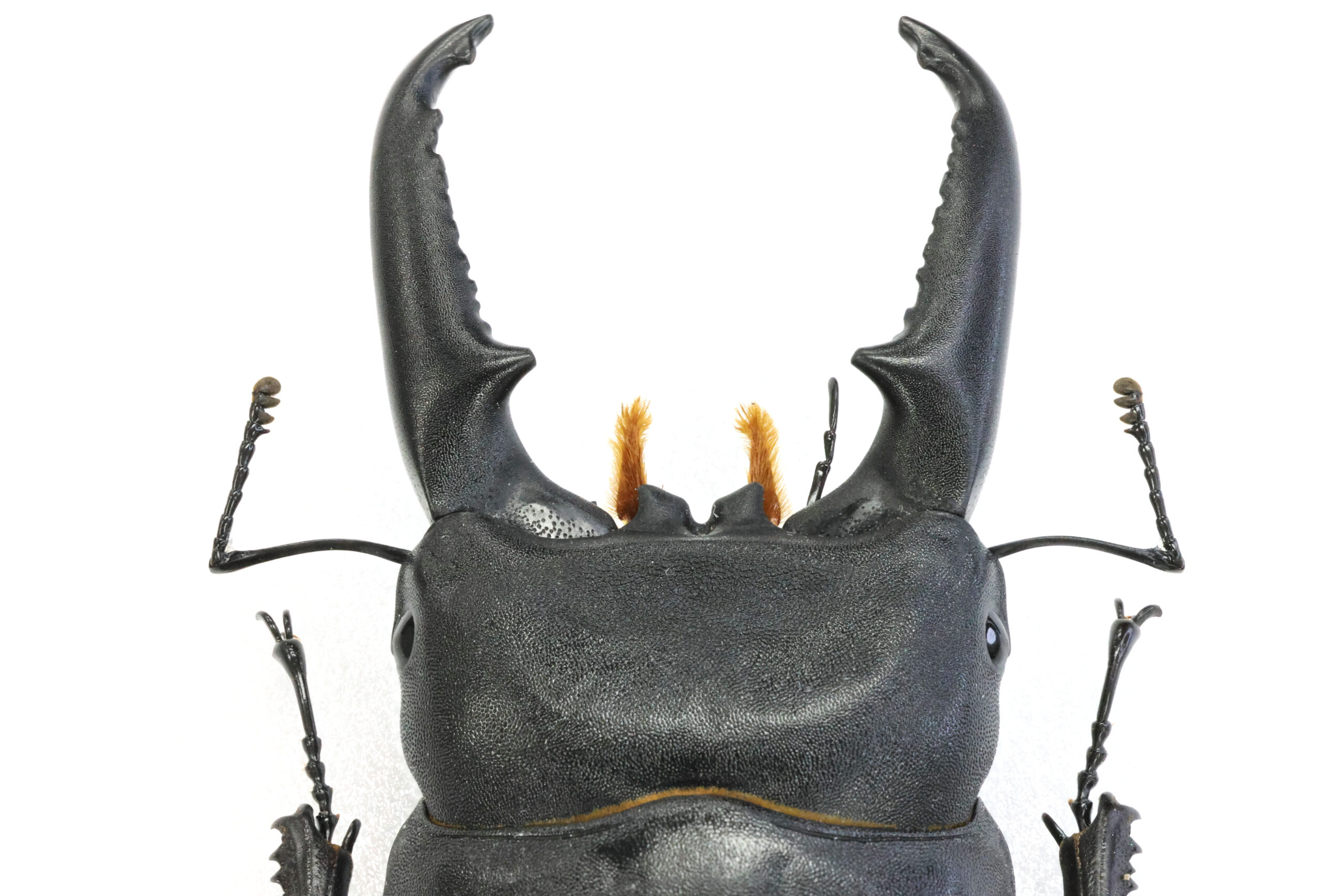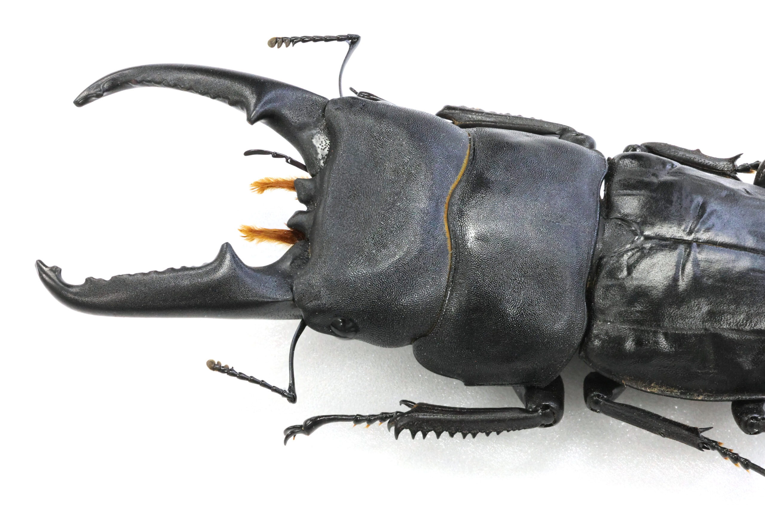 頭部と前胸背板を眺めていると、世界最大クラスのアルキデスヒラタクワガタDorcus alcides(スマトラ島特産種)にも見えてきます。対馬、壱岐、五島のヒラタクワガタたちは大アゴが長いためスラっとした印象があります。しかし、この個体はアゴが少し短めで驚くほど横幅があります。こんなのが樹液周りにとまっていたら、絶対興奮すると思います。対馬、壱岐、五島の3島のヒラタクワガタを比較すると、対馬、五島は大アゴが長いタイプが非常に多い。しかし壱岐は長歯タイプと本土亜種のような少し大アゴが短いヒラタクワガタが混ざります。本個体は、まさにその本土タイプ寄りです。いや…アルキデス寄りです。人間に例えますと、ベンチプレス200キロくらい上げそうなマッチョな男子です。