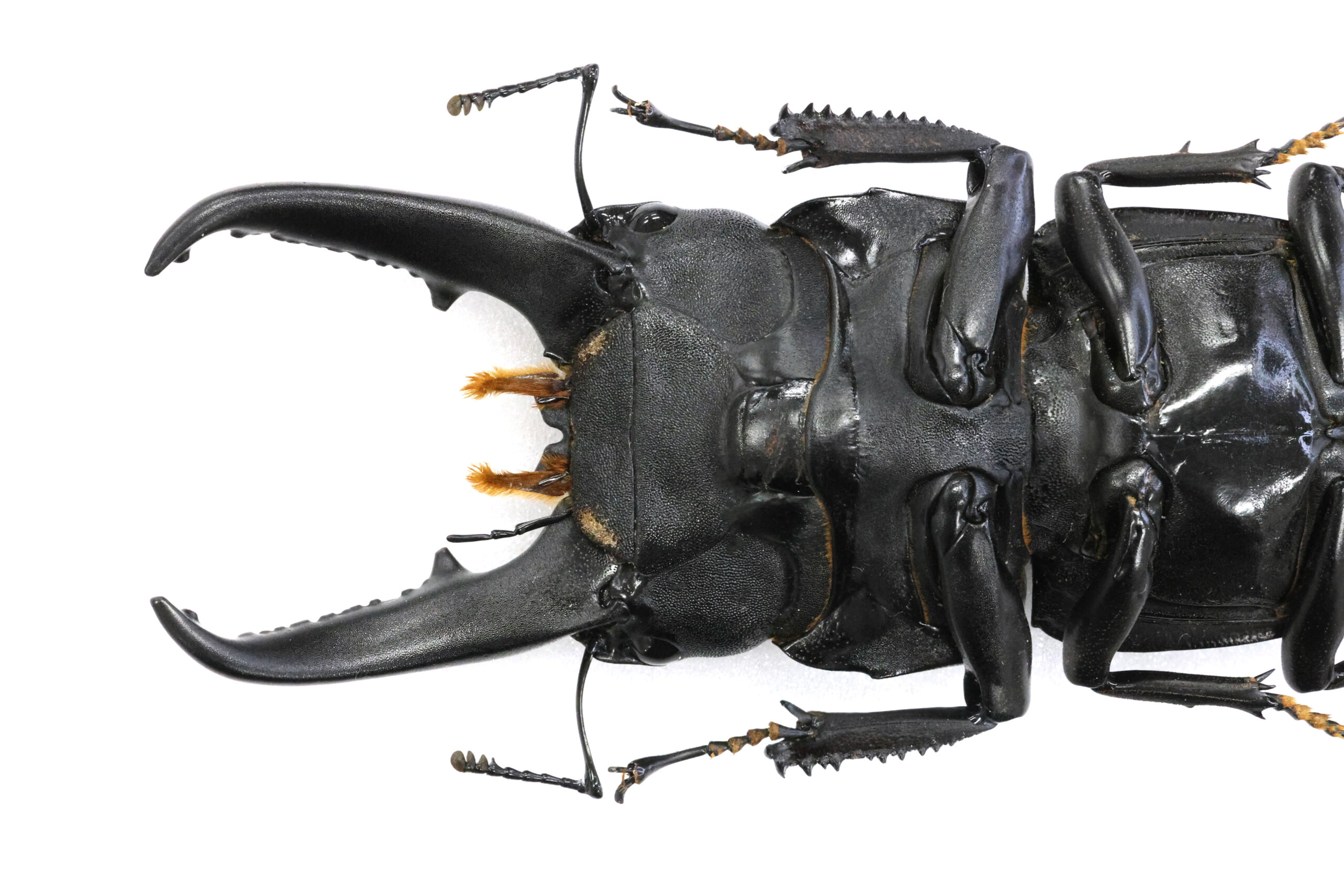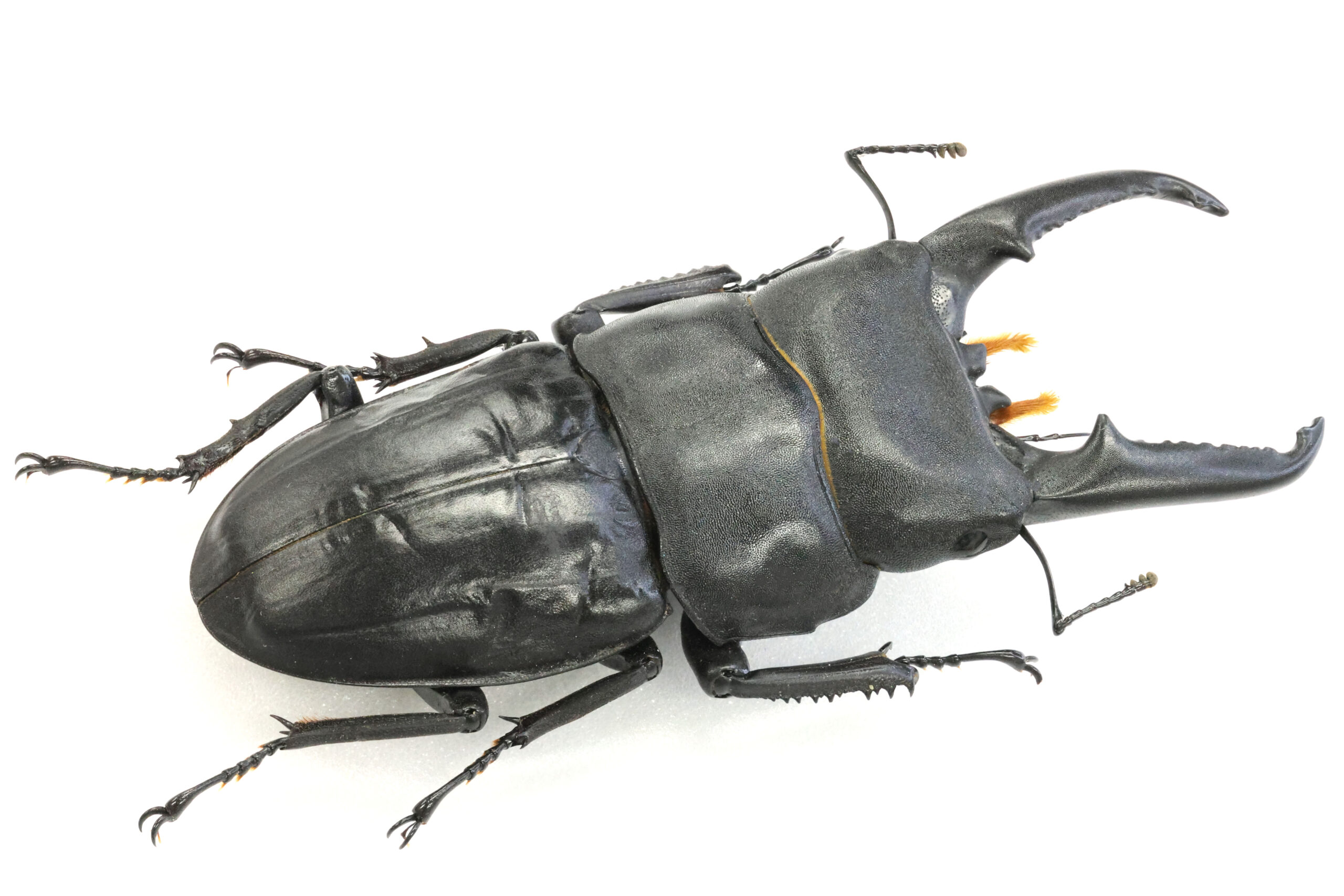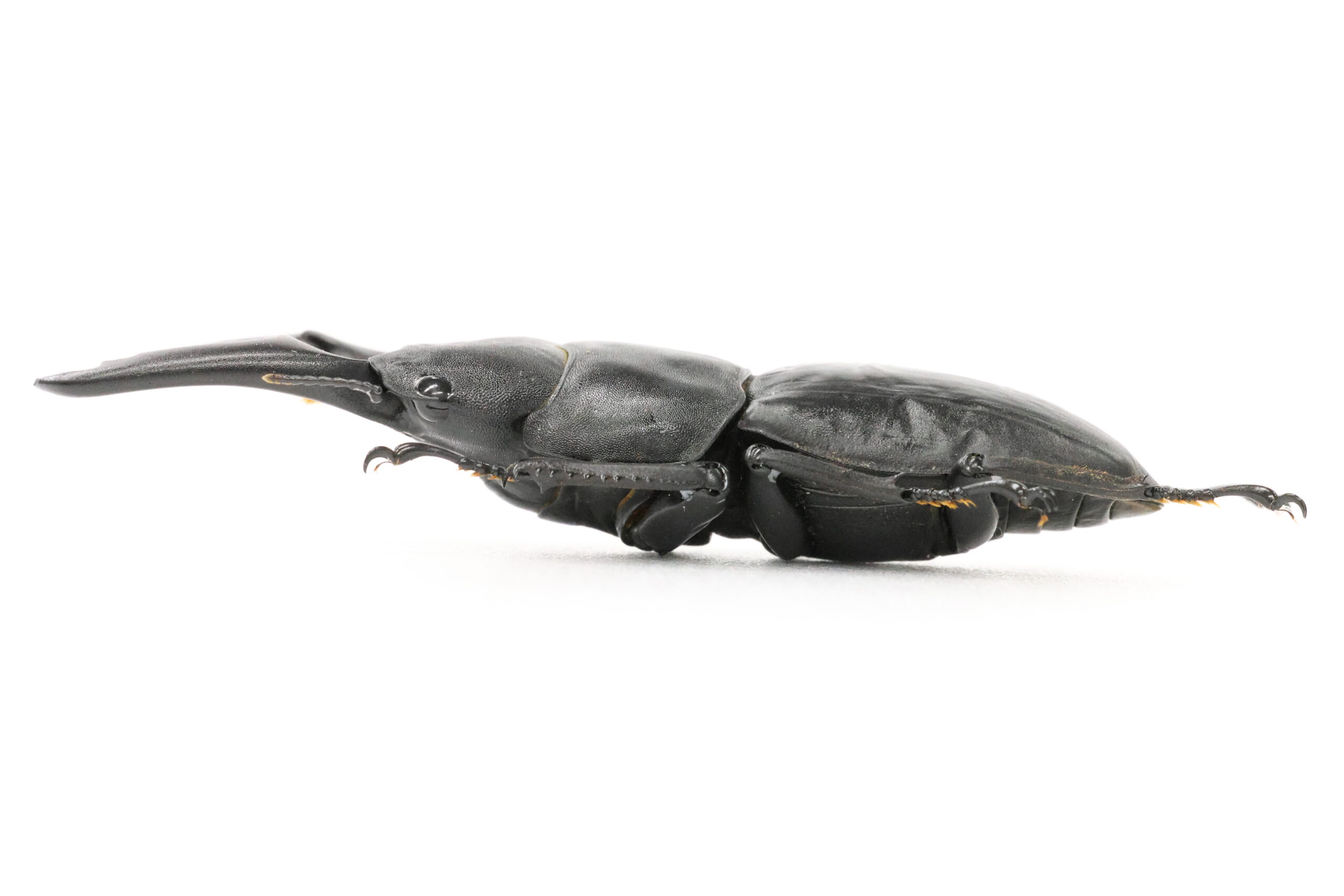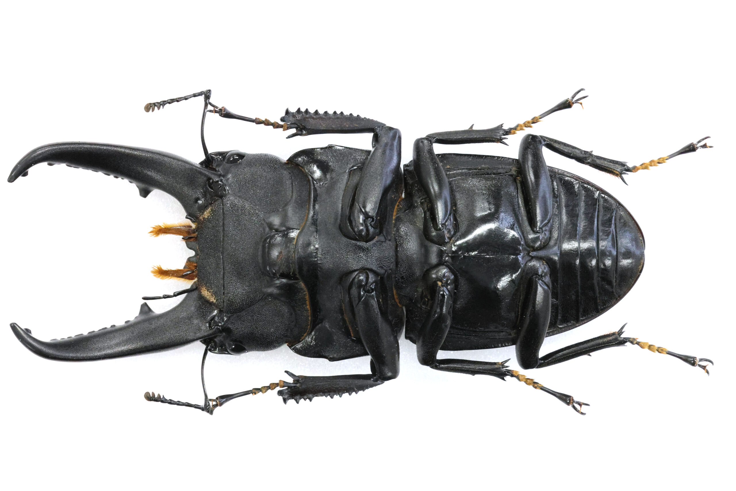 頭部と前胸背板を眺めていると、世界最大クラスのアルキデスヒラタクワガタDorcus alcides(スマトラ島特産種)にも見えてきます。対馬、壱岐、五島のヒラタクワガタたちは大アゴが長いためスラっとした印象があります。しかし、この個体はアゴが少し短めで驚くほど横幅があります。こんなのが樹液周りにとまっていたら、絶対興奮すると思います。対馬、壱岐、五島の3島のヒラタクワガタを比較すると、対馬、五島は大アゴが長いタイプが非常に多い。しかし壱岐は長歯タイプと本土亜種のような少し大アゴが短いヒラタクワガタが混ざります。本個体は、まさにその本土タイプ寄りです。いや…アルキデス寄りです。人間に例えますと、ベンチプレス200キロくらい上げそうなマッチョな男子です。