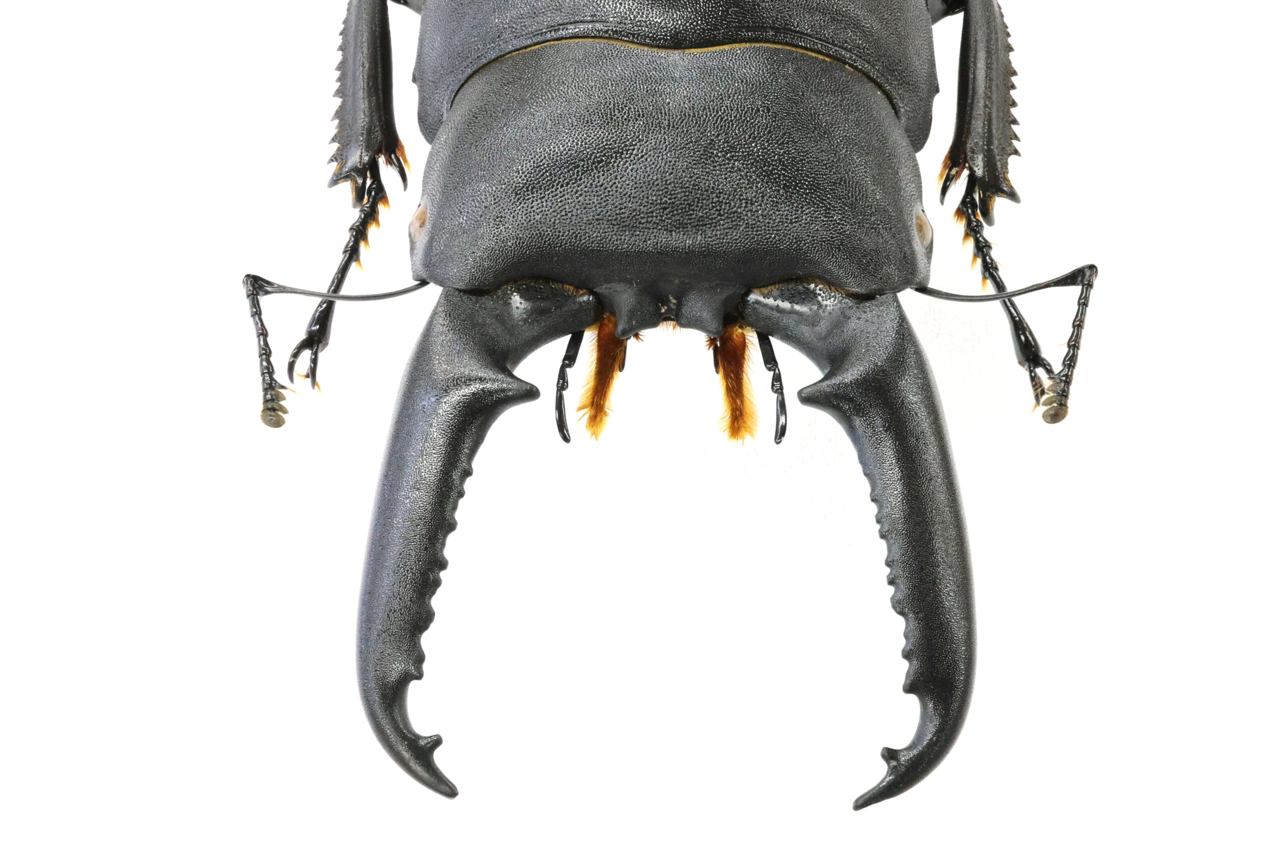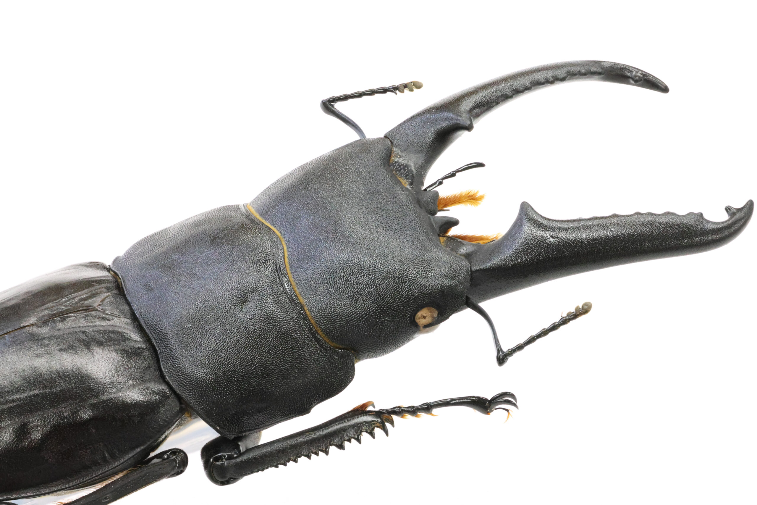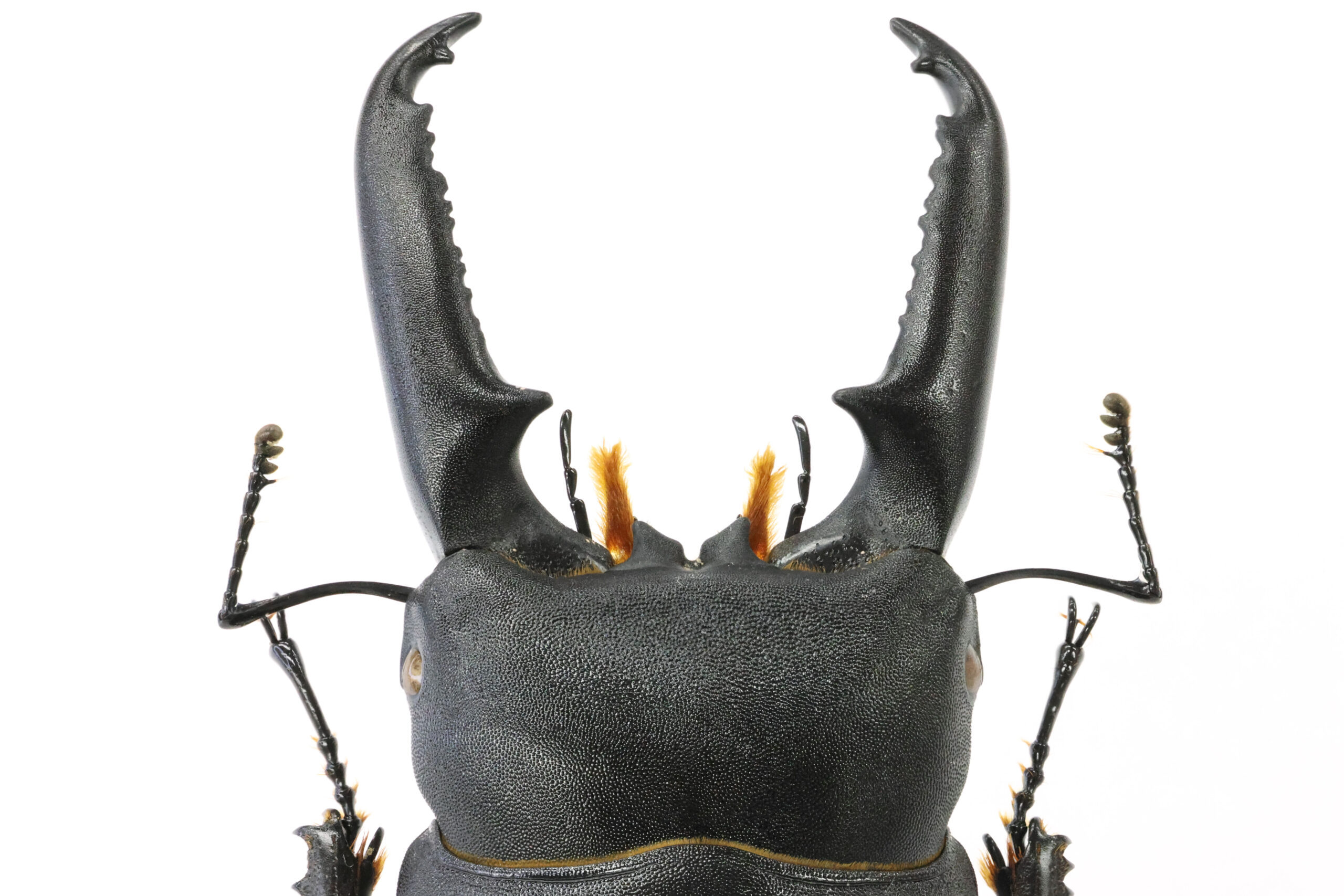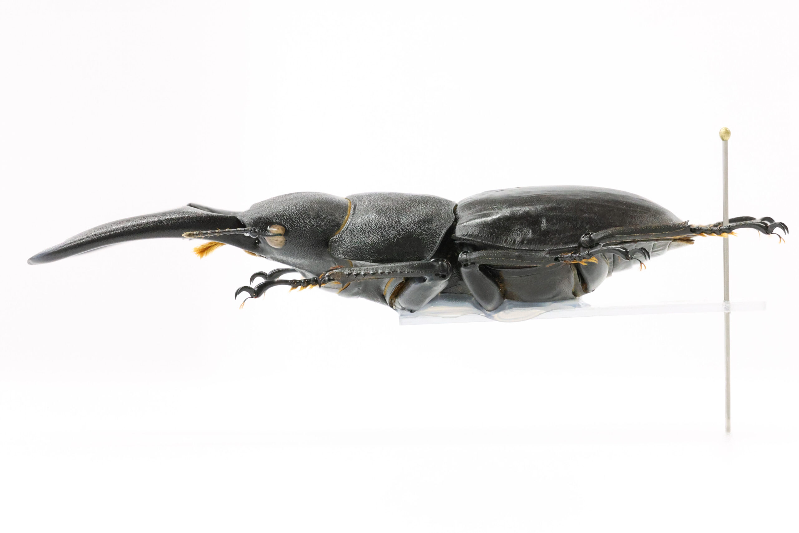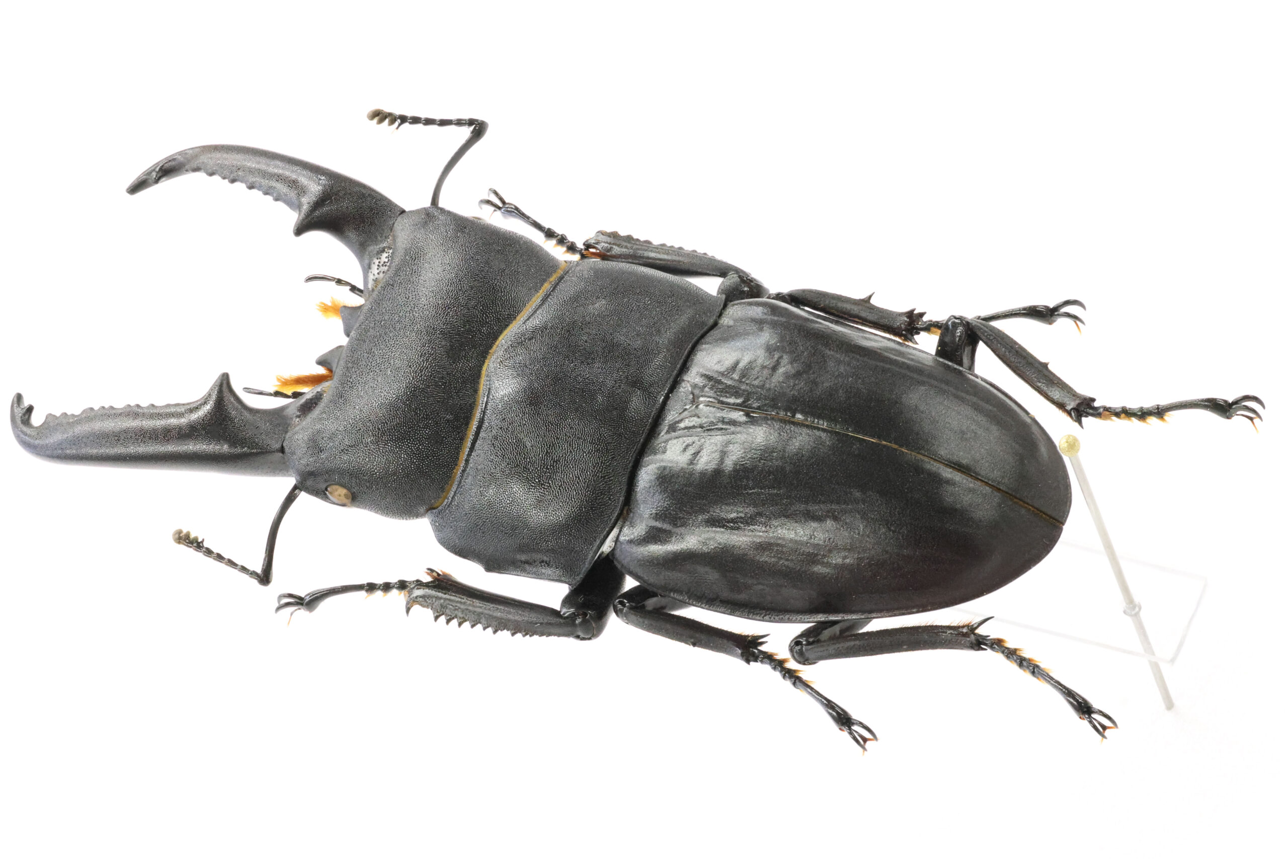 これは2022年に鮎川さんが採集された最大のイキヒラタクワガタです。23日に見つけて洞から引っ張り出そうと頑張ったのですが逃げられ、翌日にトライして見事、採集できたそうです。ぴったり78ミリあります。ヒラタクワガタは気性が荒く好戦的な種類です。どこかが欠けたり、折れていたり、傷を持つ個体が多いのですが、この個体は大アゴの摩耗も少なく完全体でございます。活動を始めて間もない個体と思われます。
