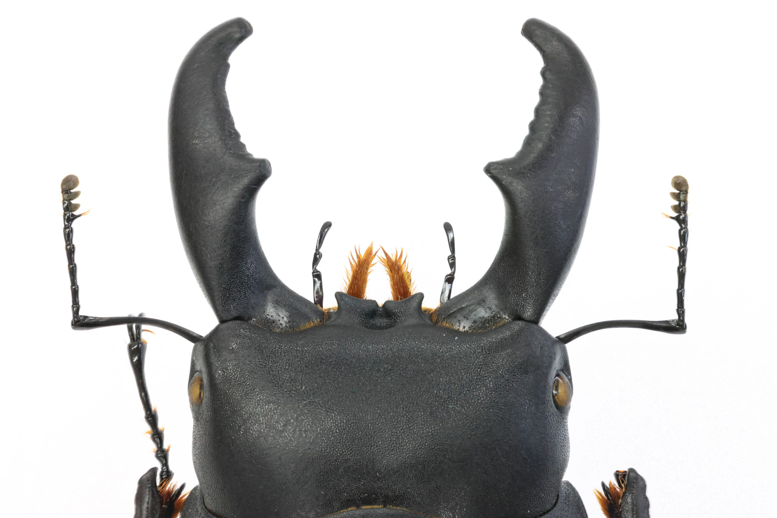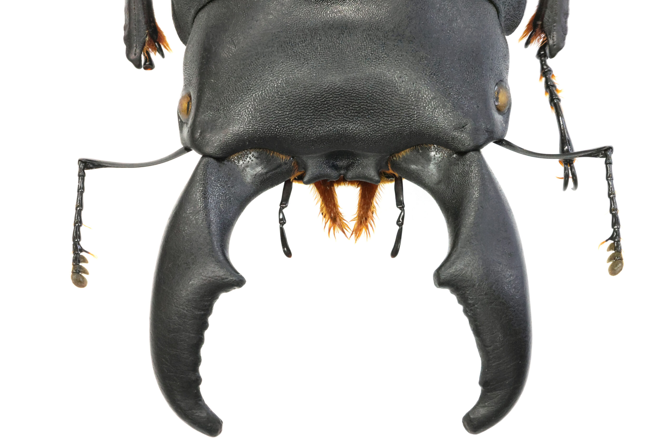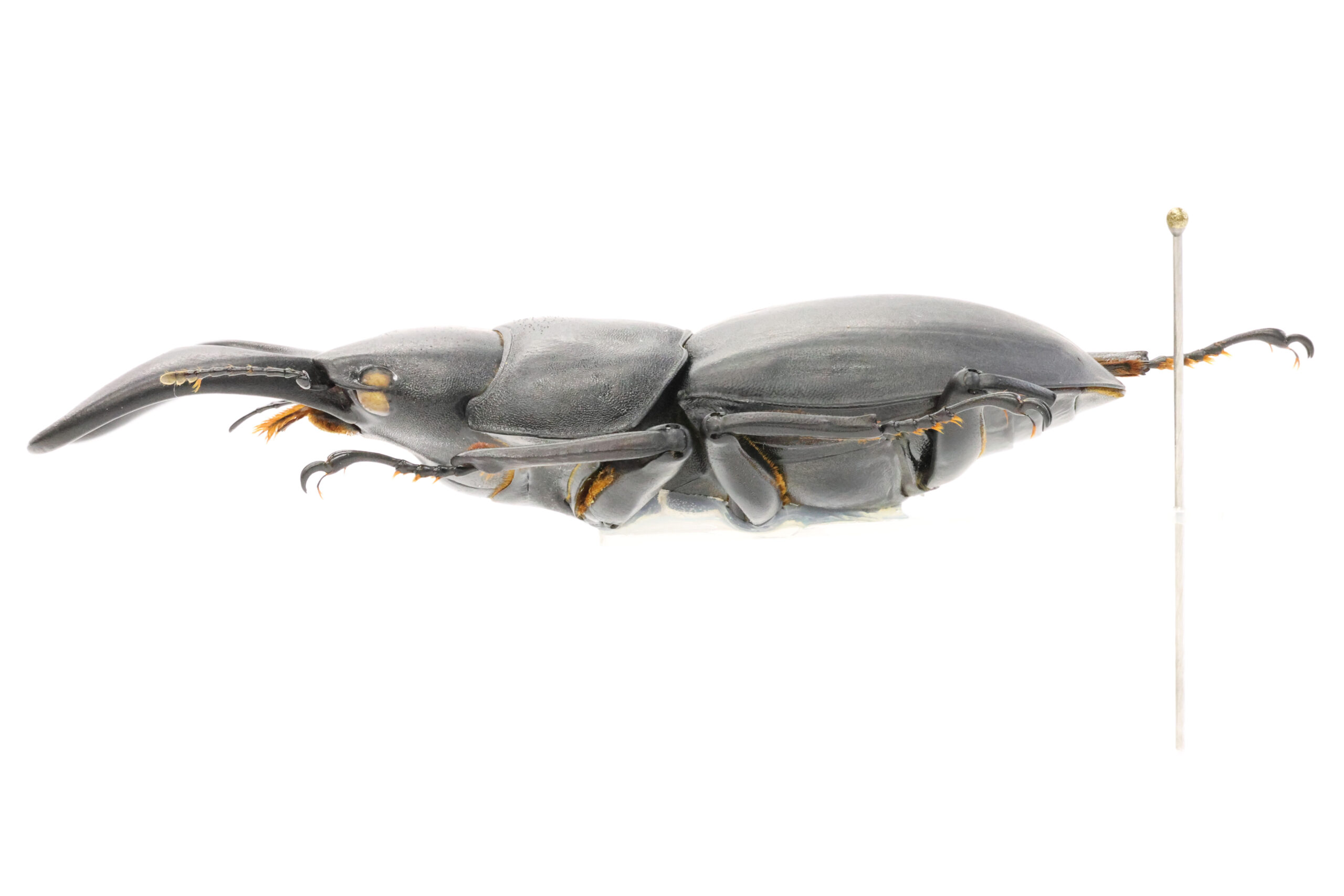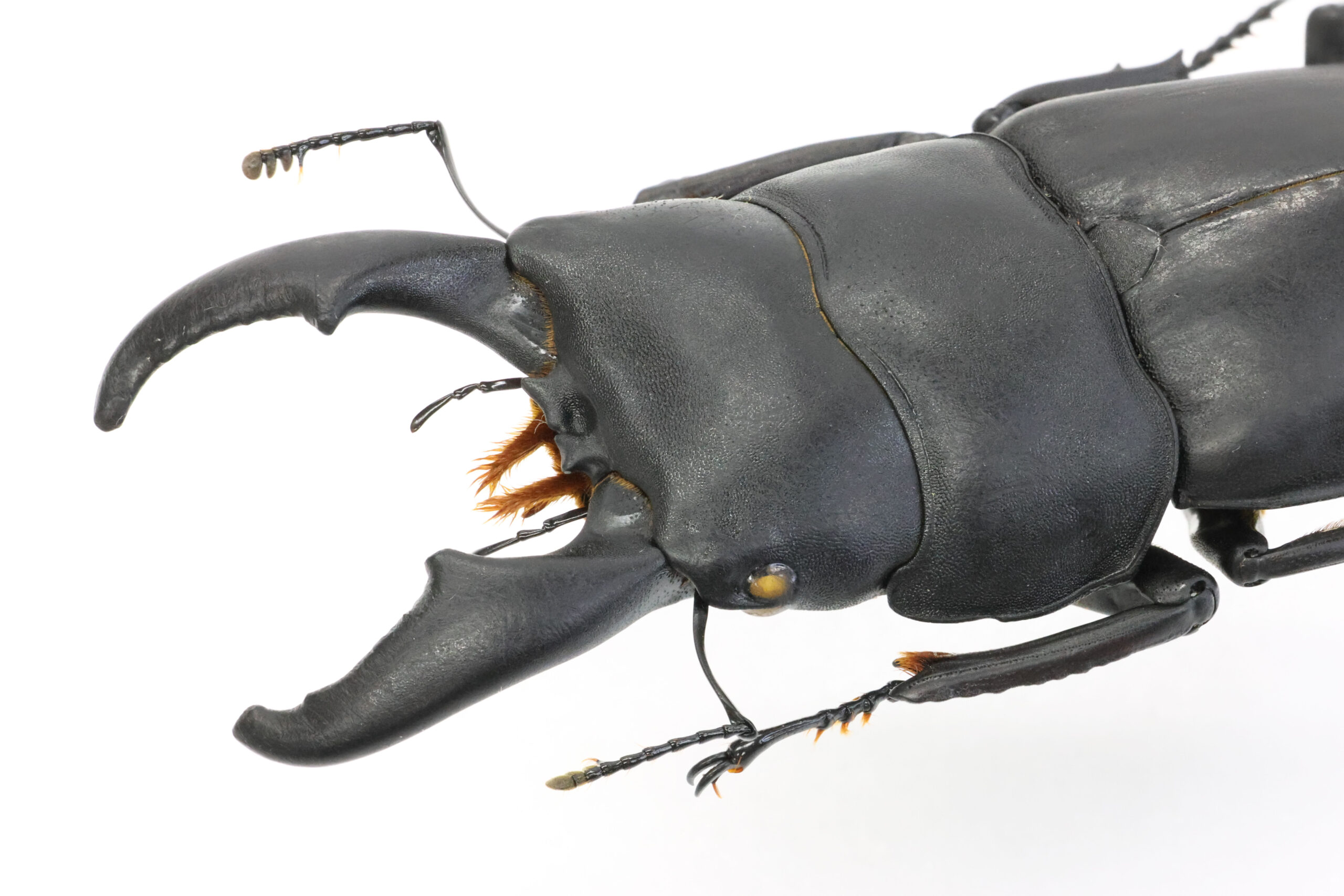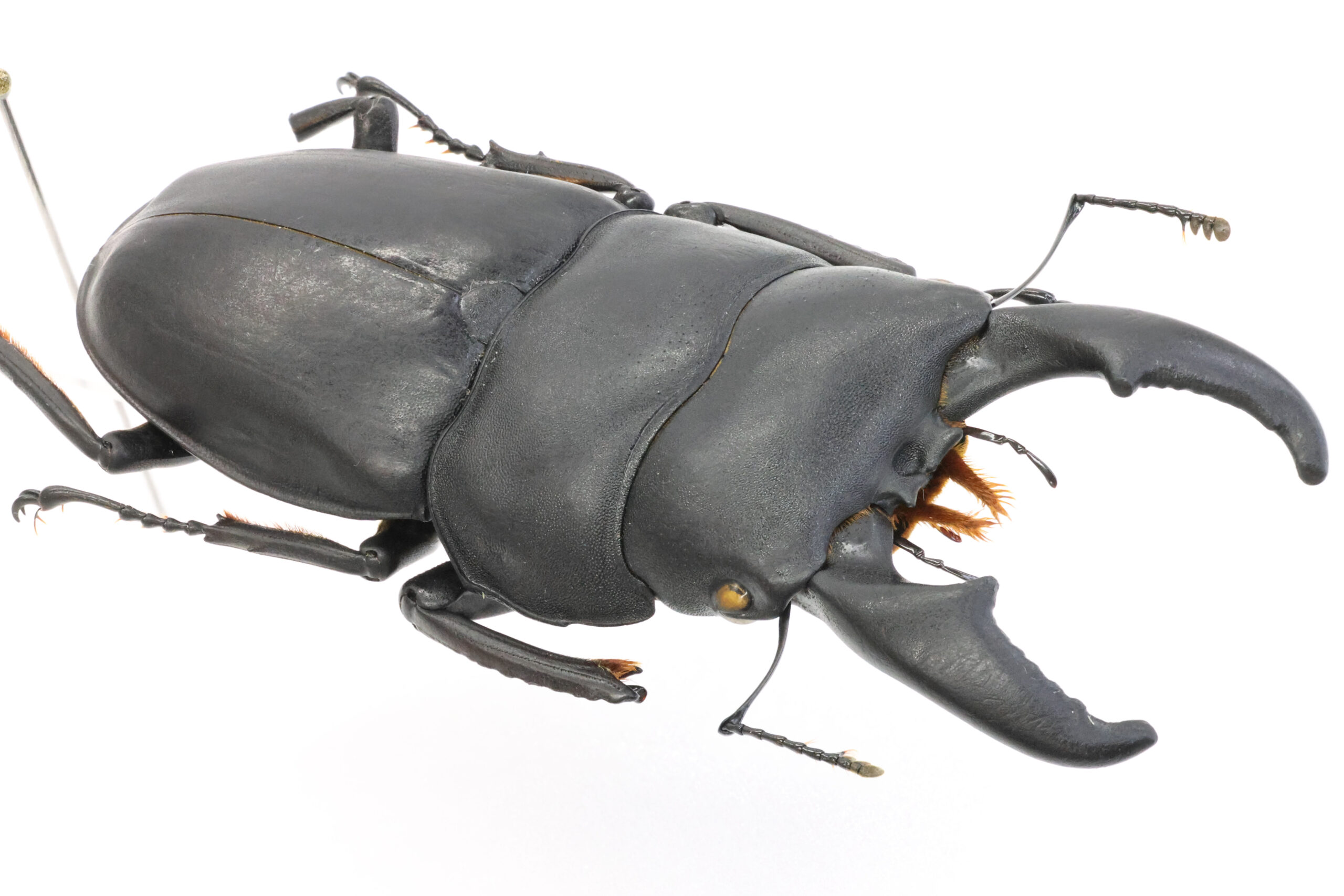 間違いなく成虫になってから2シーズン目に突入した超特大個体です。大アゴは摩耗して丸みを帯び、全体的研磨されて鈍い輝きを放っています。右前脚のフセツは無くなり、左後脚は途中から切れています。何かと戦って折り取られたのでしょうね。自身が築いたハーレムを守るために戦い抜いたのだと思われます。まさに西洋の甲冑を纏った歴戦の勇者です。格好良すぎてしびれますね。