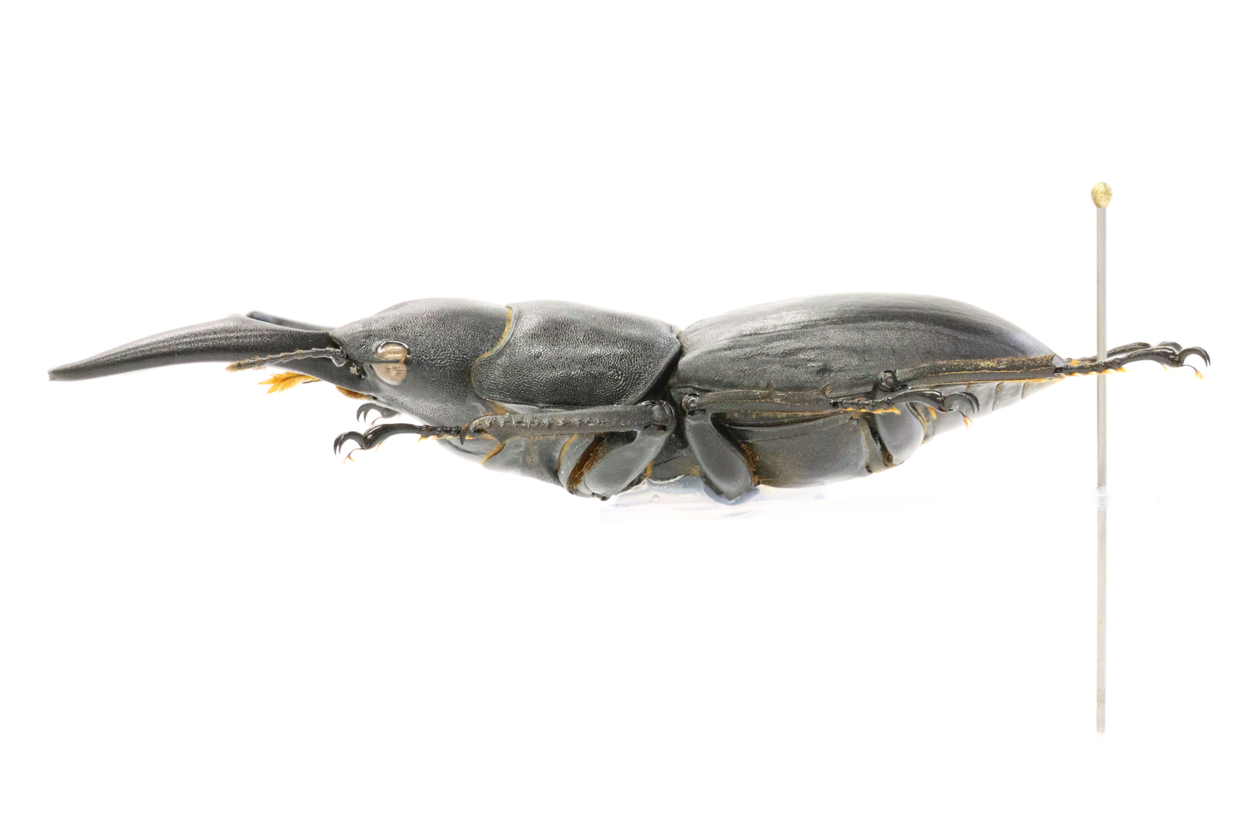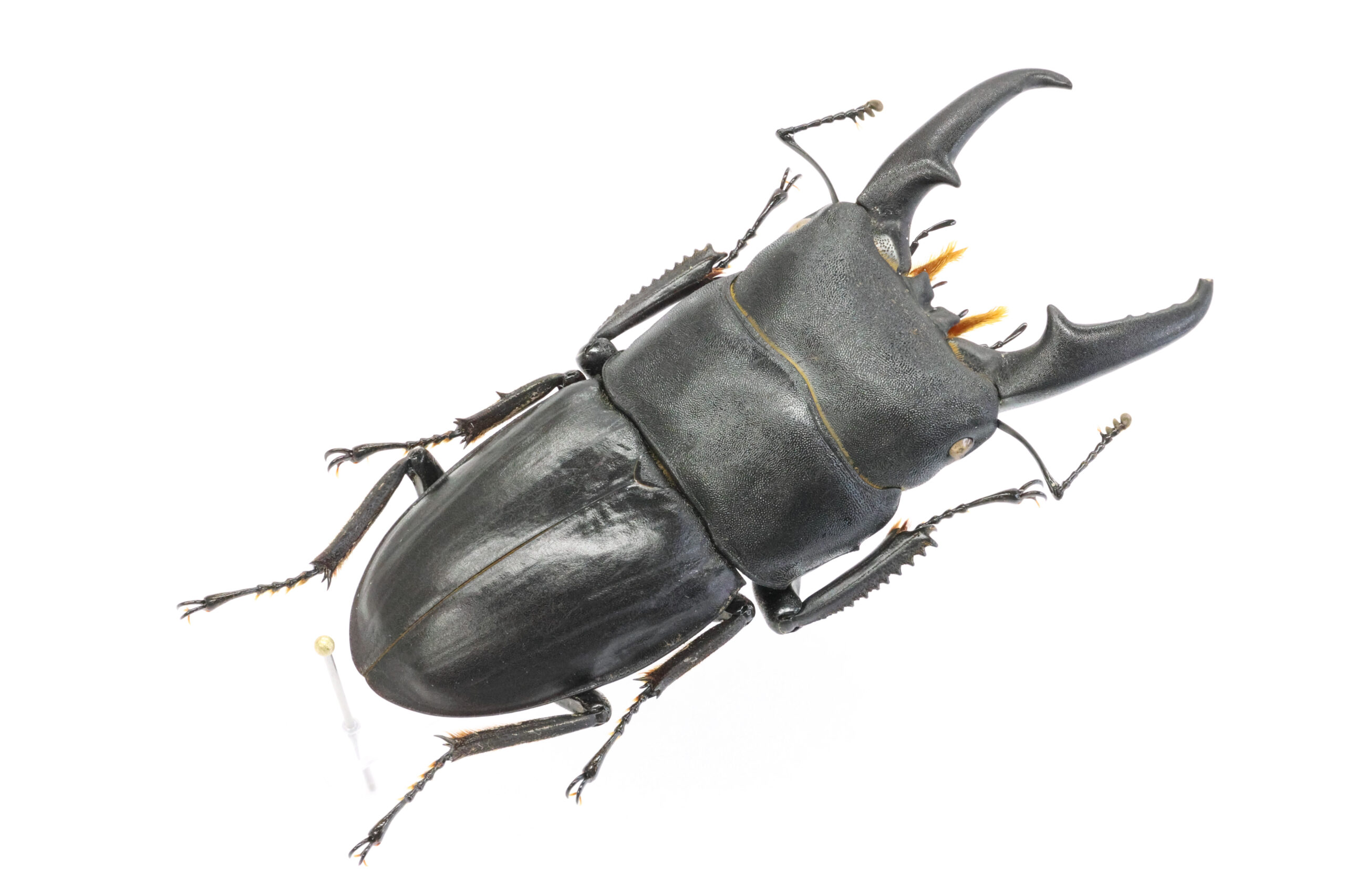 その国営公園が立地するさぬき市で採集されたのが、このヒラタクワガタです。太くて立派、アゴ先が欠けていなければ67ミリに届くほどの大きな個体です。全体的に体表が擦れている…昨年から生き抜いてきた個体だと思います。