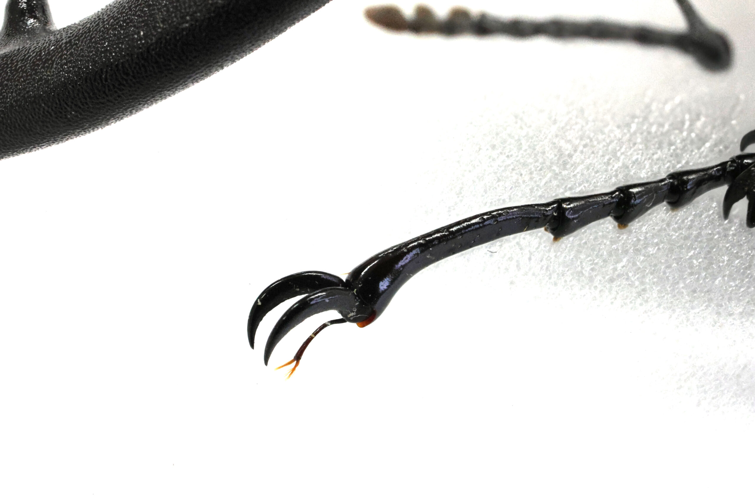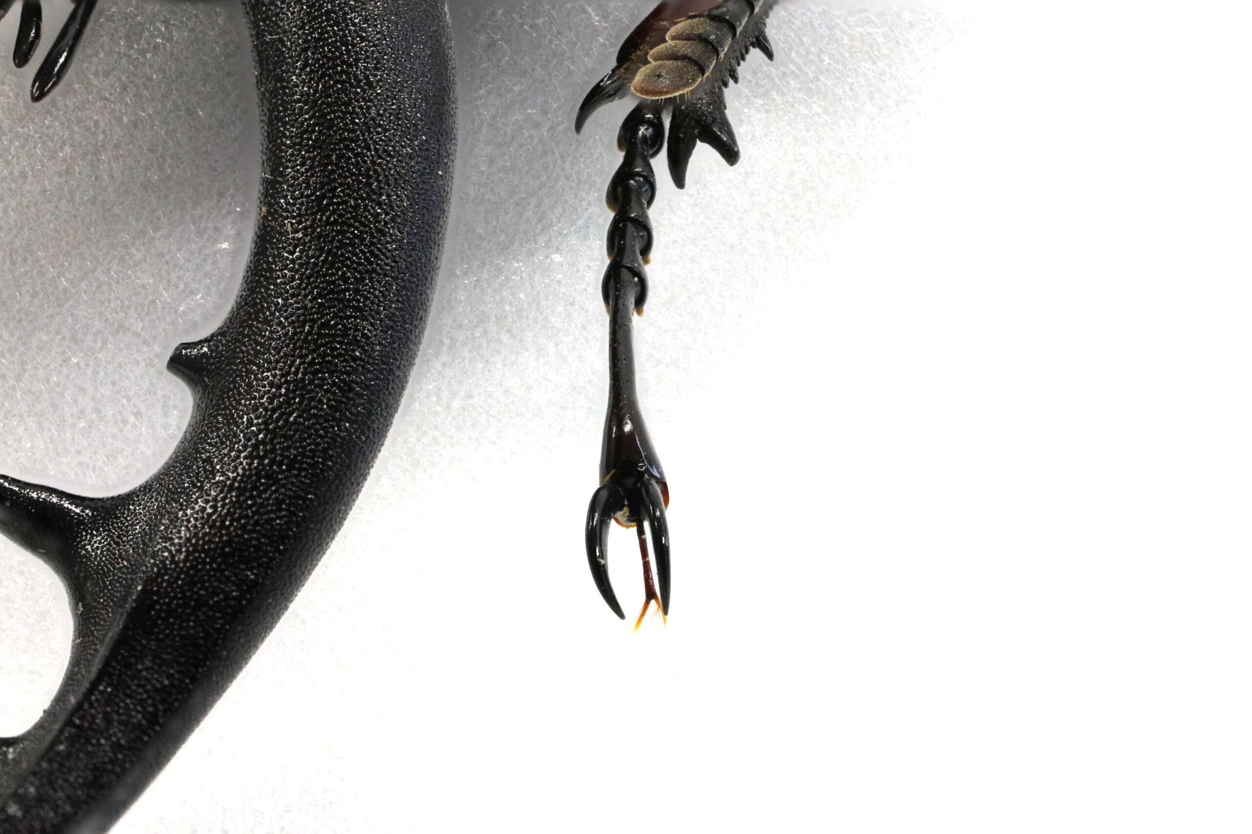 昆虫は爪の間に爪間盤(そうかんばん)または褥盤(じょくばん)と呼ばれる構造を持っています。標本をしっかり観察してみましょう。爪の間に細い小さな爪のようなものが見られますね。先端にある細かい微毛を介してクワガタたちは足(爪)先の細かい感覚を捉えているのです。この爪間盤(そうかんばん)は、繊細な構造であるため、途中で切れていたり、根元から無くなっていることが多いです。この個体はすべての爪間盤(そうかんばん)が揃っています。
