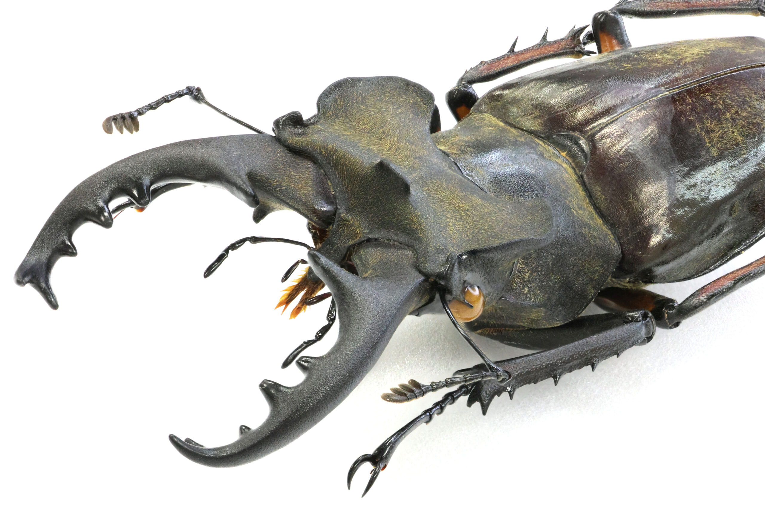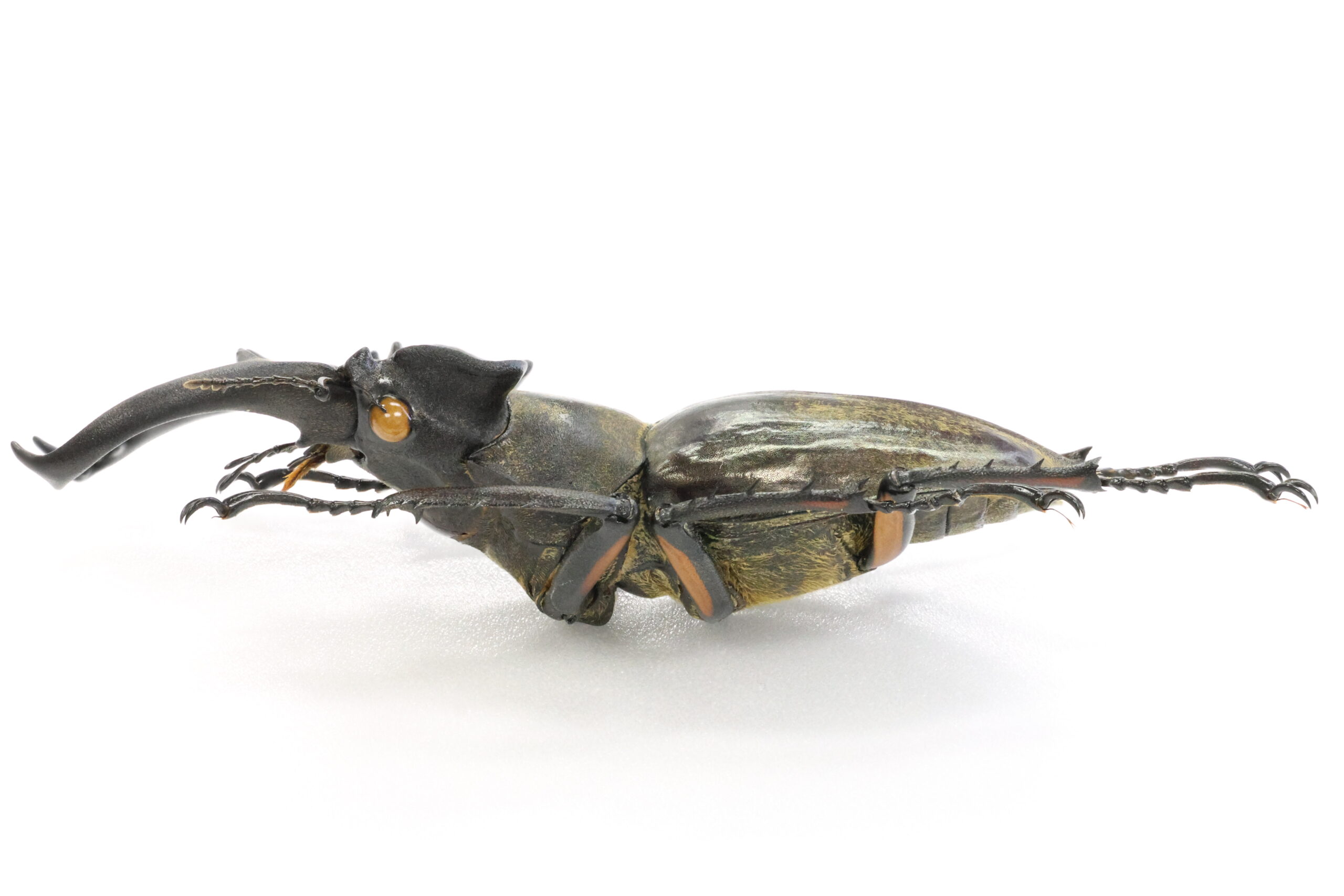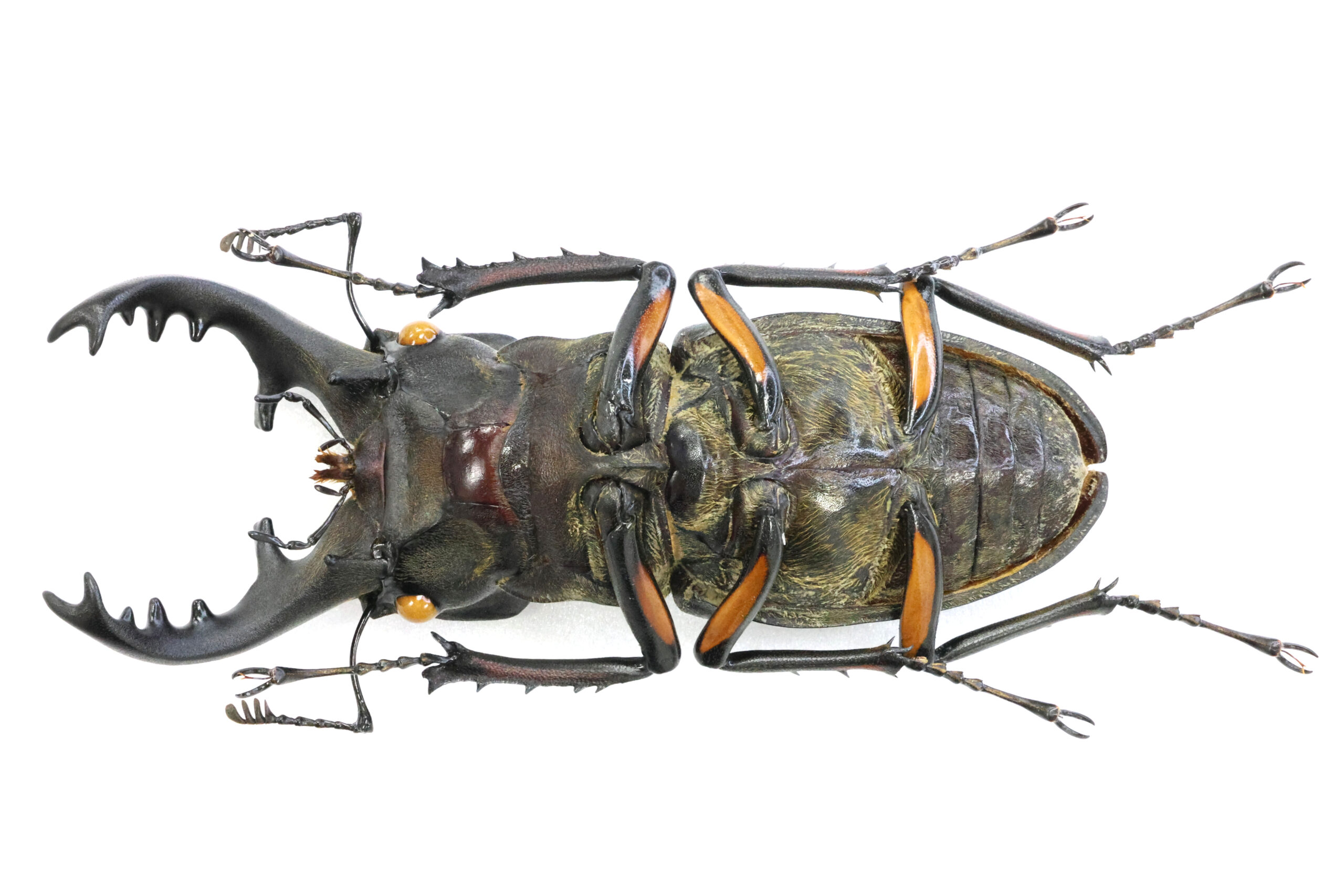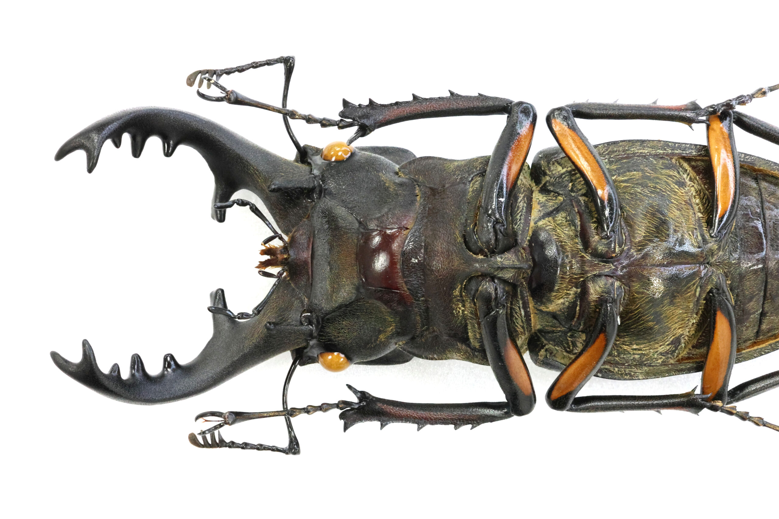 ミヤマクワガタは、他の日本産クワガタにない特徴をたくさん持っています。体を覆う金色の微毛(♂だけ)、脚の根元がオレンジ色、そして頭部の真ん中にドンと出っ張りがあります。この突起も何か意味があるのでしょうね。敵の攻撃をブロックするため??昔はもっと長かったとか!格好良いですね。