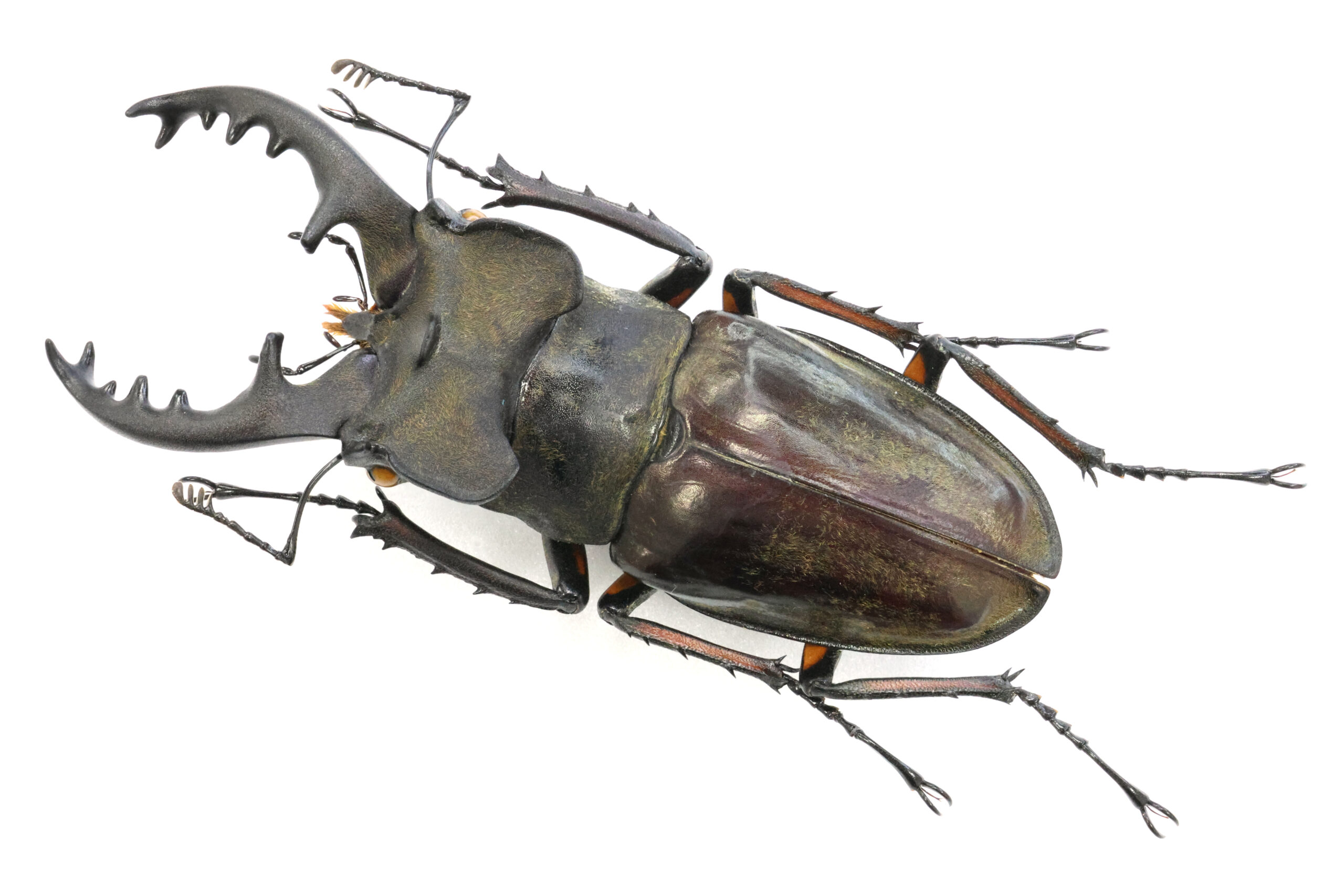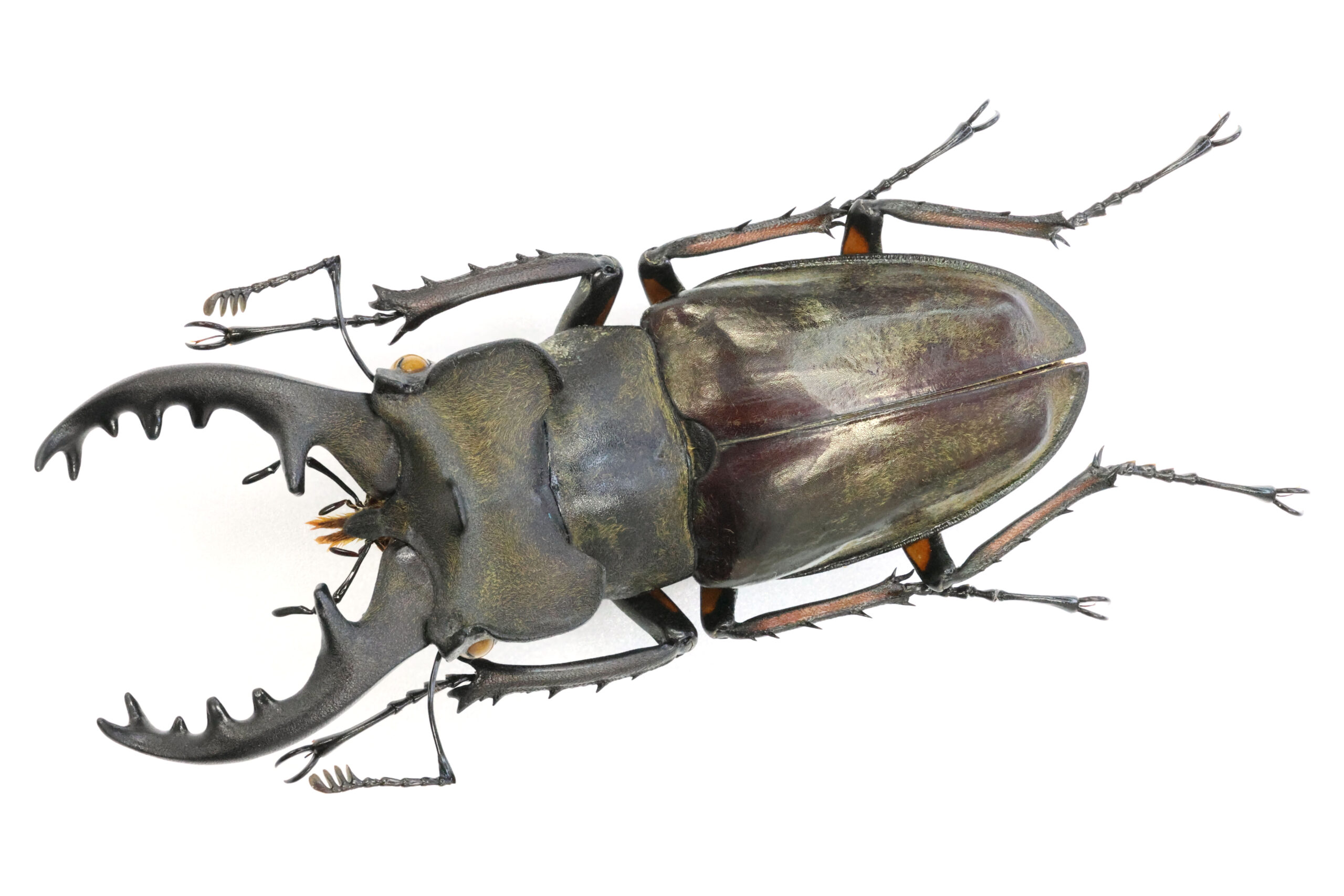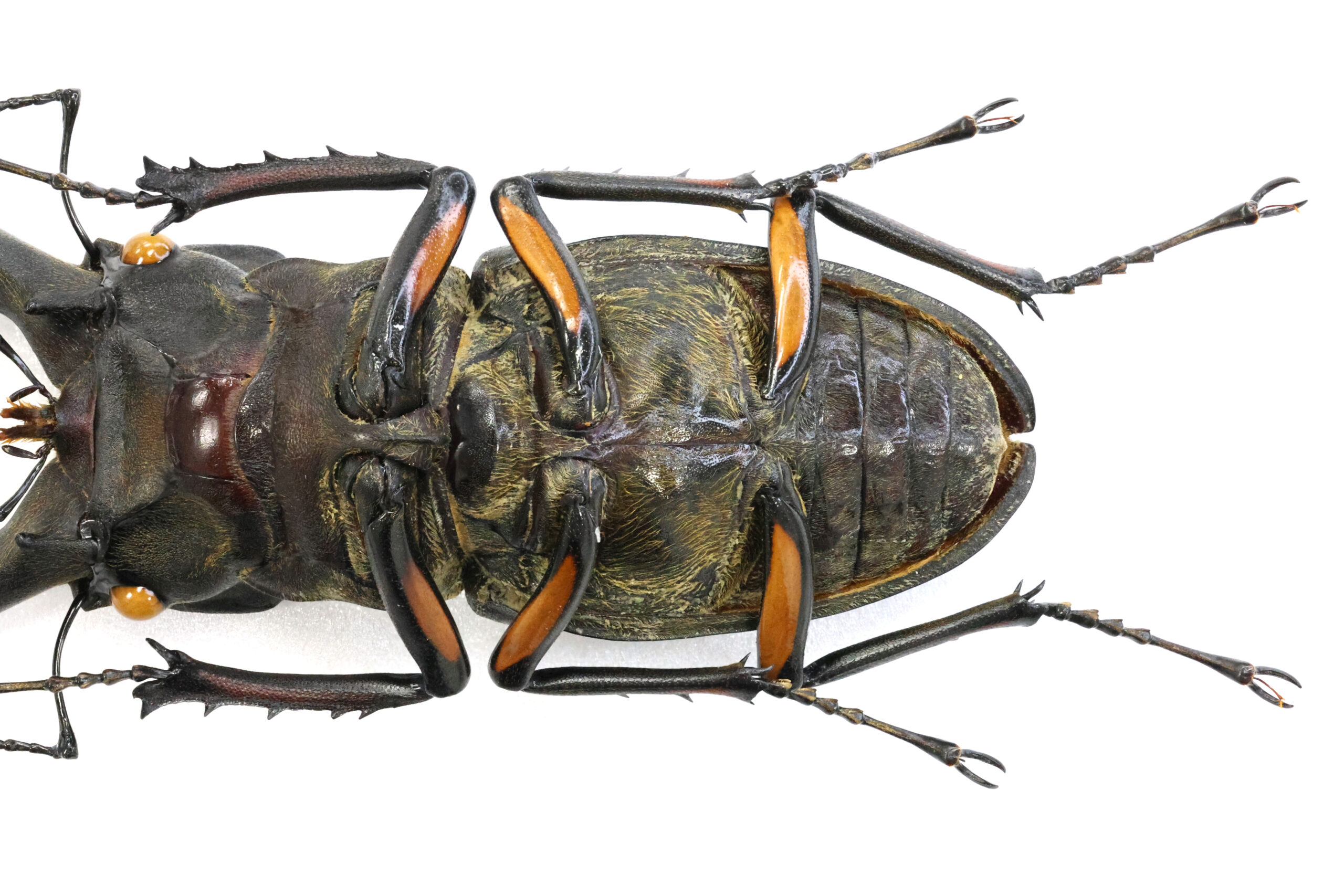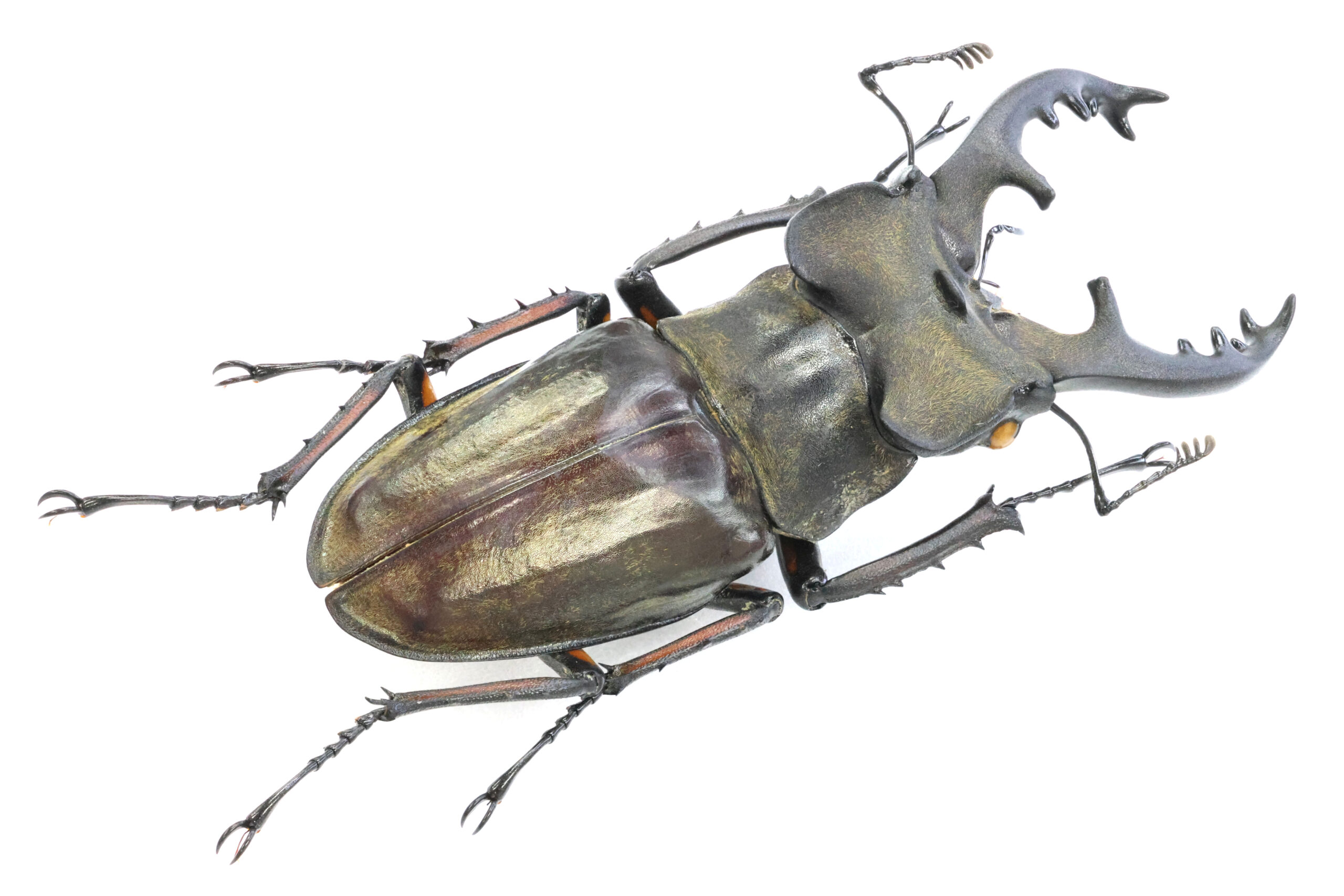 ミヤマクワガタは、他の日本産クワガタにない特徴をたくさん持っています。体を覆う金色の微毛(♂だけ)、脚の根元がオレンジ色、そして頭部の真ん中にドンと出っ張りがあります。この突起も何か意味があるのでしょうね。敵の攻撃をブロックするため??昔はもっと長かったとか!格好良いですね。