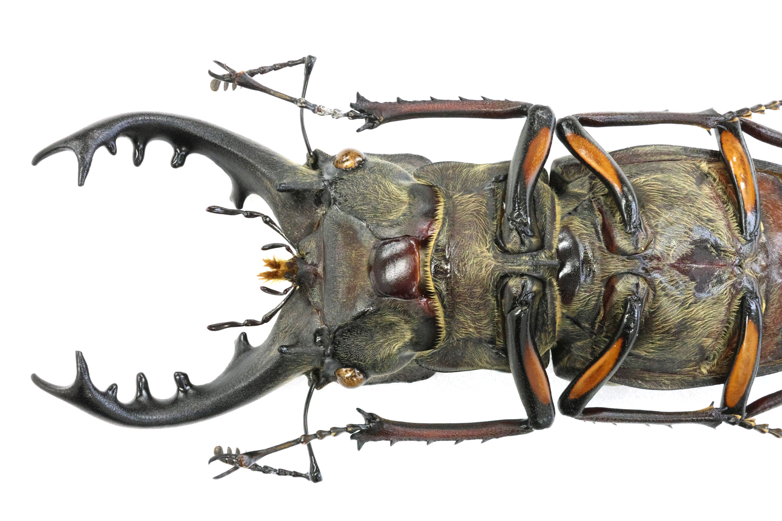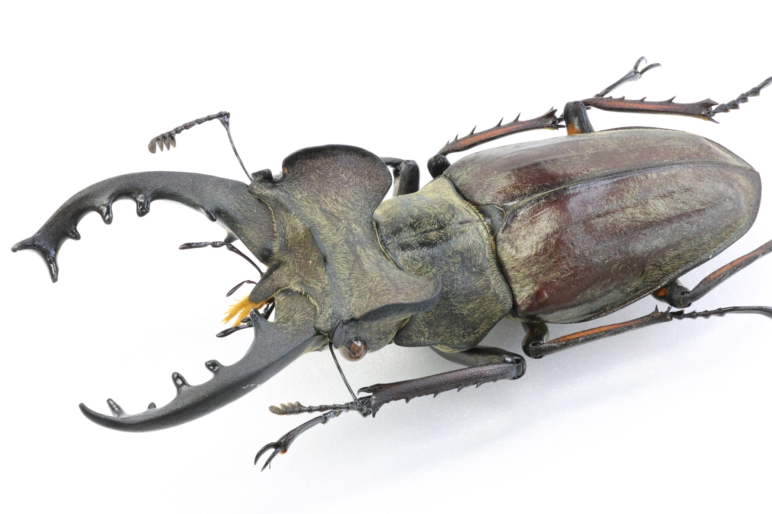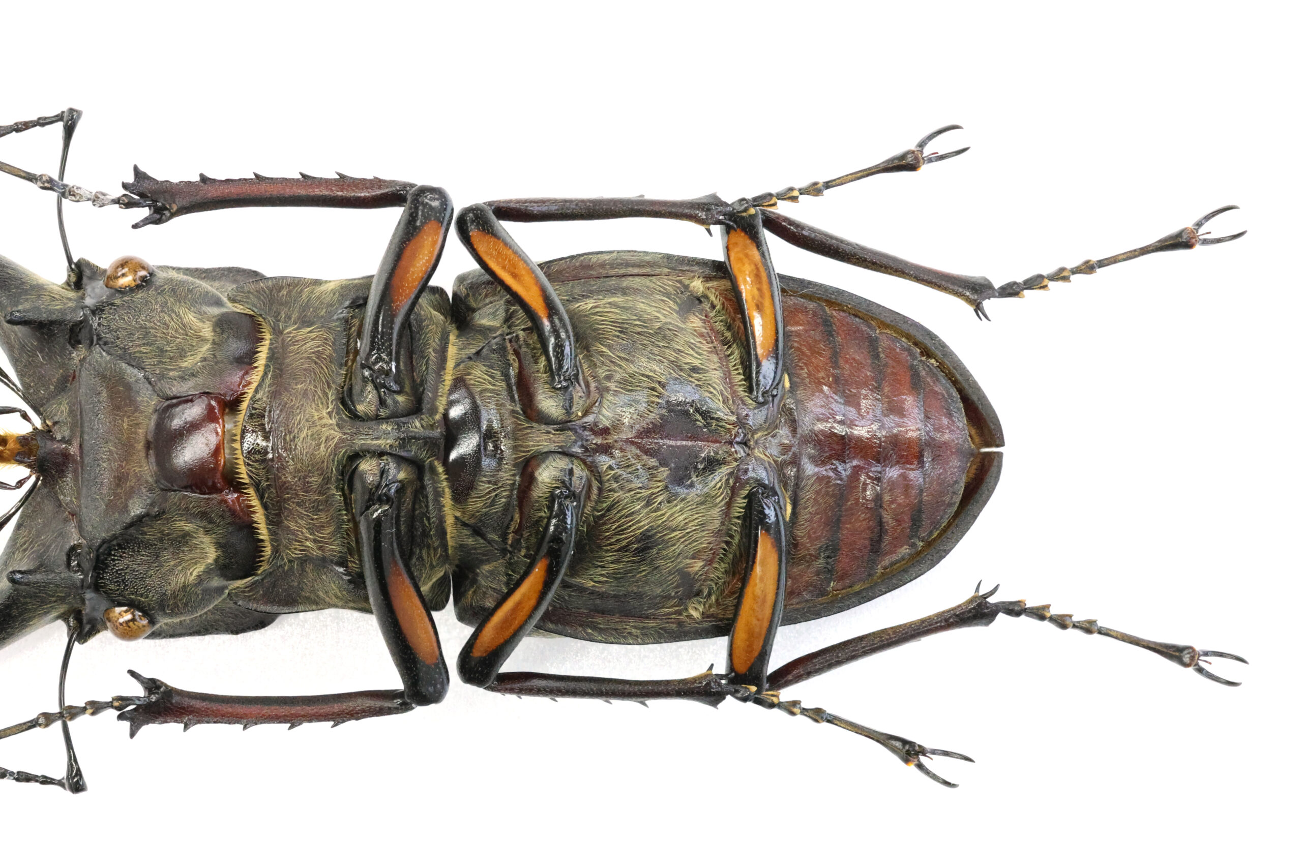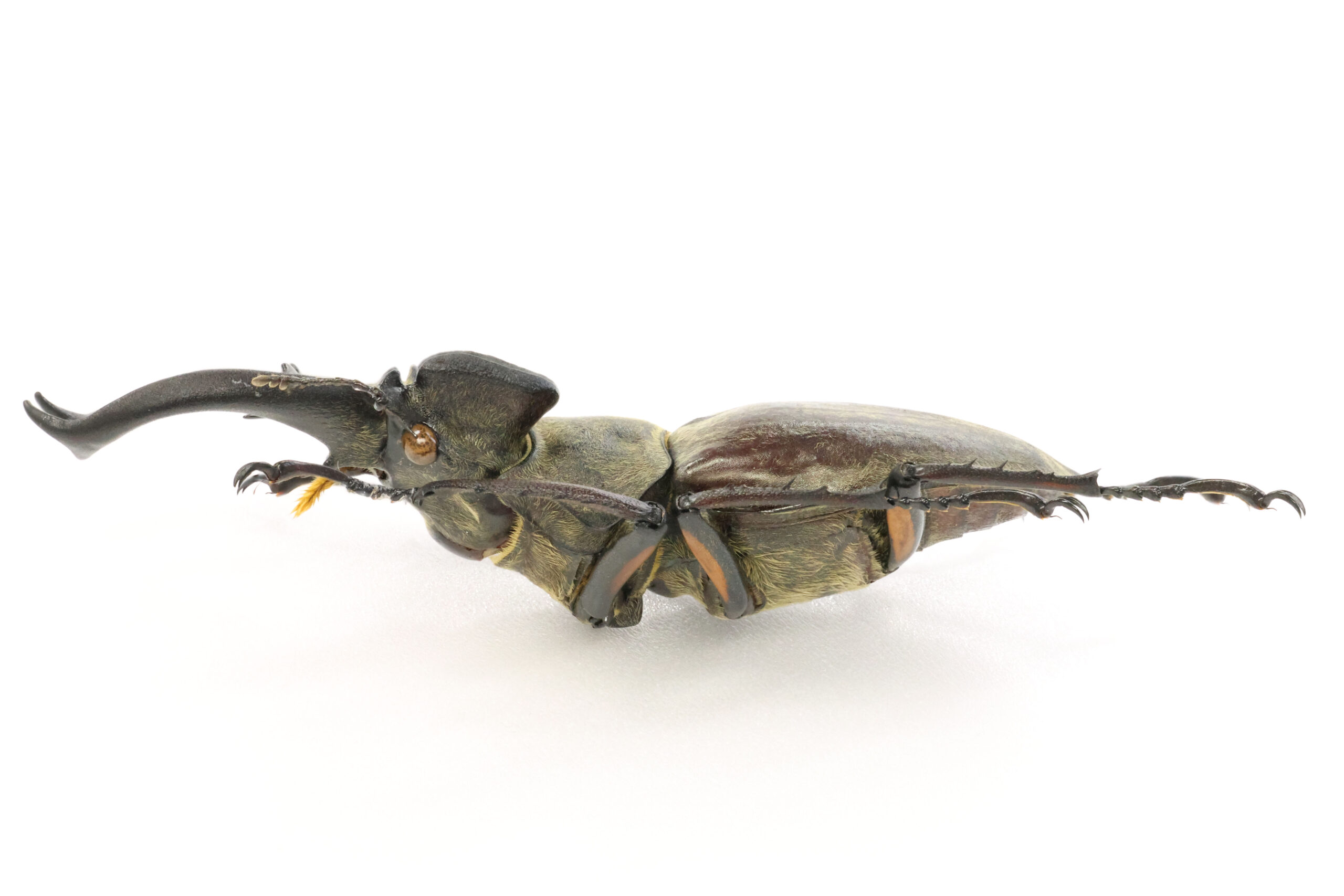 耳状突起も美しい箱型、そして何よりシカ角のように伸びた大アゴが素晴らしい。さらに、この個体を覆う微毛は白っぽい金色…光の反射によっては美しい銀色になります。この色合いも本個体の魅力を高めていると思います。