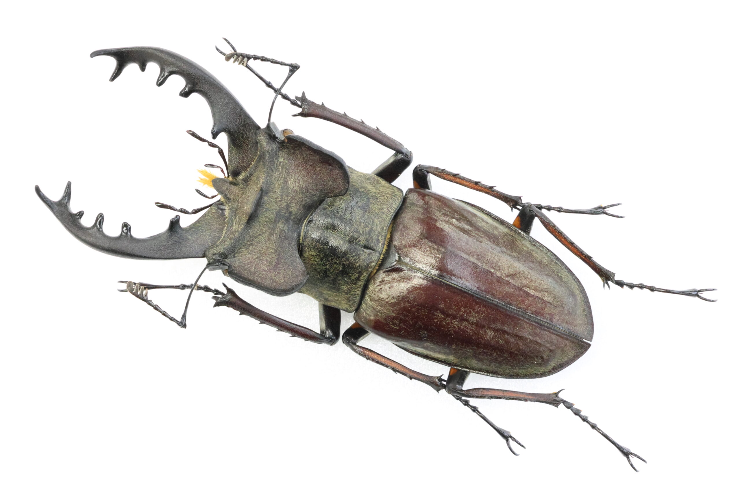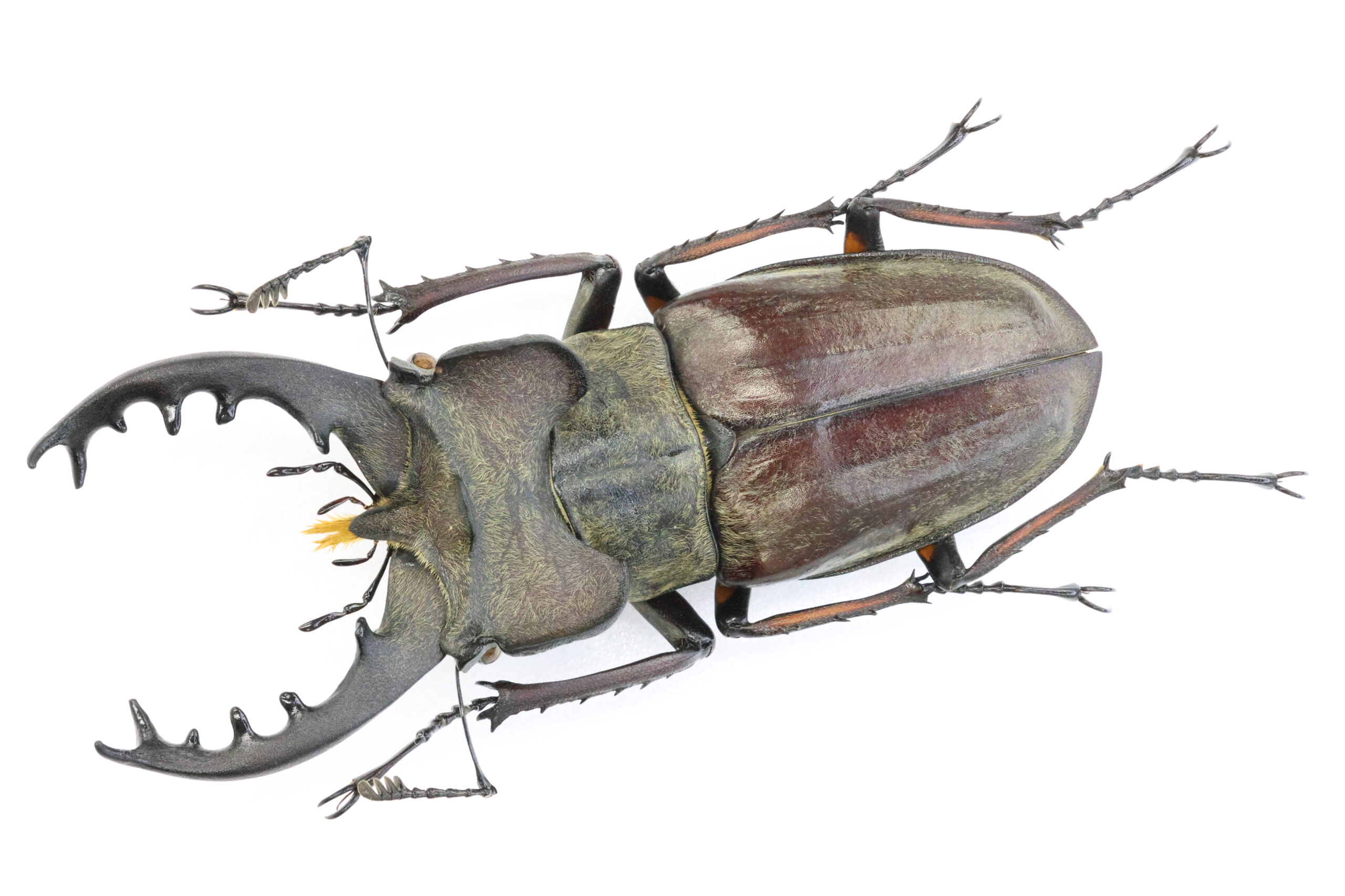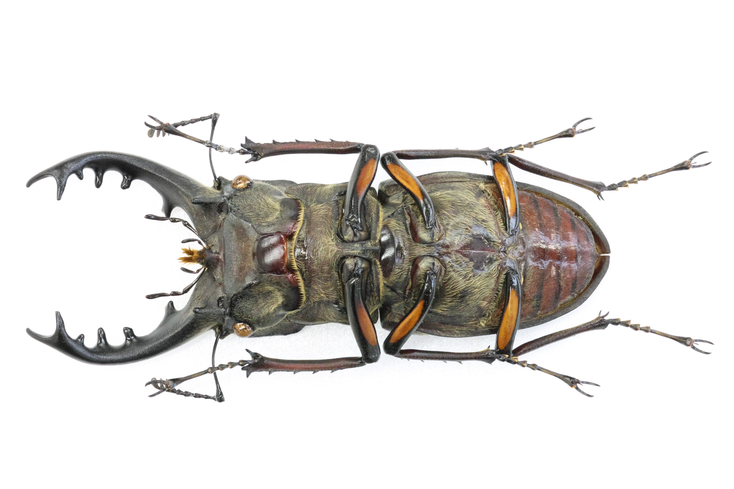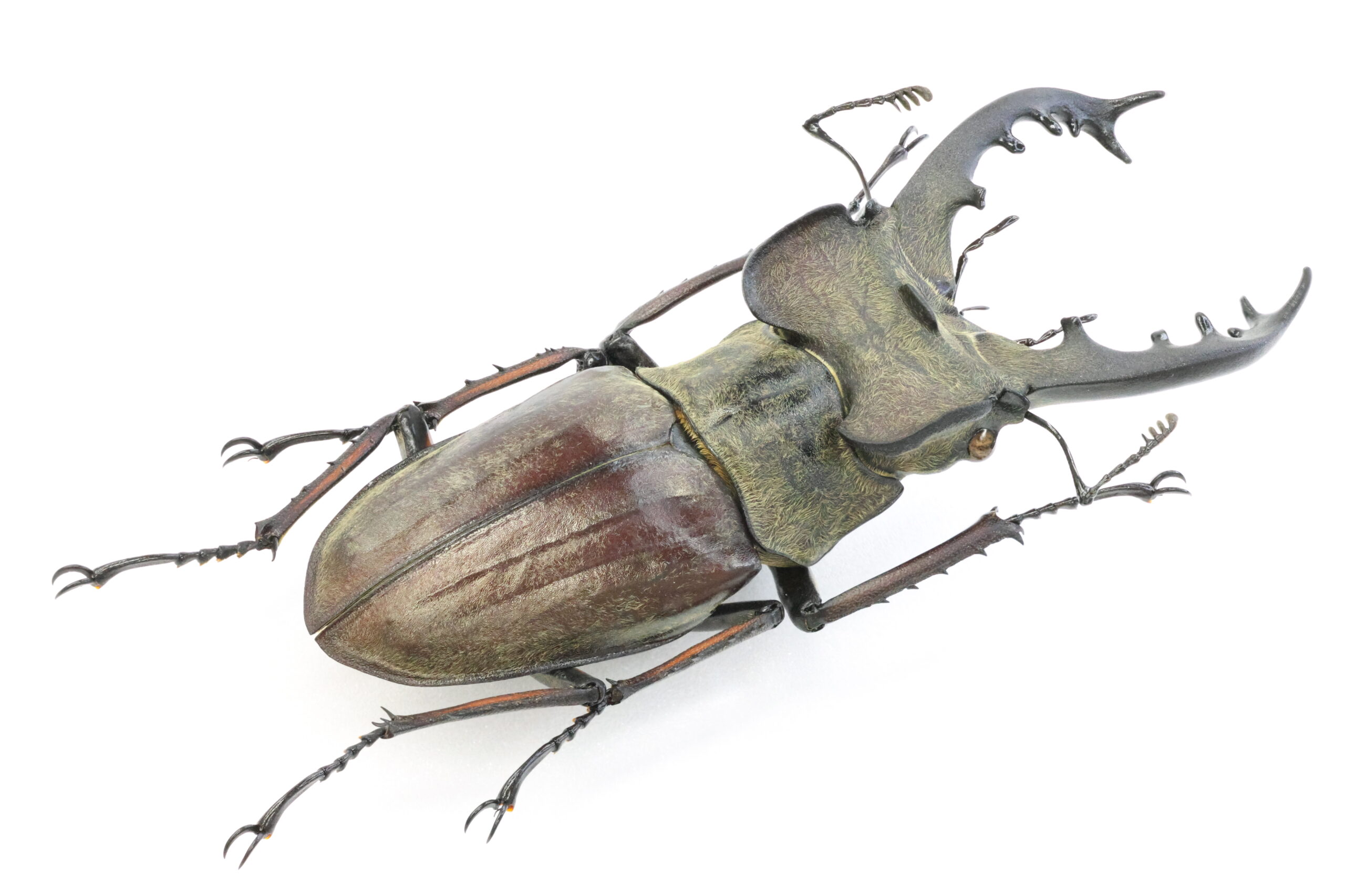 耳状突起も美しい箱型、そして何よりシカ角のように伸びた大アゴが素晴らしい。さらに、この個体を覆う微毛は白っぽい金色…光の反射によっては美しい銀色になります。この色合いも本個体の魅力を高めていると思います。