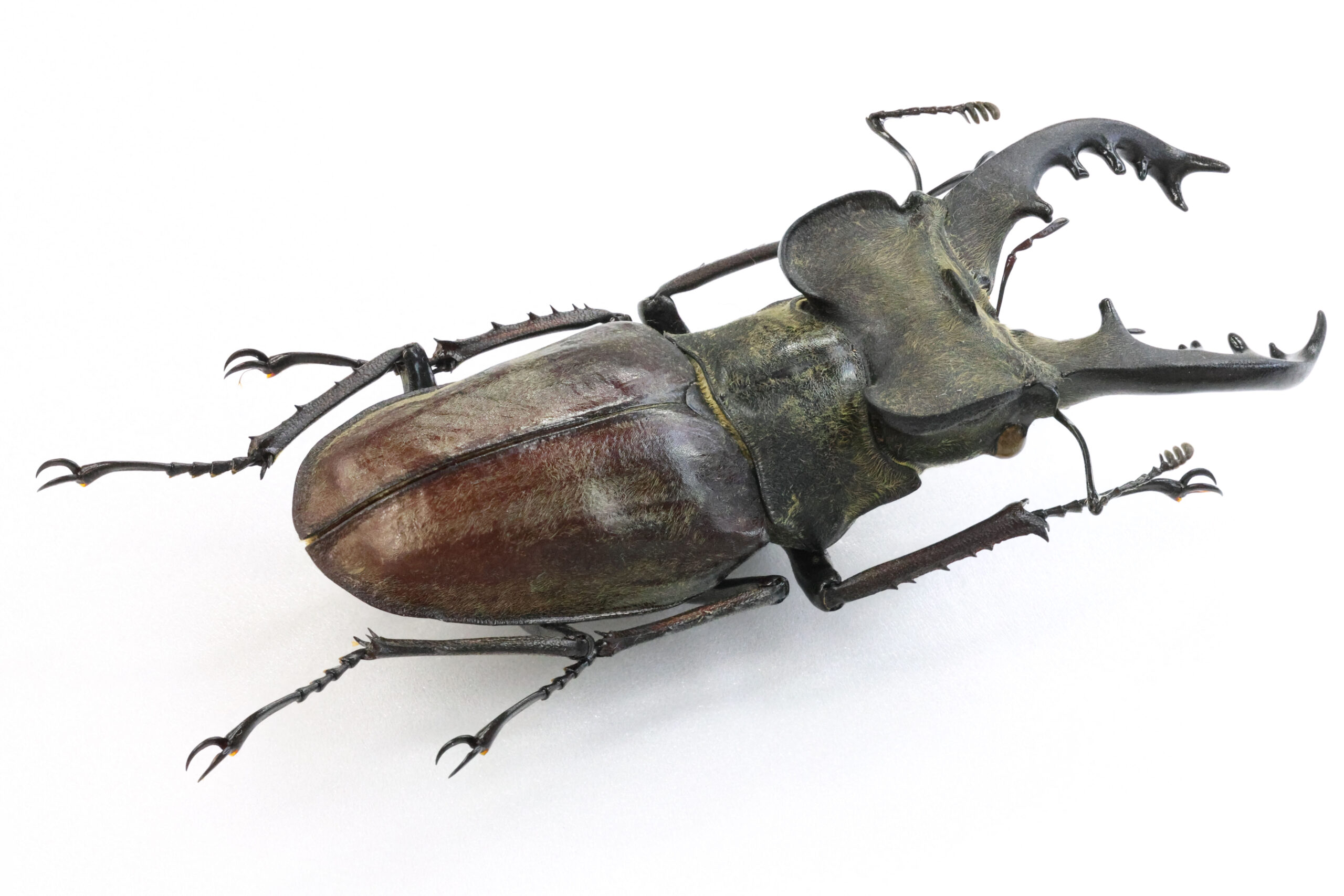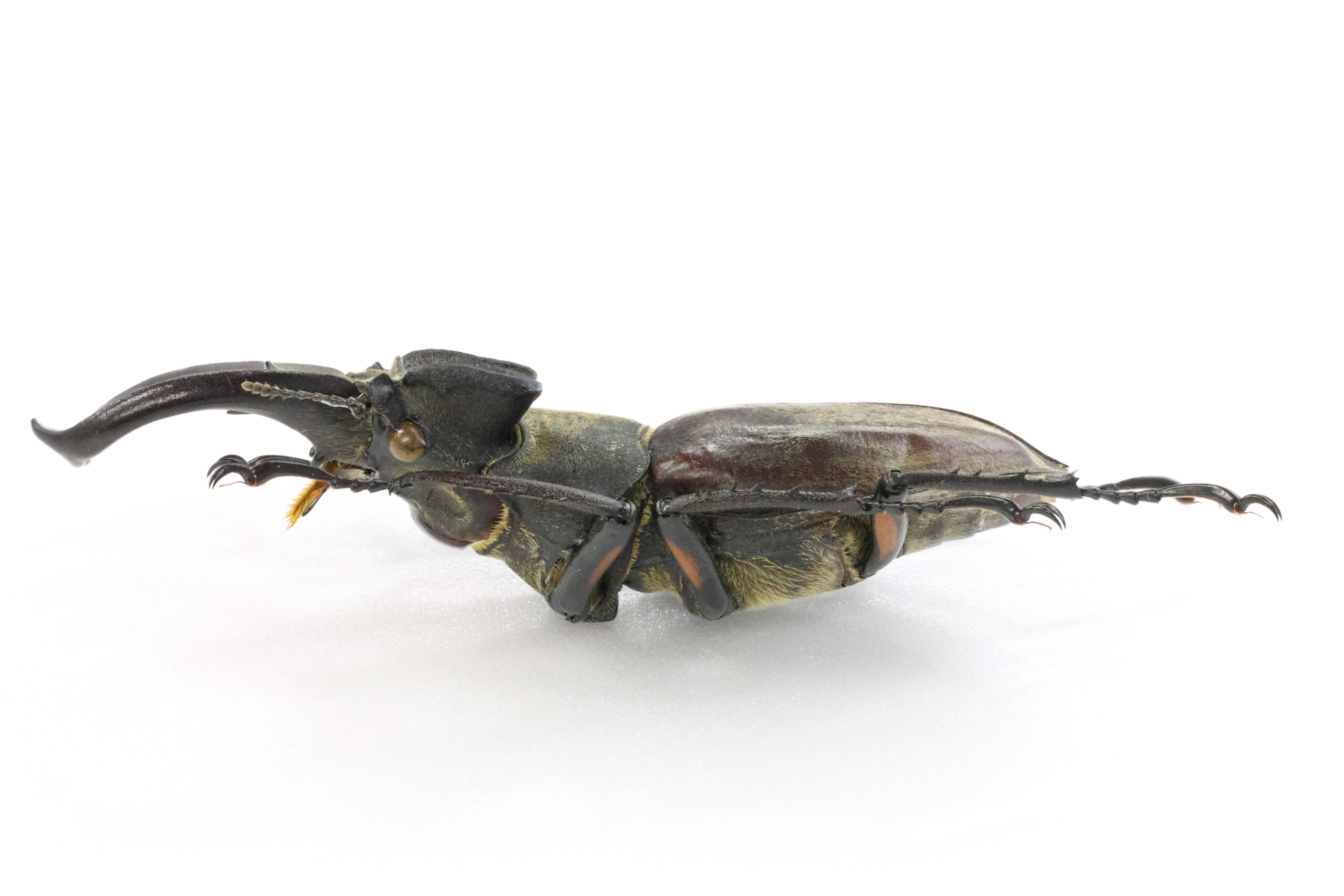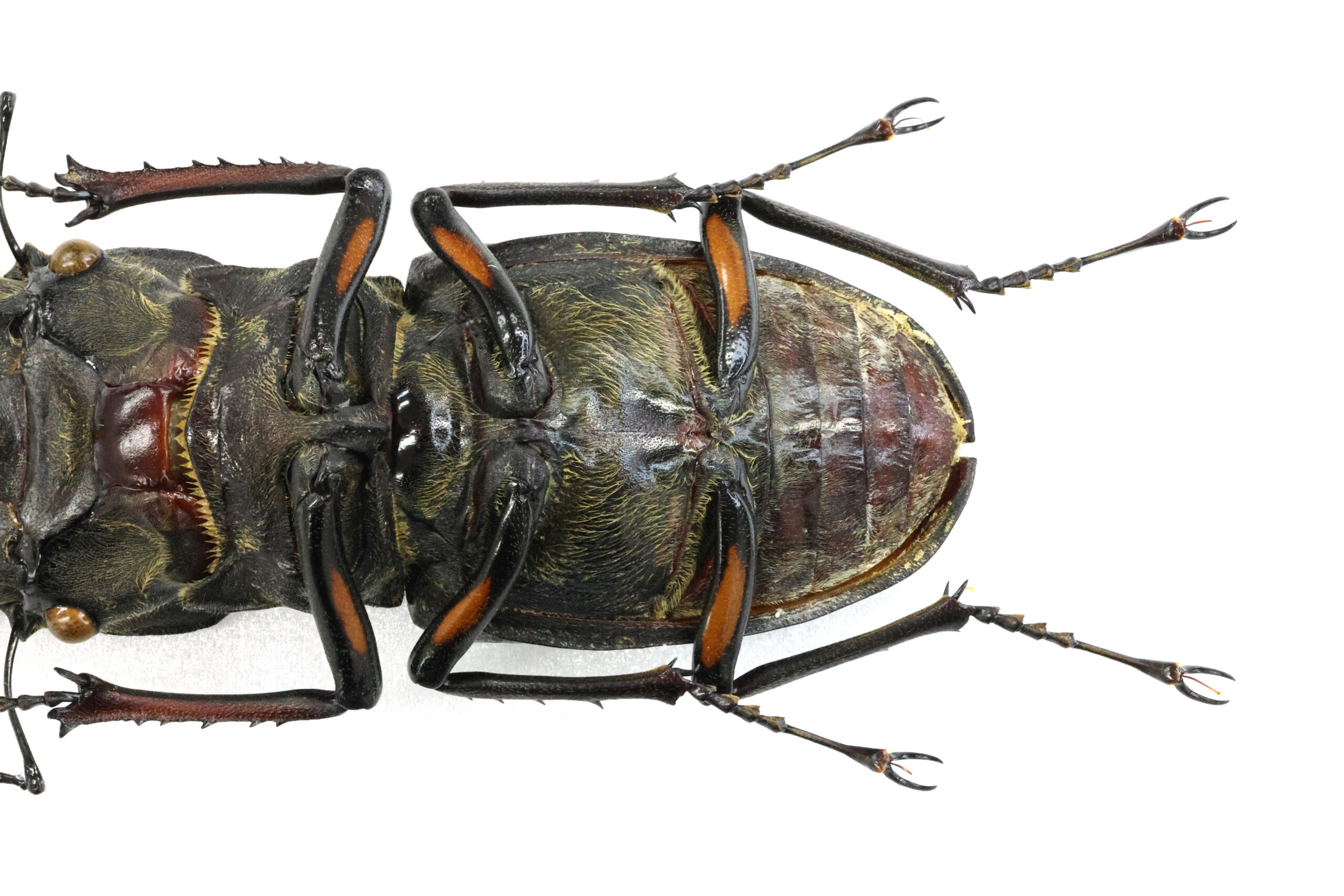 私が持っている東北地方の特大ミヤマたちの多くは、ライトトラップで得られていますが、このミヤマは木を蹴って落ちてきた個体だそうです。ただ、樹種がわからないとのこと。
