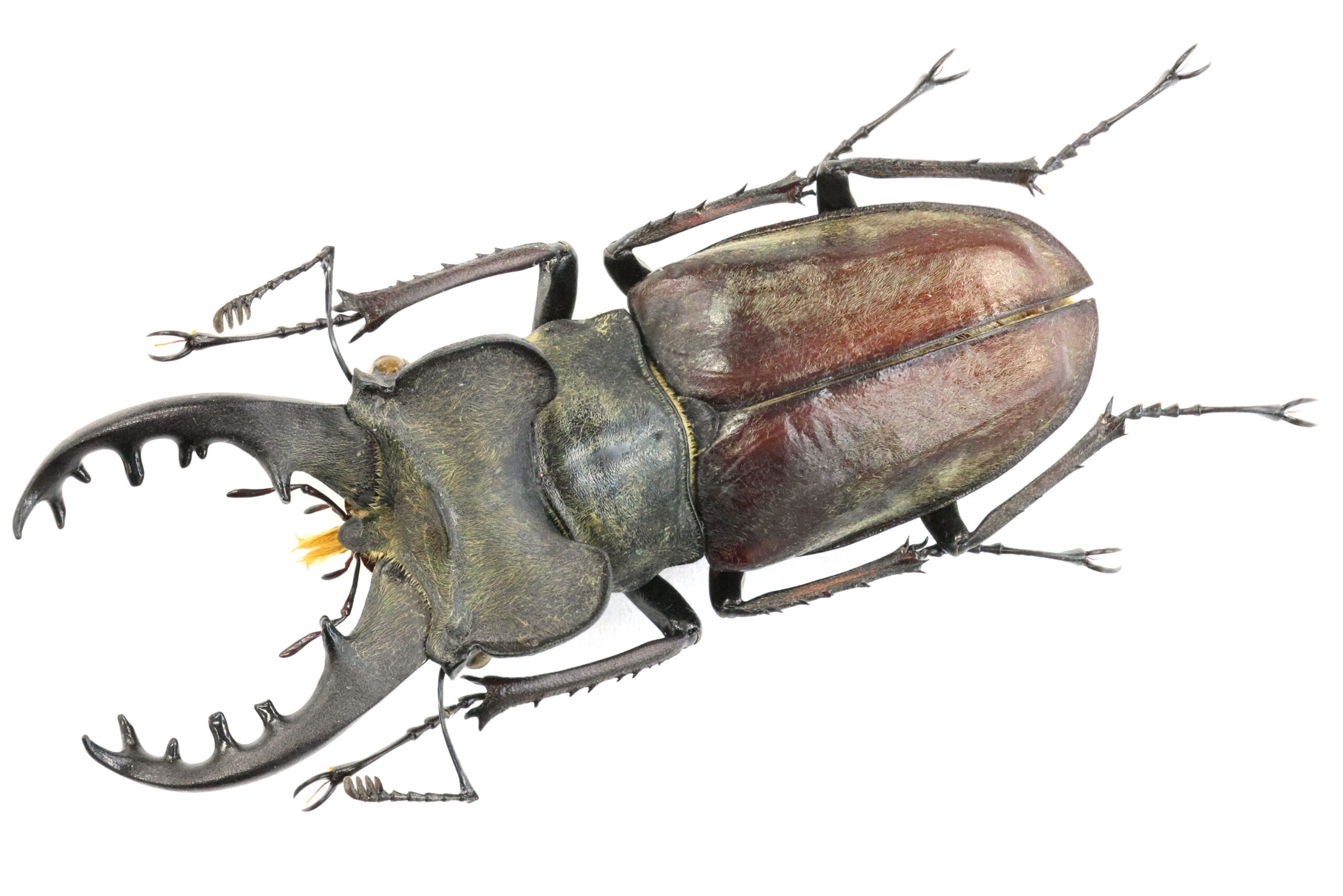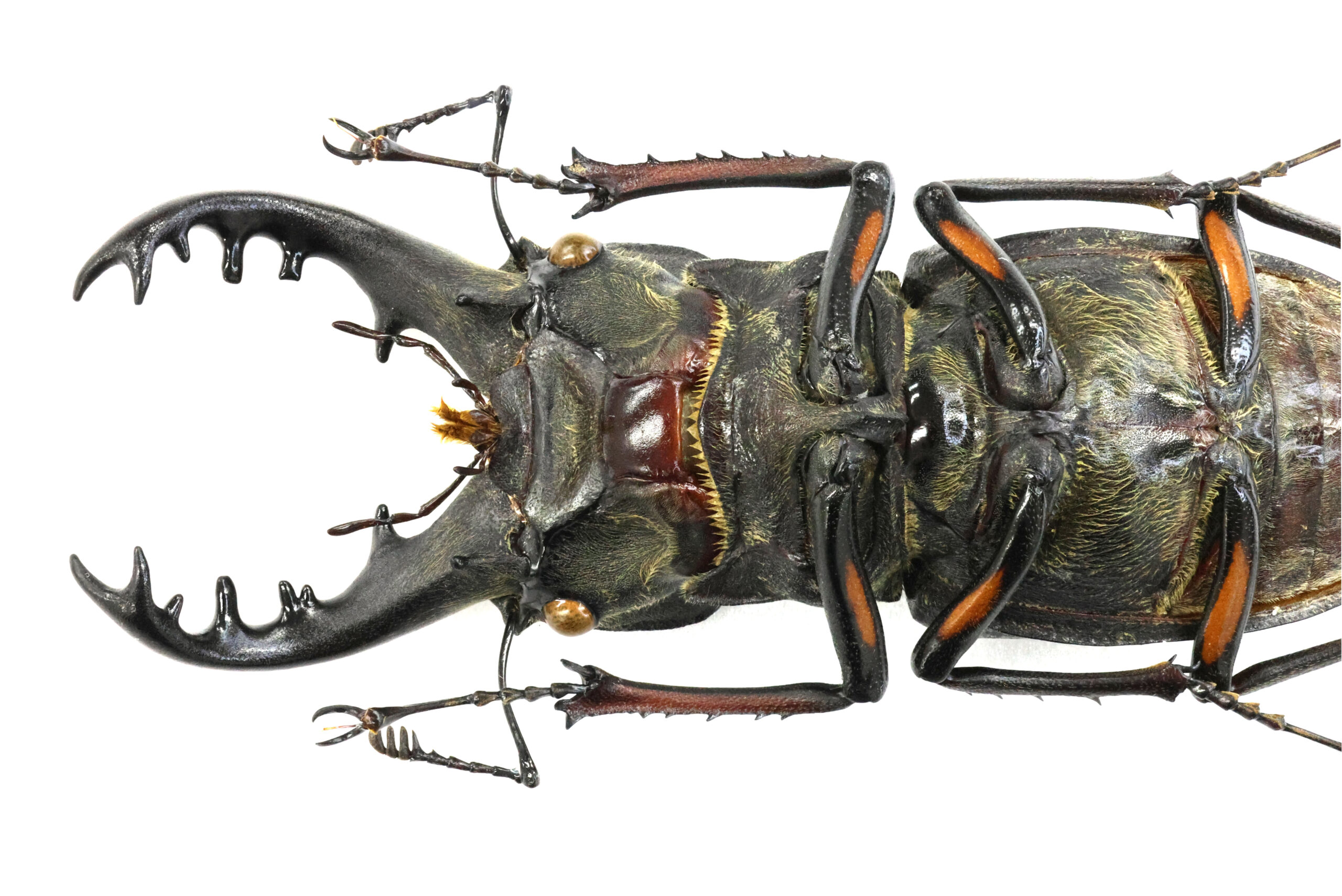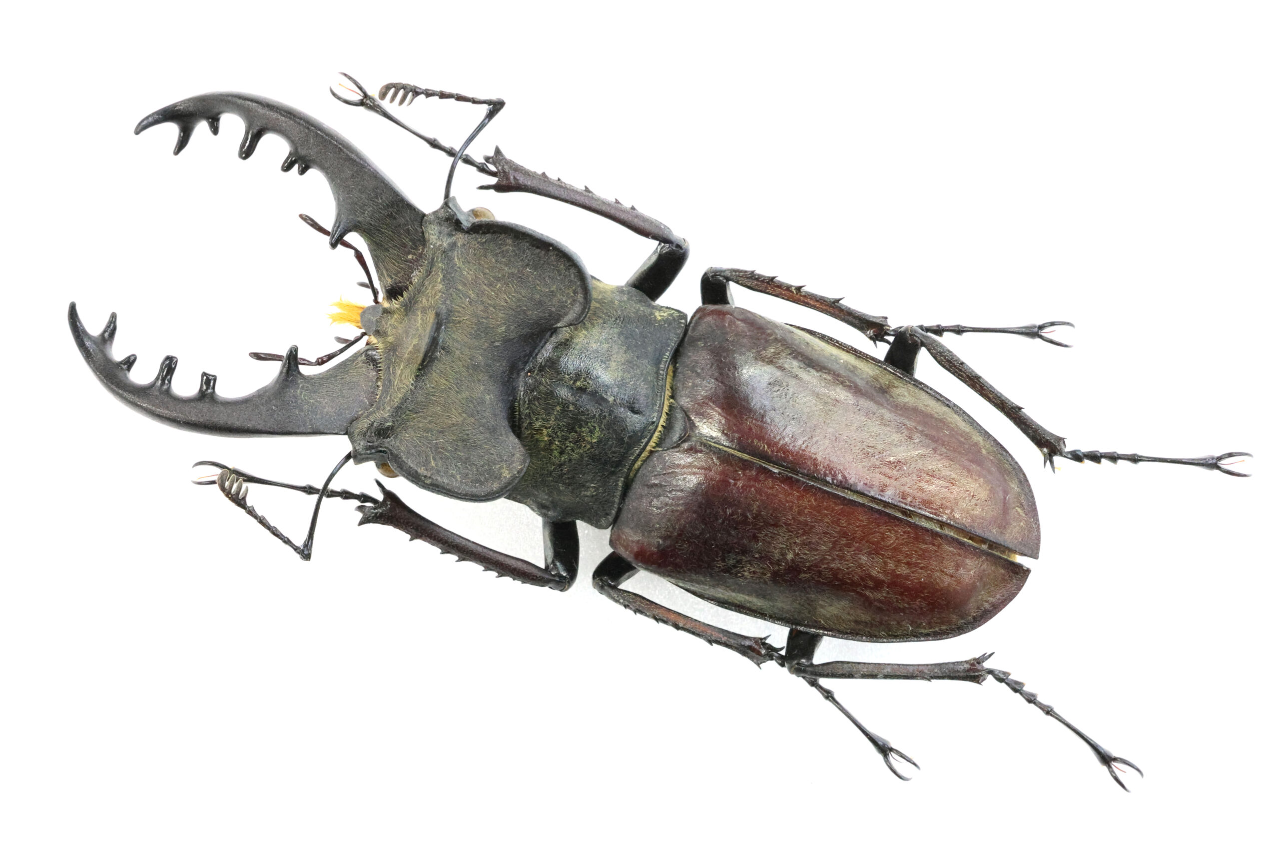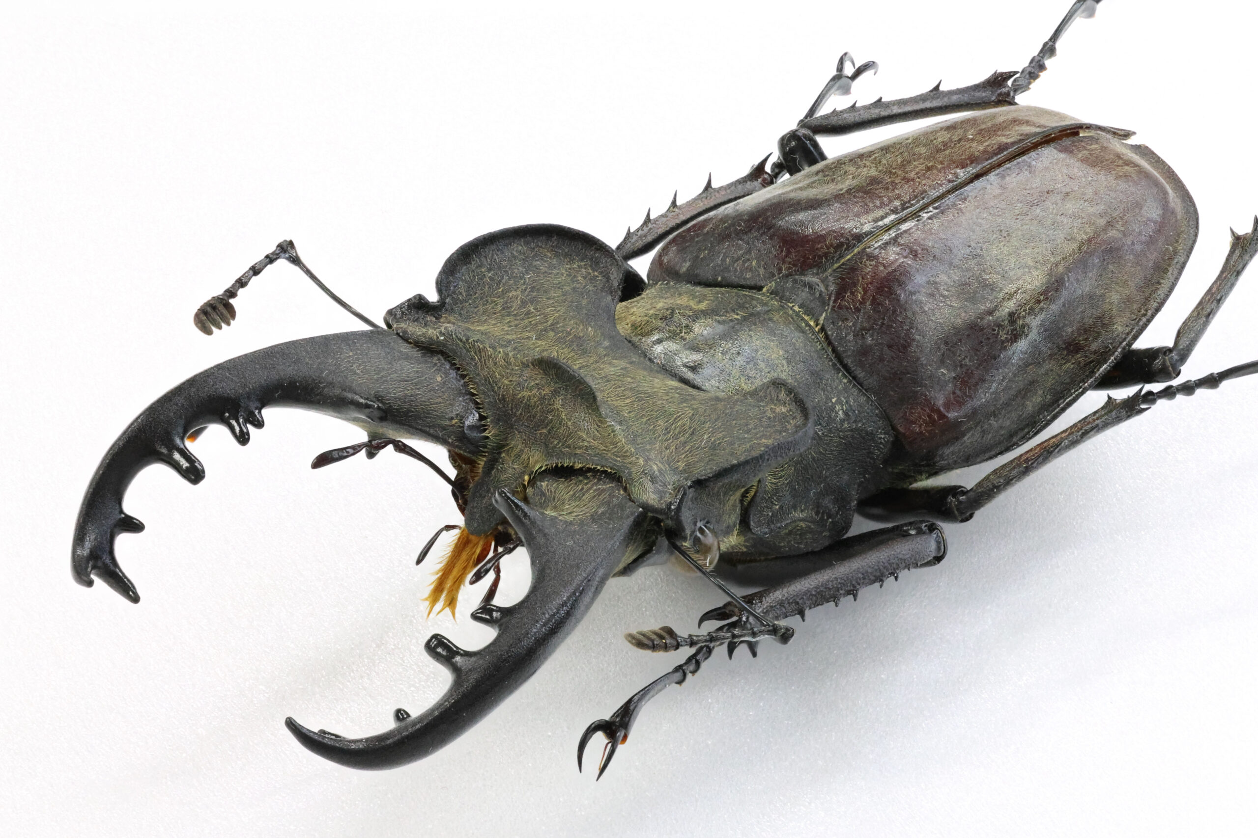 私が持っている東北地方の特大ミヤマたちの多くは、ライトトラップで得られていますが、このミヤマは木を蹴って落ちてきた個体だそうです。ただ、樹種がわからないとのこと。