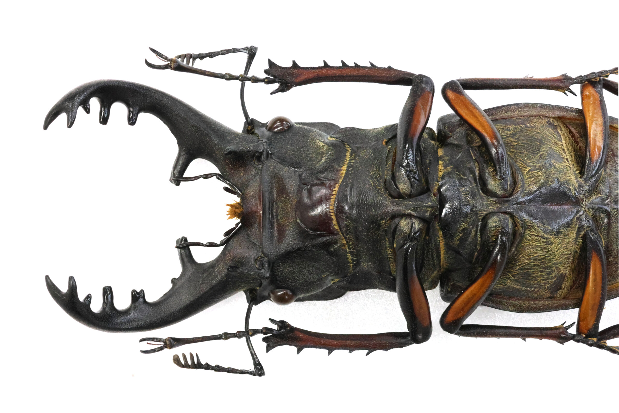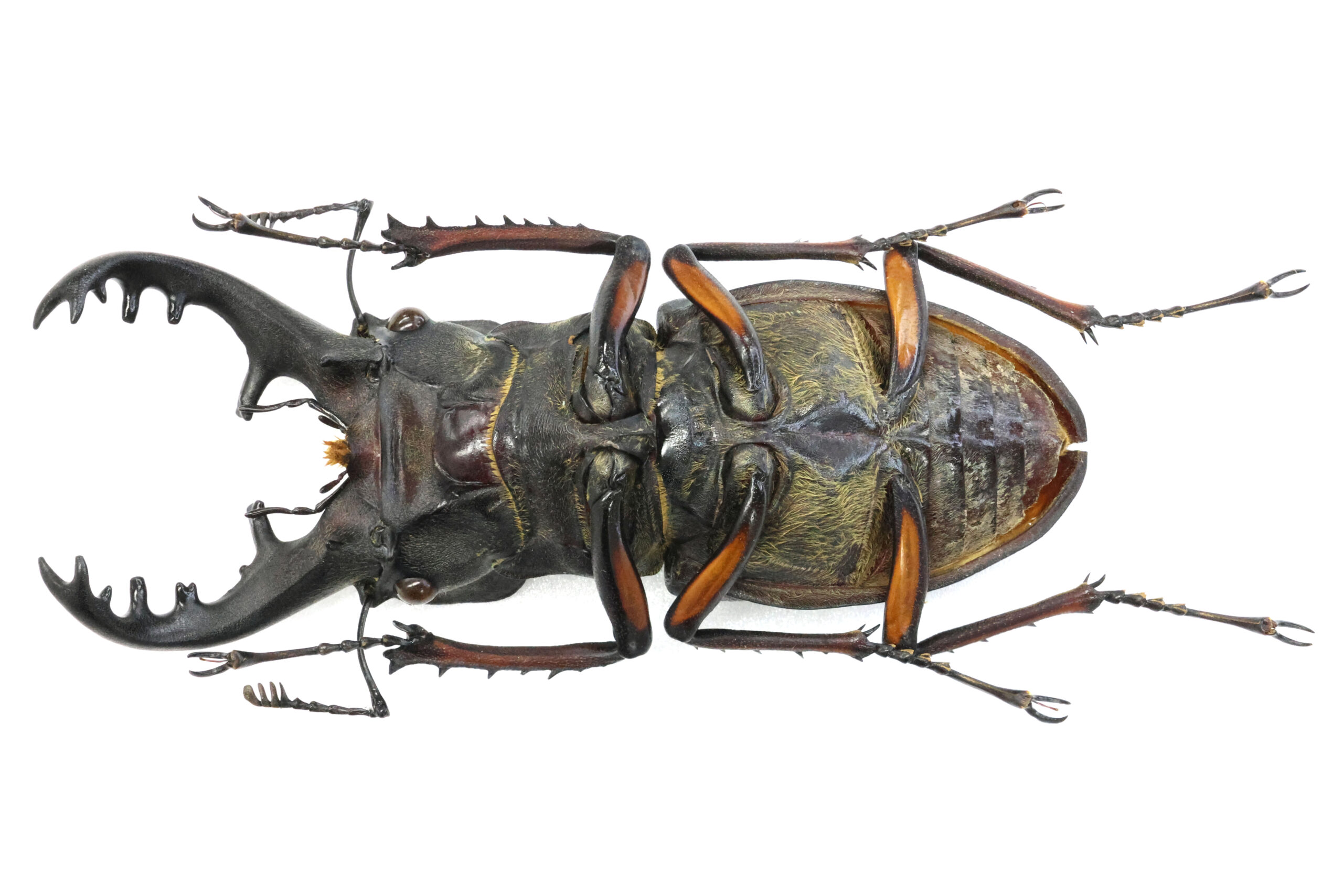 標本を見て下さい。第一内歯の大きさと大アゴの太さに目が行きます。重量感のある愛知県内で採集された最大クラスのミヤマクワガタです。迫力ありますね。