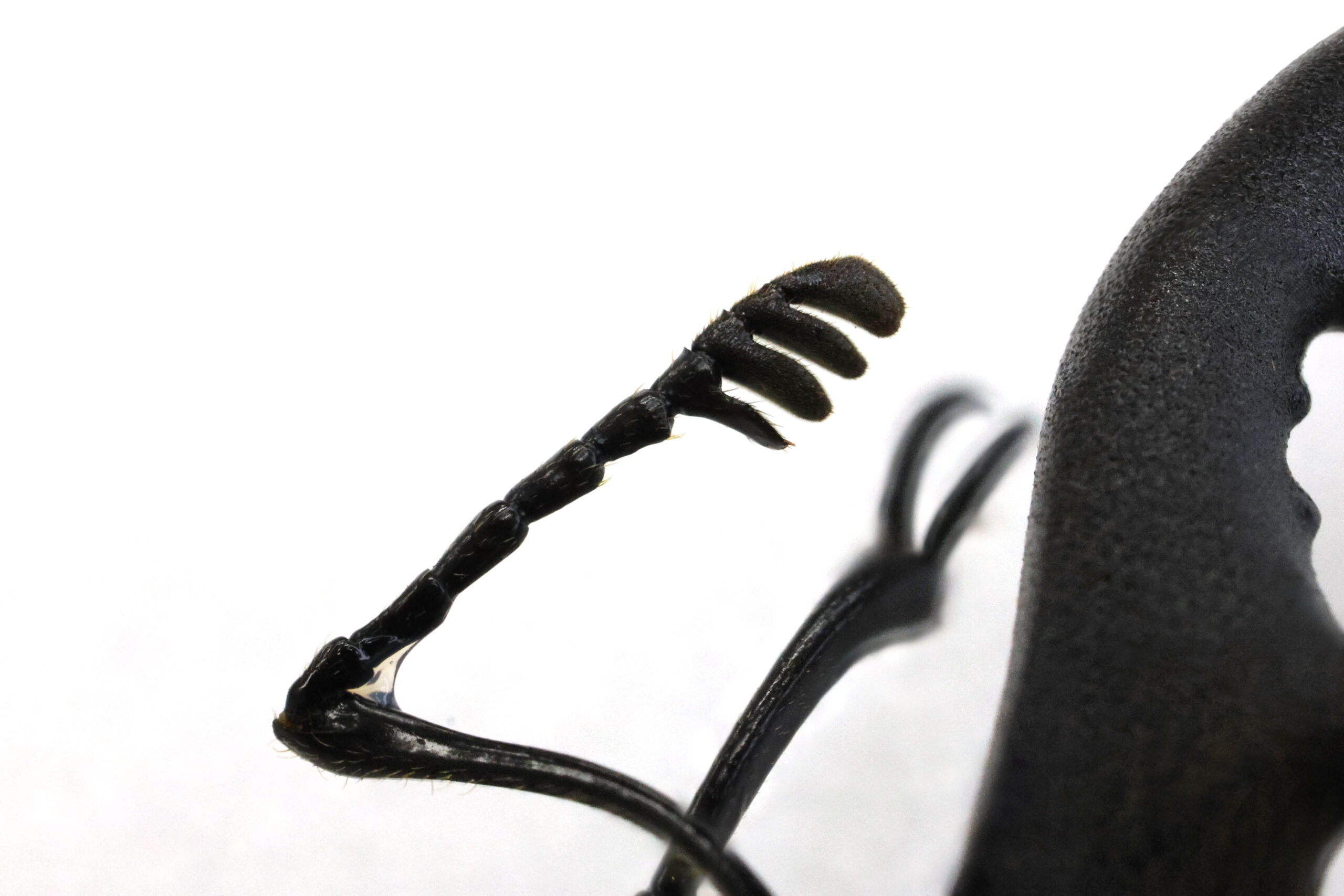 答えは、人間と同じような鼻はないのですが、臭いを感じ取る鼻の役割を果たしている部分があります。それは触角(口髭もかな…)です。ミヤマクワガタの触角をよく見て下さい。触角の先が4つに分かれてクシ状になっています。これで食べ物の香りやメスの匂いを感じ取っています。是非、今年の夏に生きたクワガタの触角を観察してみて下さい。細かく動かして、何かを感じ取っているのがわかると思います。最愛の女性(メス)に対するときは、なんと優しく触れていることか!メスを優しく撫でるように、見ている私でさえ、メスに対する溢れる愛情が感じられます。ほんとに微笑ましいです。