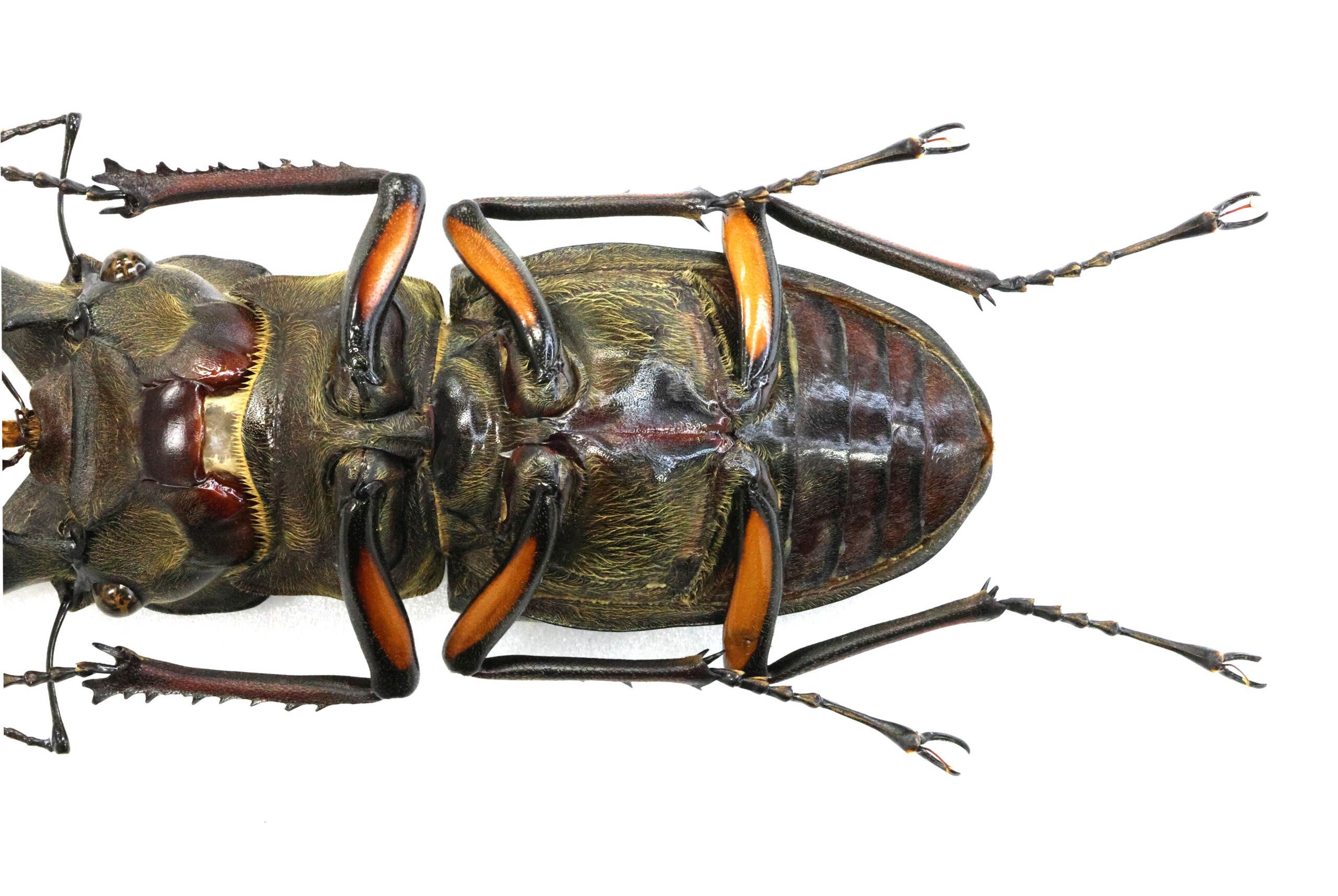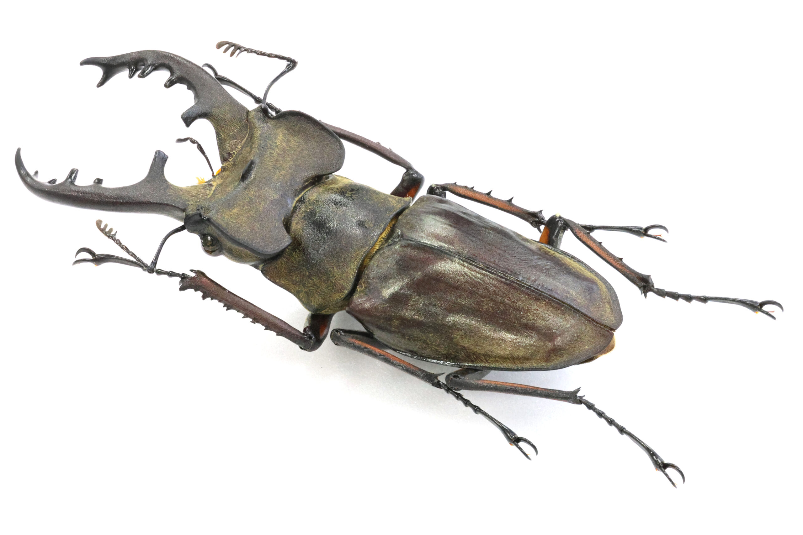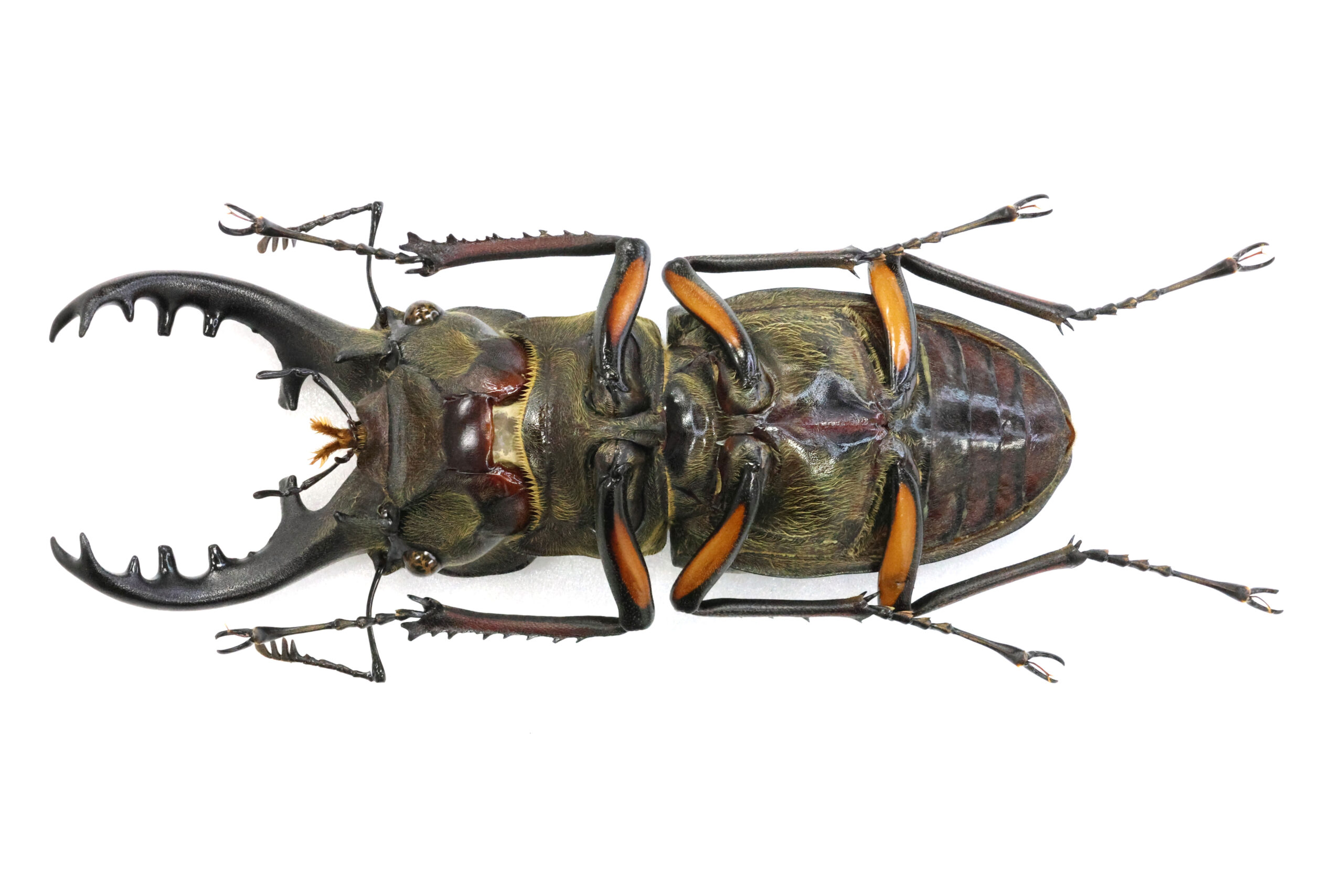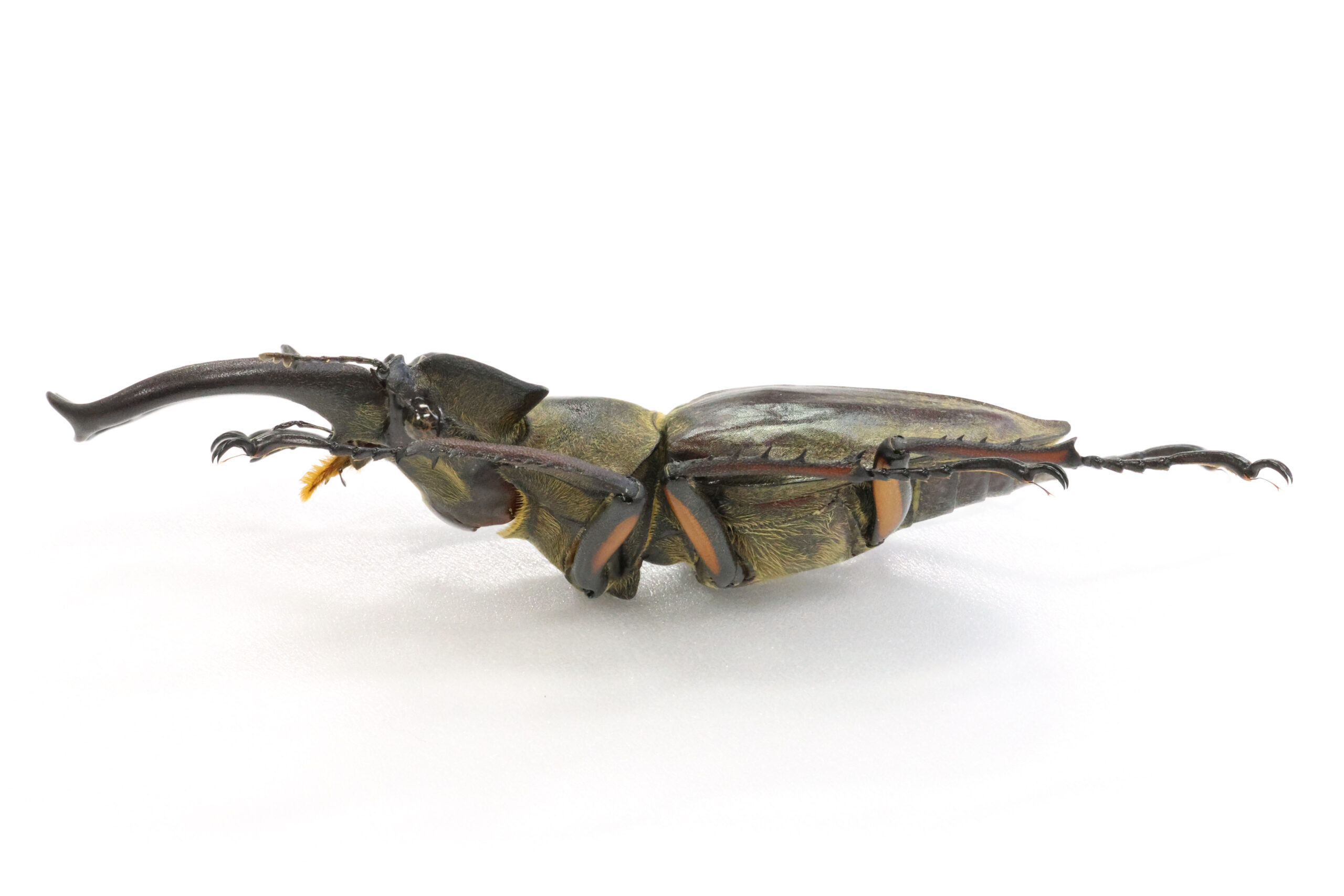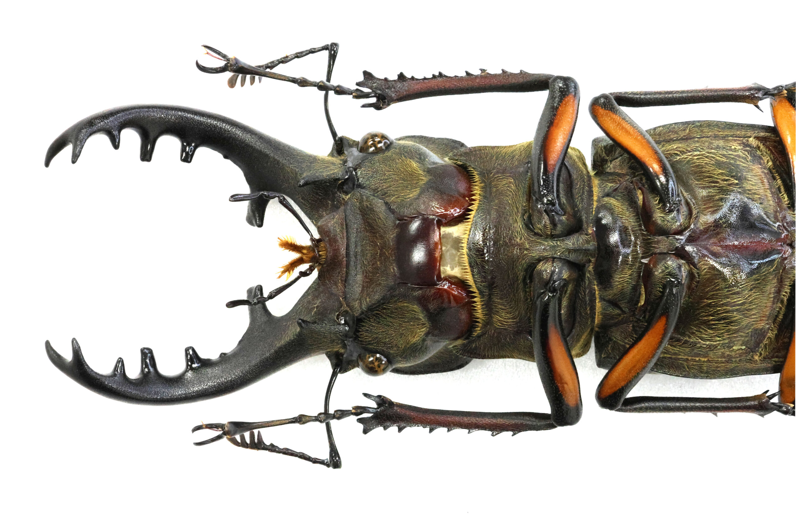 本個体は、林さんがこれまでに採集されたミヤマの最大サイズだそうです。76ミリに開いたノギスがカッチリ当たります。ボディはスラっとしているのですが、頭冠の発達も良く、美しいエレガントなミヤマクワガタです。スラリと前方に伸びた大アゴと太く突き出た第一内歯がなんとも格好良いです。