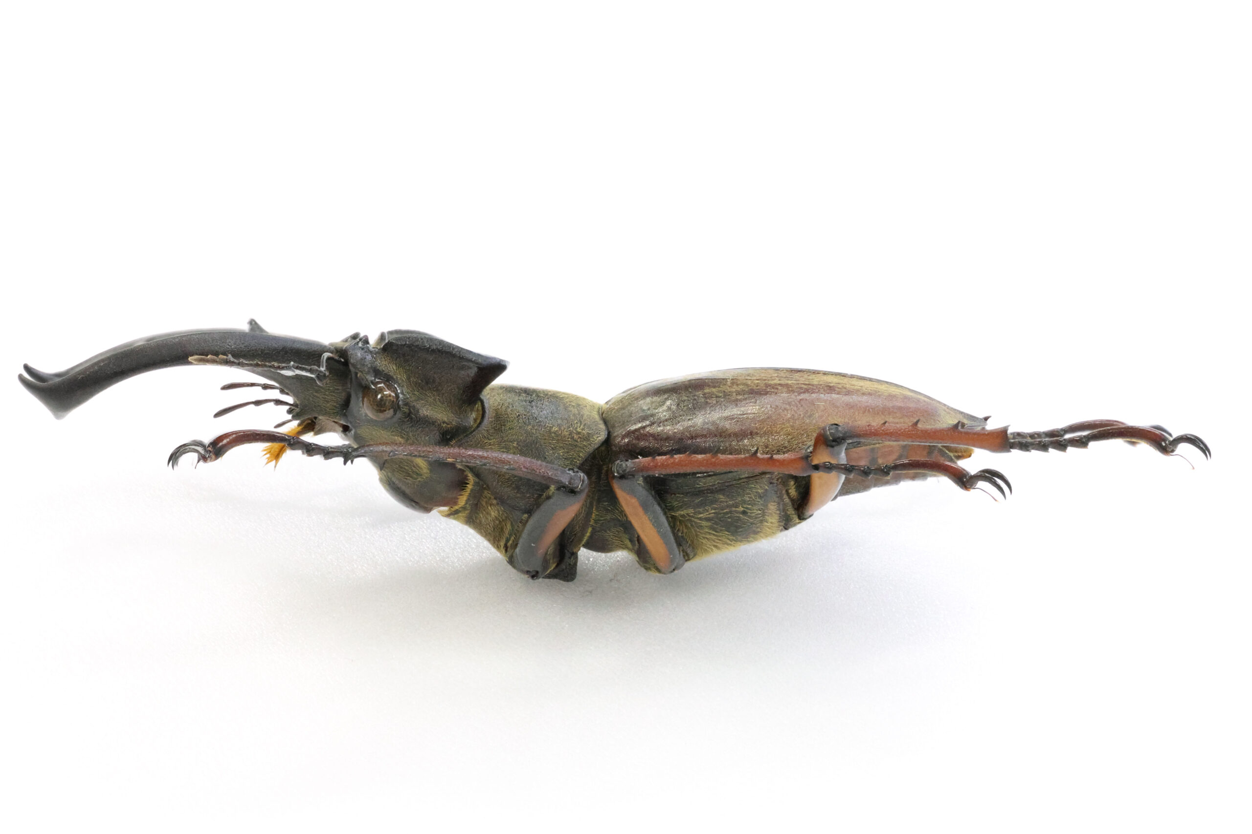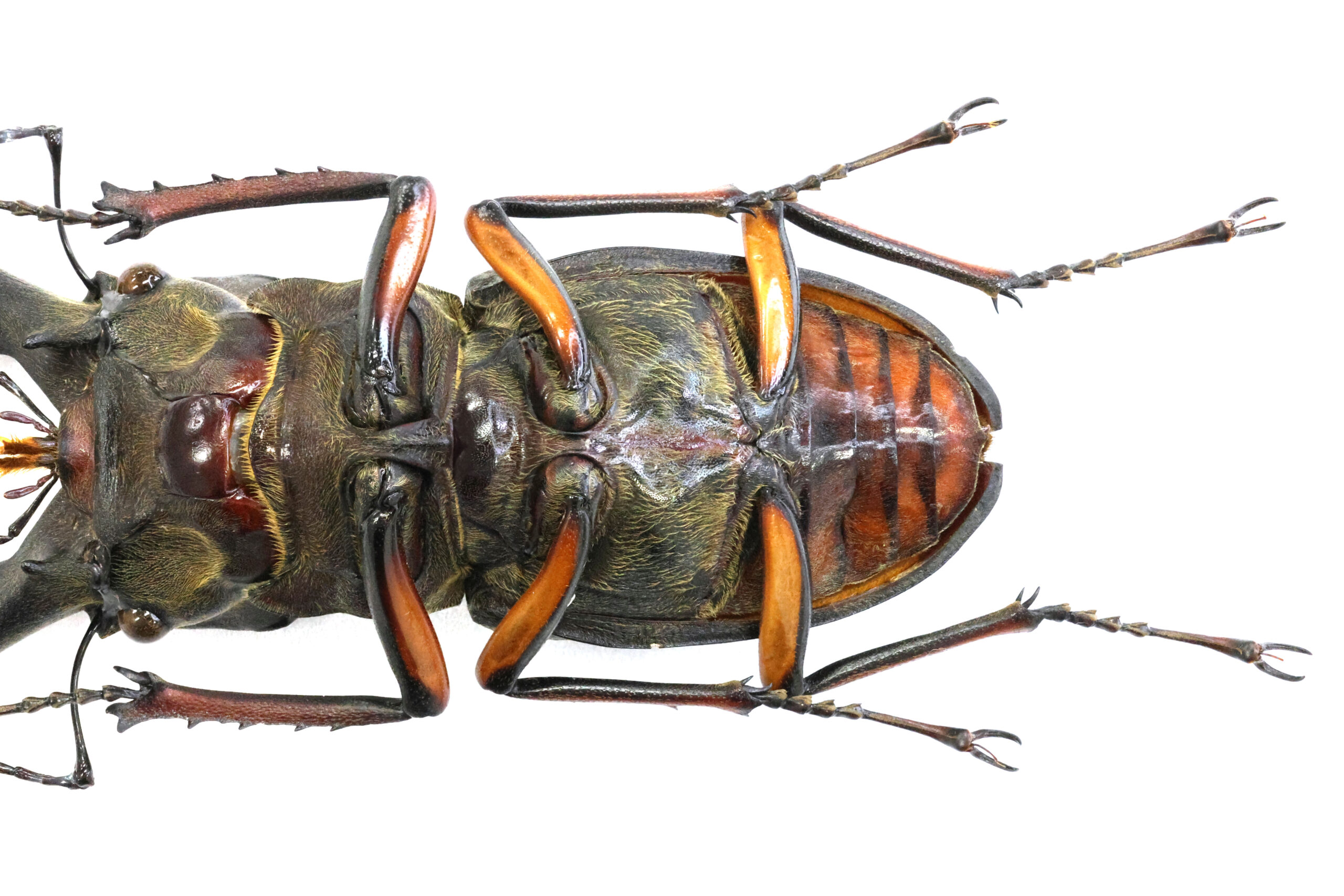 特に上翅、お尻に向かうほどオレンジの発色が良くなっています。よく観察してみるとフセツまで赤いです。フセツだけを見ると蛹から羽化して数時間後くらい…まだ外骨格がしっかり固まっていない状態の個体にも見えてきます。ワインレッドの色合いが美しくエレガントな個体だと思います。