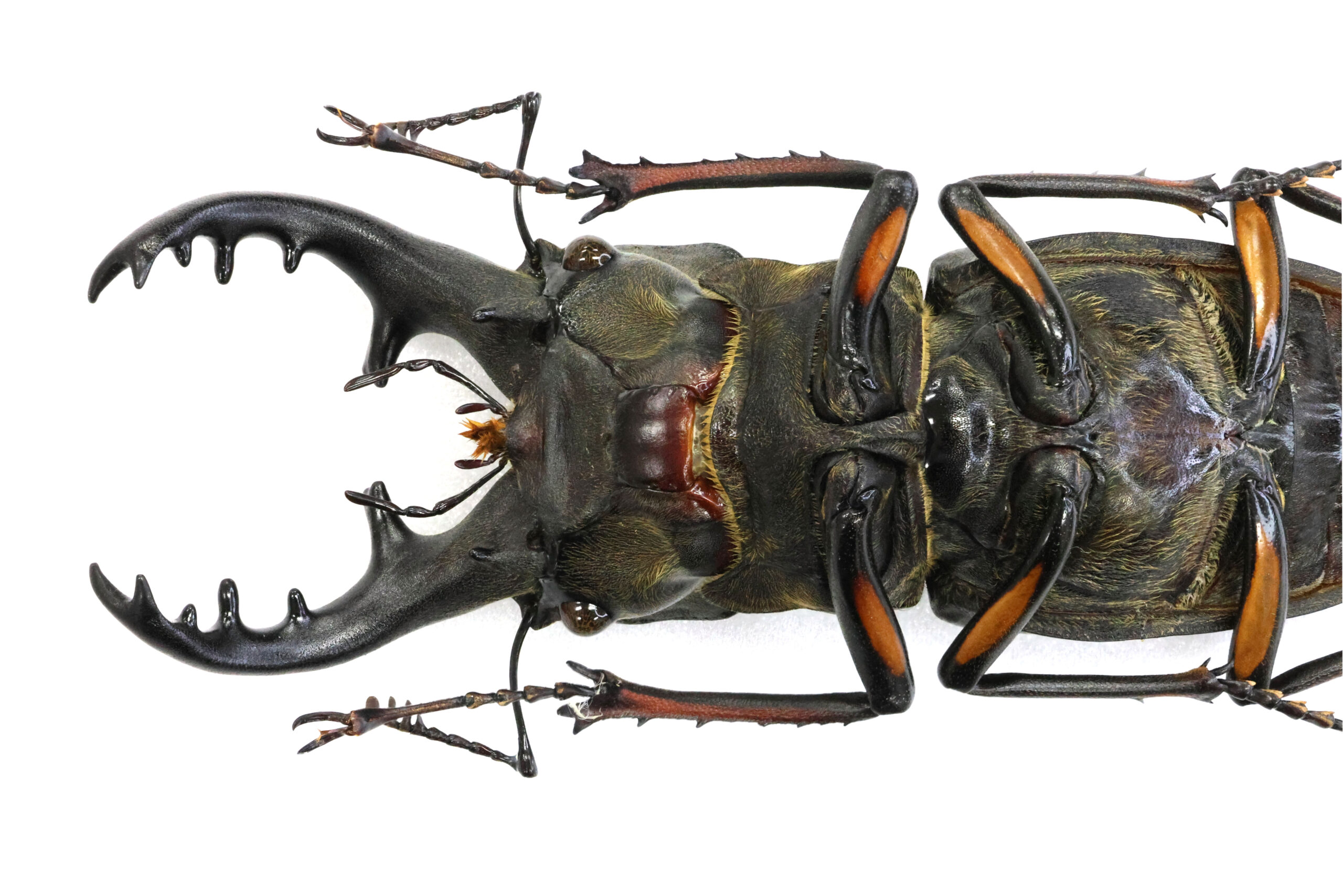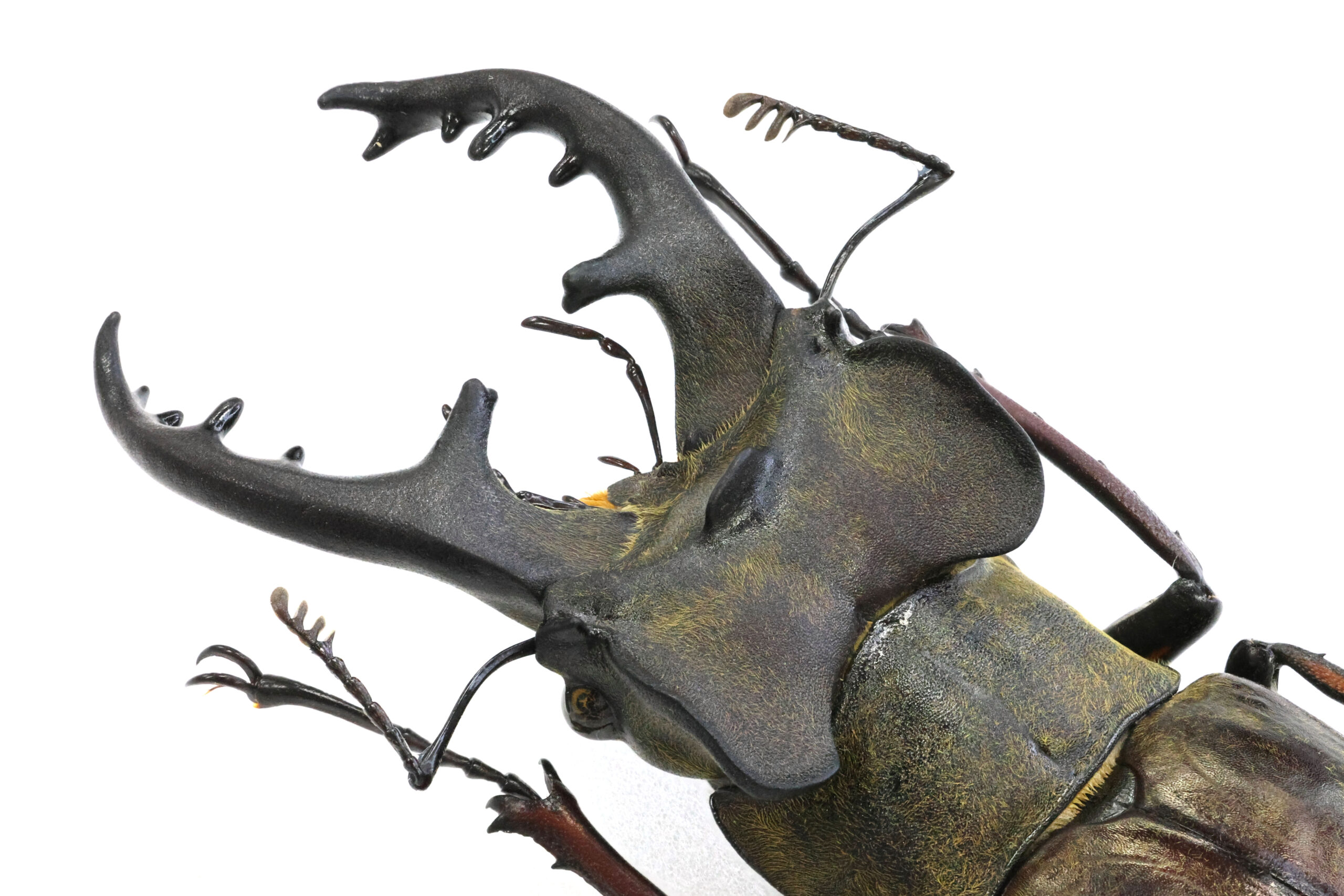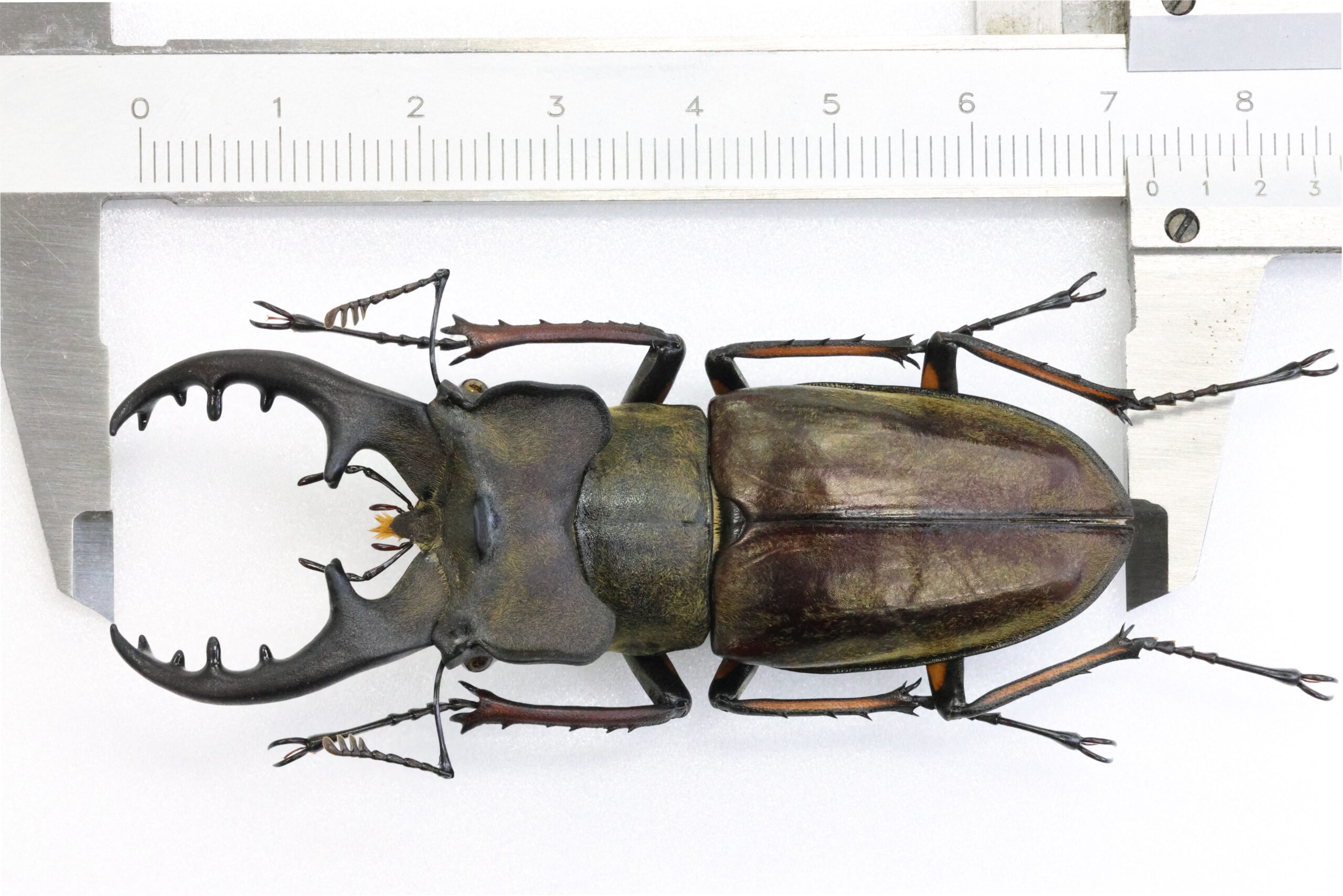 最大(最長)個体と比較しますと、頭部と大アゴの第一内歯の発達が、本個体の方が圧倒的に良いです。ナンバー1個体を隣に並べてみても、こちらの方が大きく感じられます。格好良いフジ型個体ですね。同じ地域でも大アゴの変異が楽しめる!ミヤマクワガタ人気を支えている要因の一つと感じます。