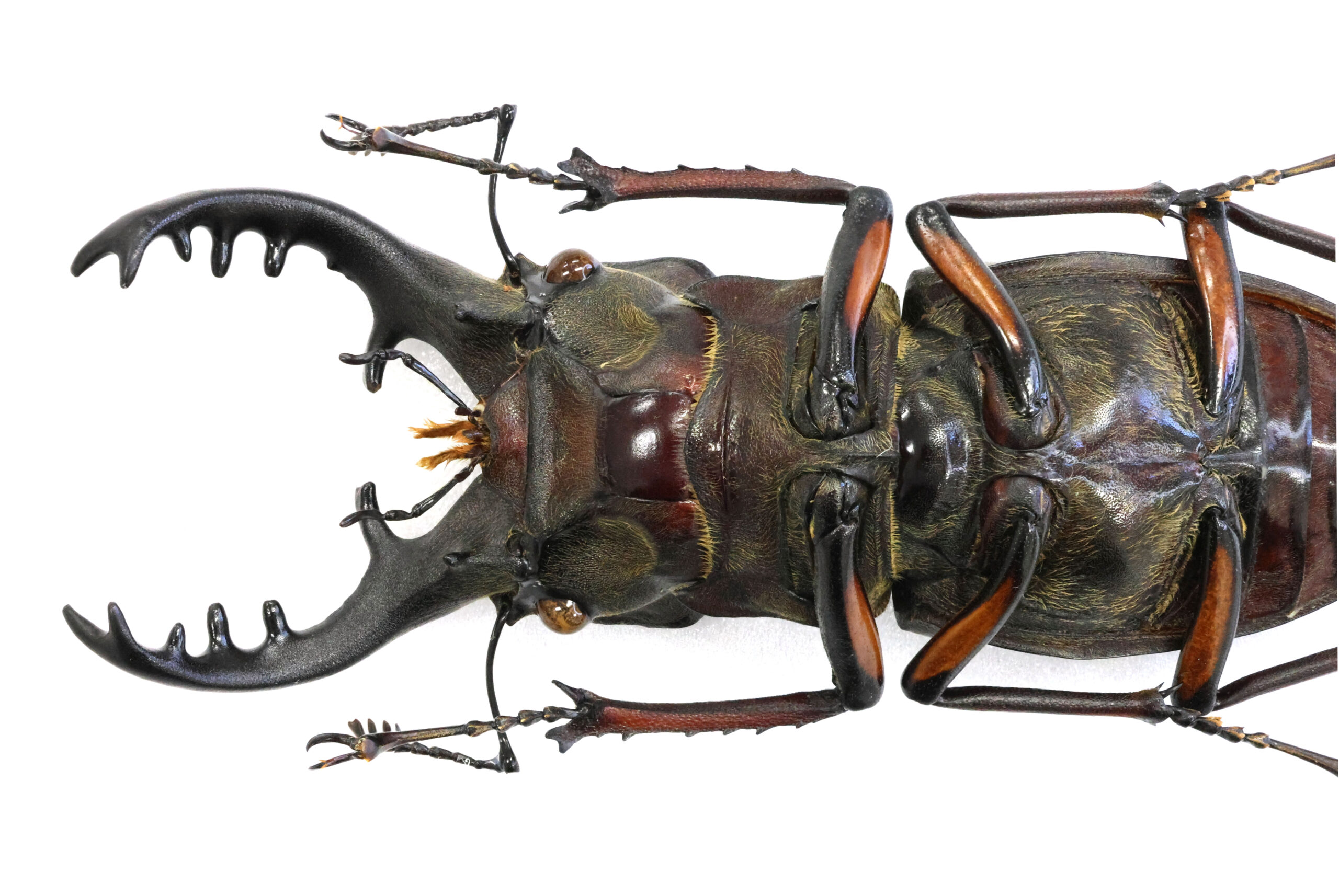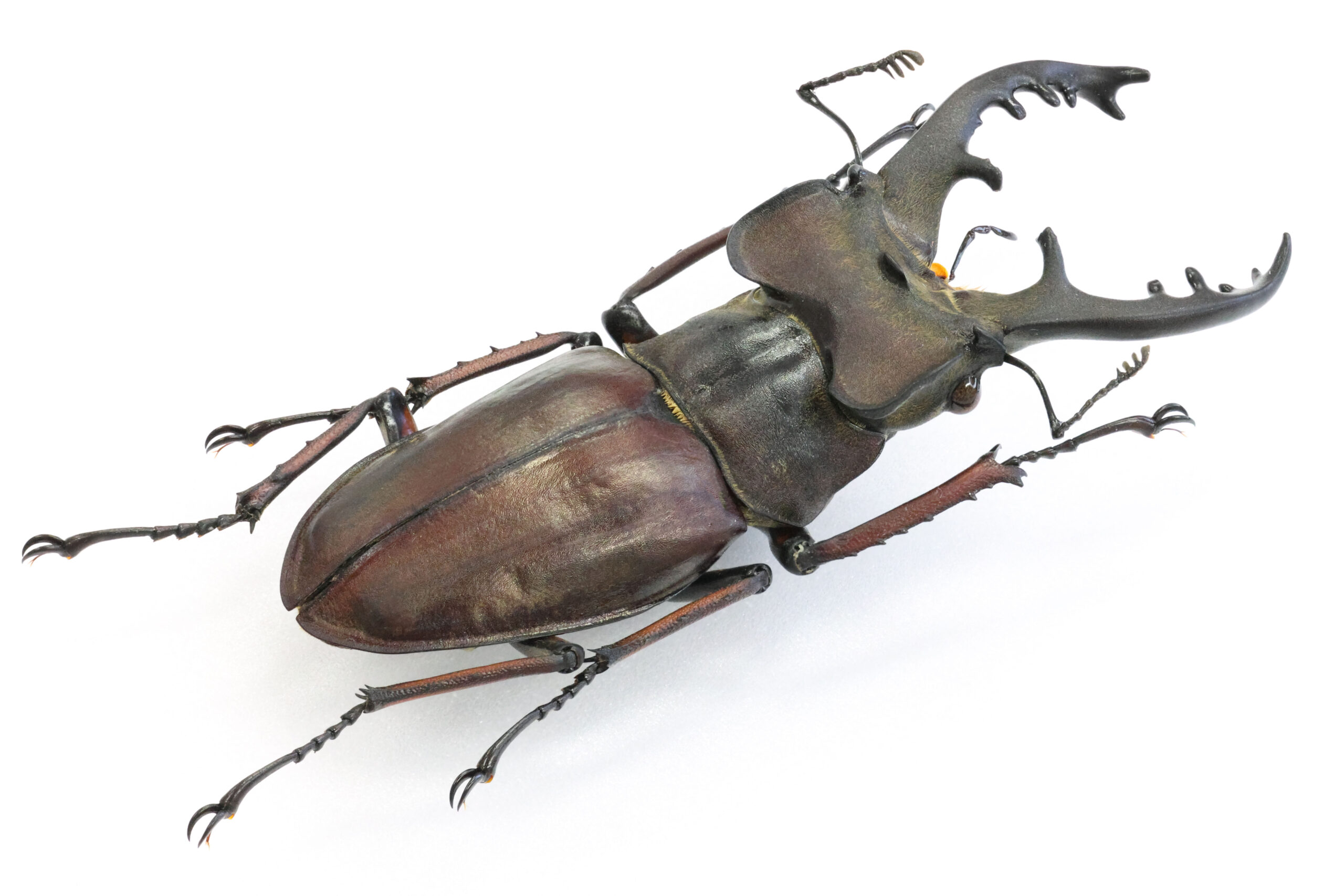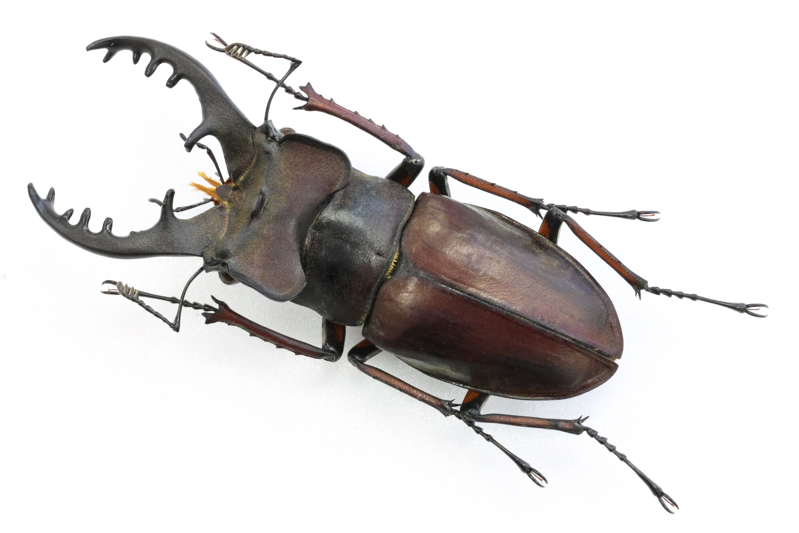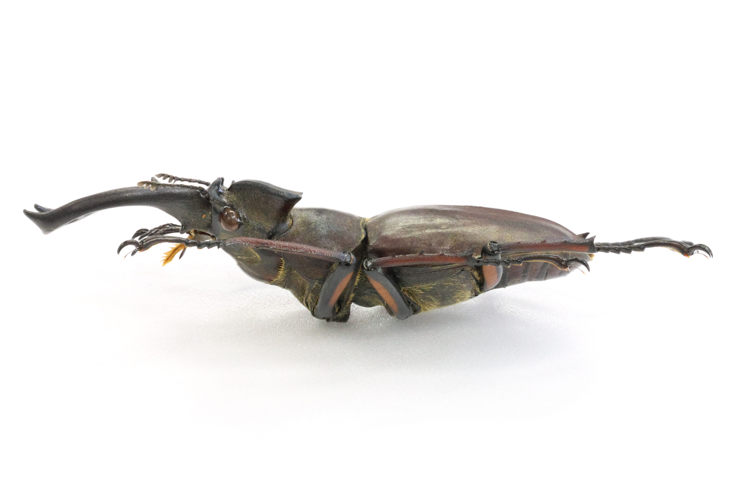 さて、本個体を見て下さい。バランスの良い魅力的なミヤマクワガタです。耳状突起が左右に広がるタイプで、私はこのようなフォルムに魅かれます。7月に採集された個体ですが、体を覆う微毛はかなり抜け落ち、野外で長く活動していた個体だと思います。赤の発色も美しい。