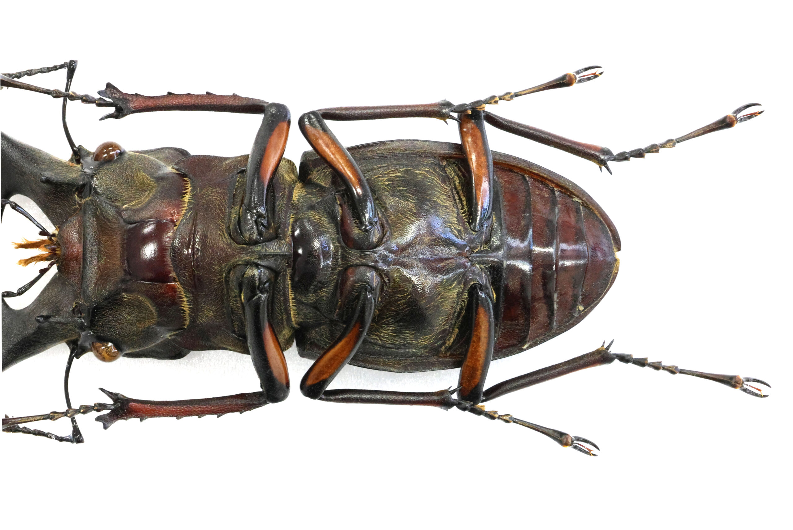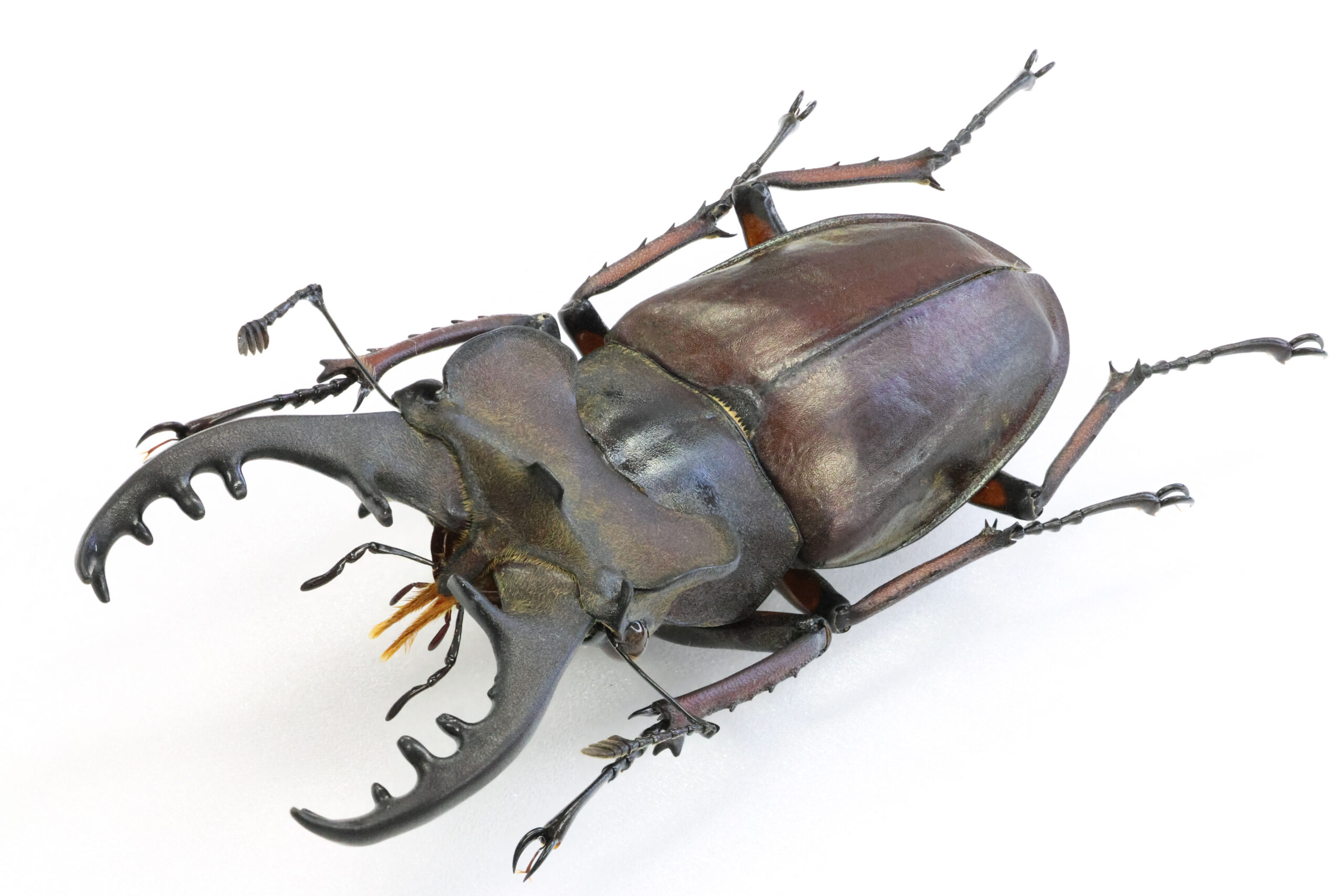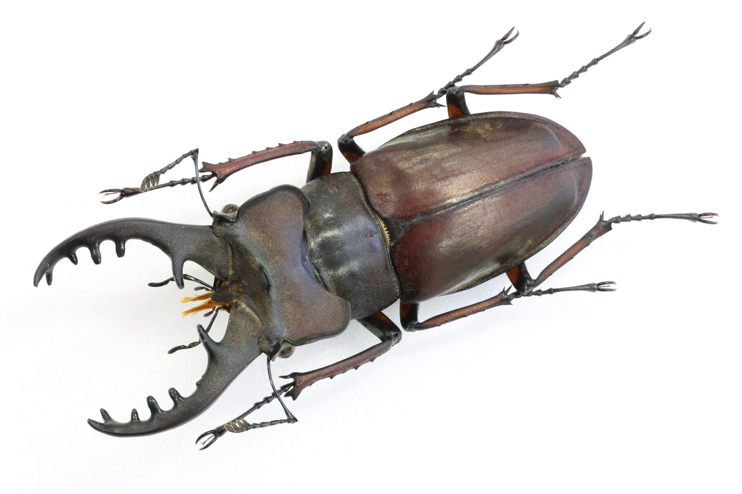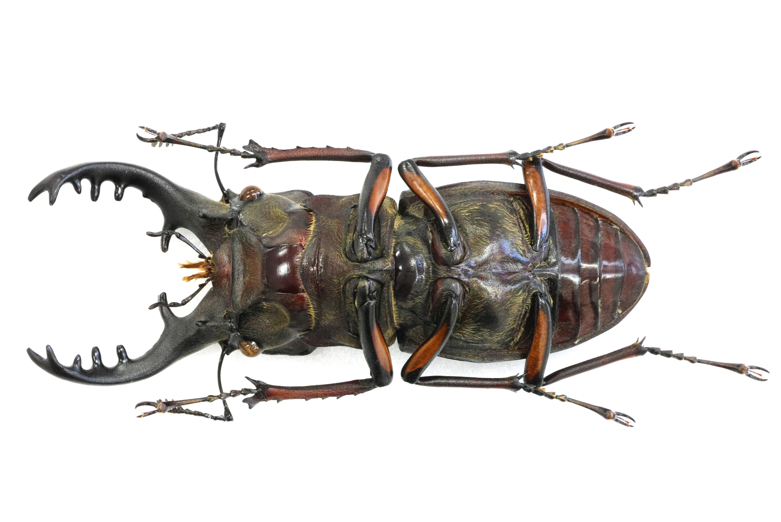 さて、本個体を見て下さい。バランスの良い魅力的なミヤマクワガタです。耳状突起が左右に広がるタイプで、私はこのようなフォルムに魅かれます。7月に採集された個体ですが、体を覆う微毛はかなり抜け落ち、野外で長く活動していた個体だと思います。赤の発色も美しい。