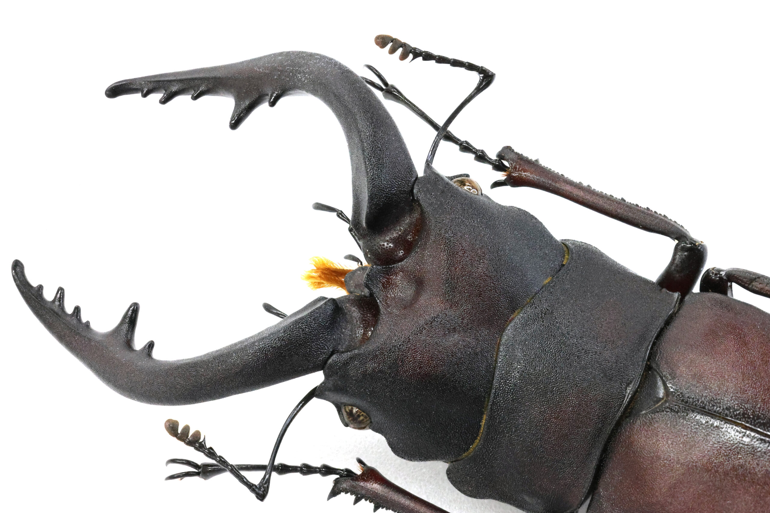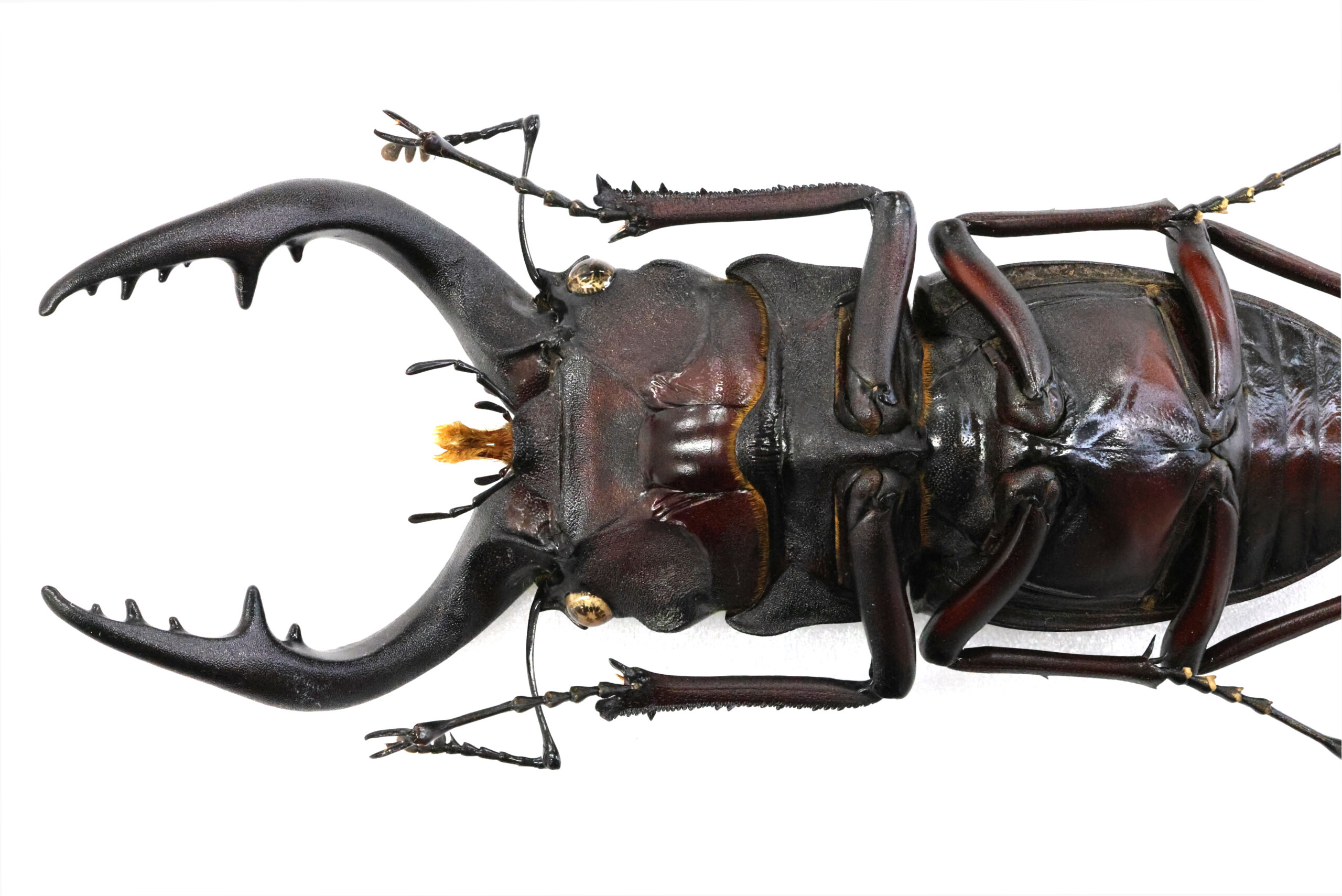 本個体を見て下さい。美しく湾曲した大アゴを持っています。ノコギリクワガタは大型になるほど曲がります。曲がり具合は様々ですが、基本的に体が大きいほどググッと曲がるのです。