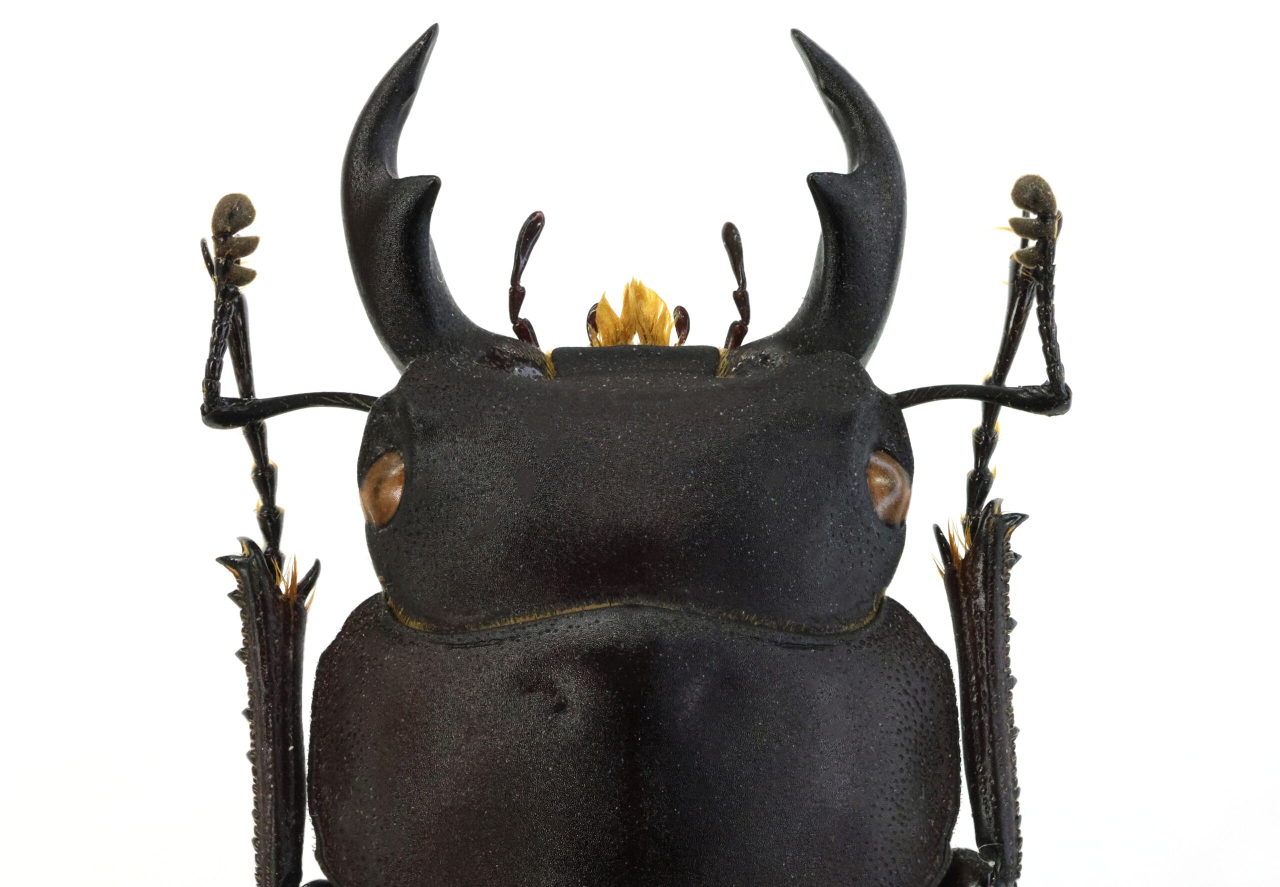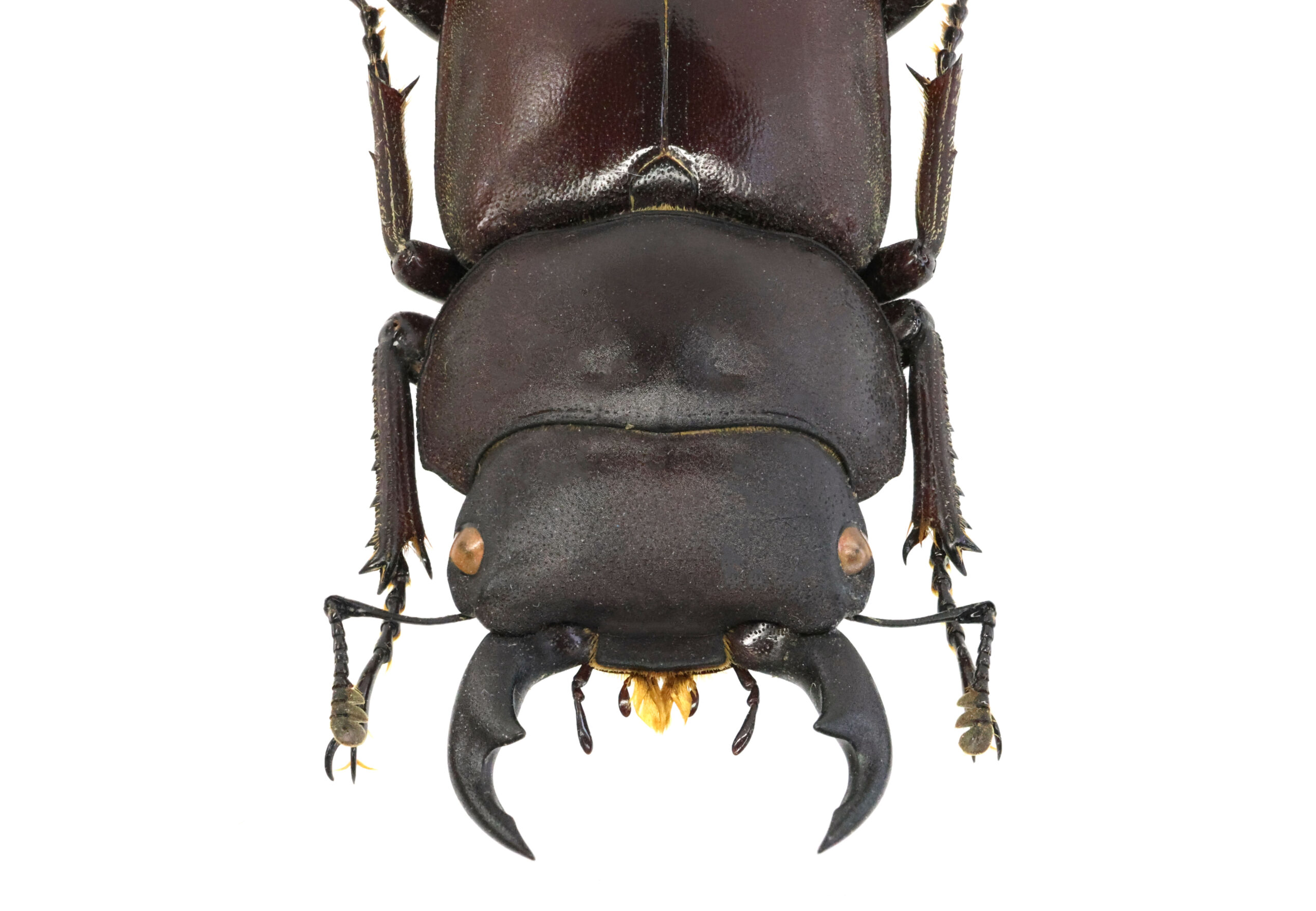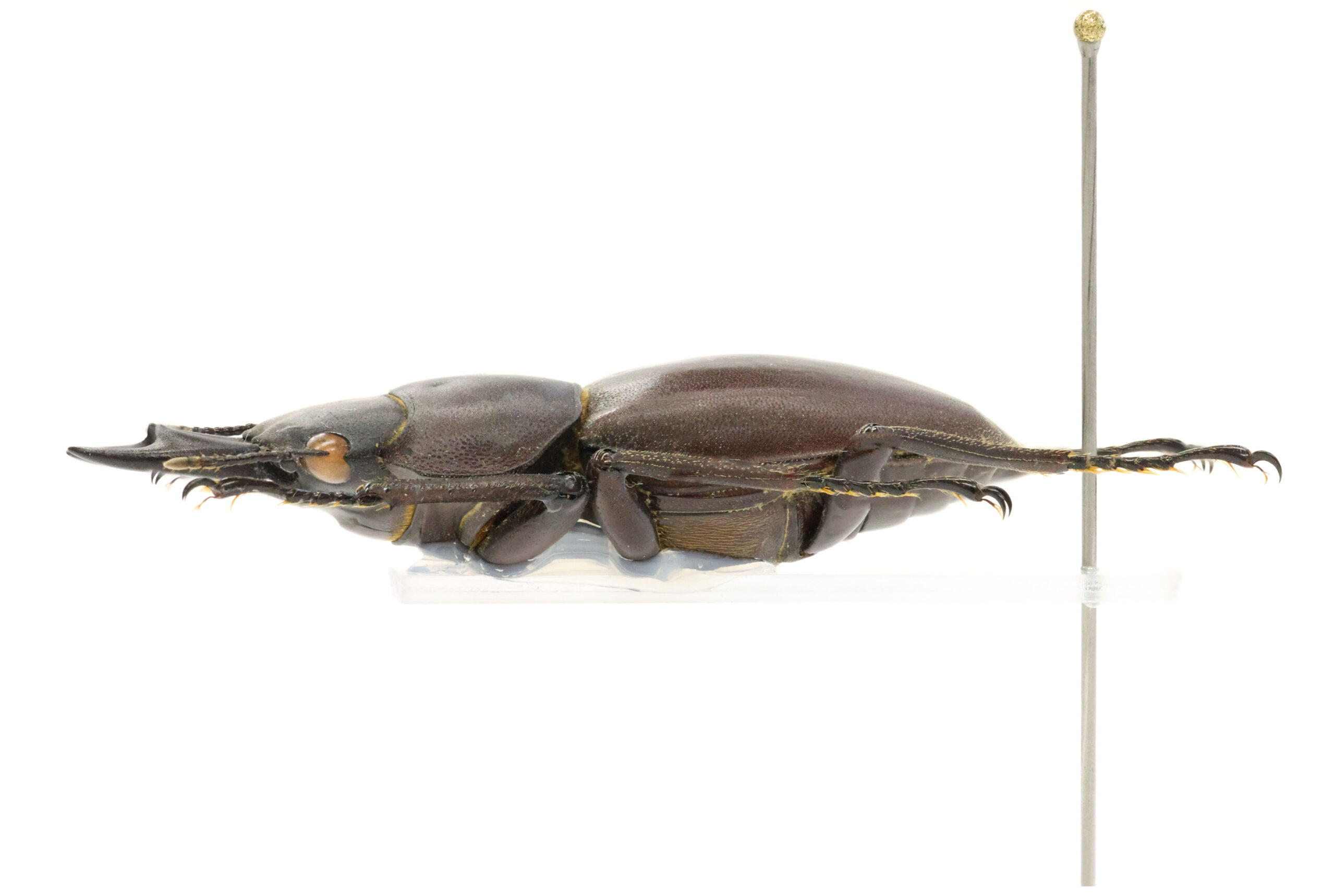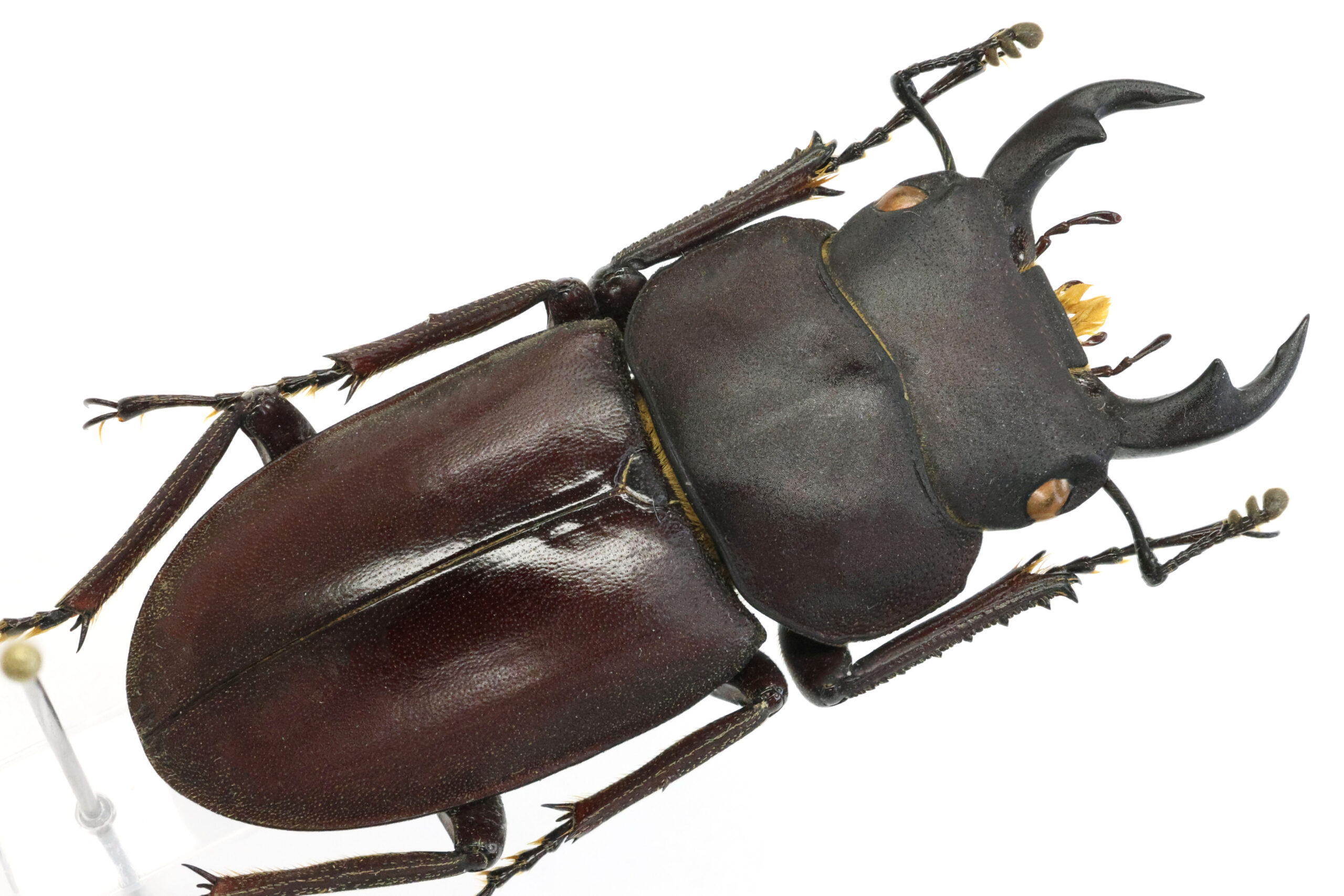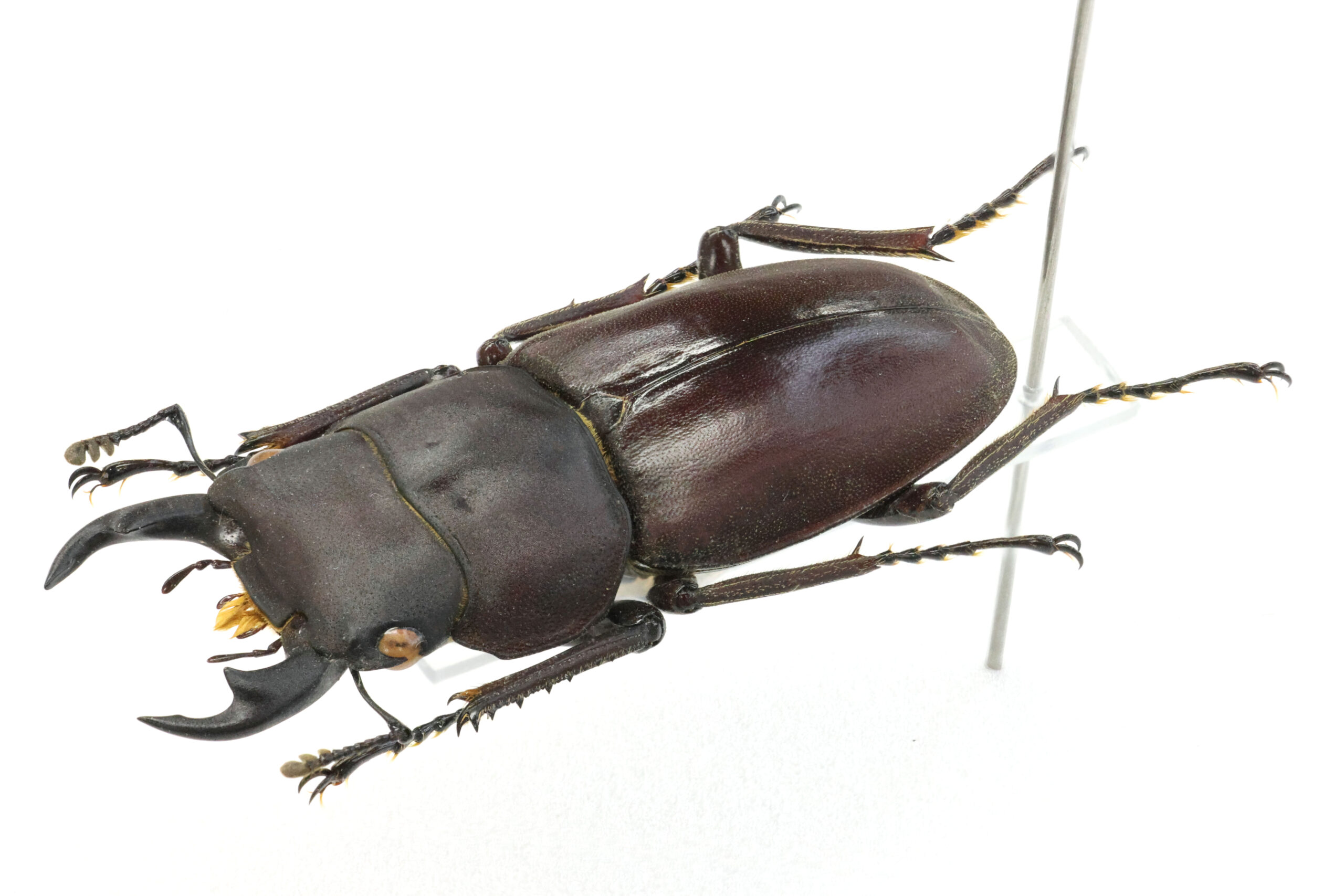 長らく幻のクワガタと呼ばれていました。それは2000年になるまで、数頭しか採集記録がなかったからです。1982年7月16日に初めてオスが採集され、その12年後の1994年8月23日に2頭目が採集されました。これもオスでした。そして、2000年5月31日に土屋さんが初めてメスを採集されたのです。本個体は、その貴重なメスからの累代個体となります。むし社で販売されている発酵マットを使って大切に飼育されました。