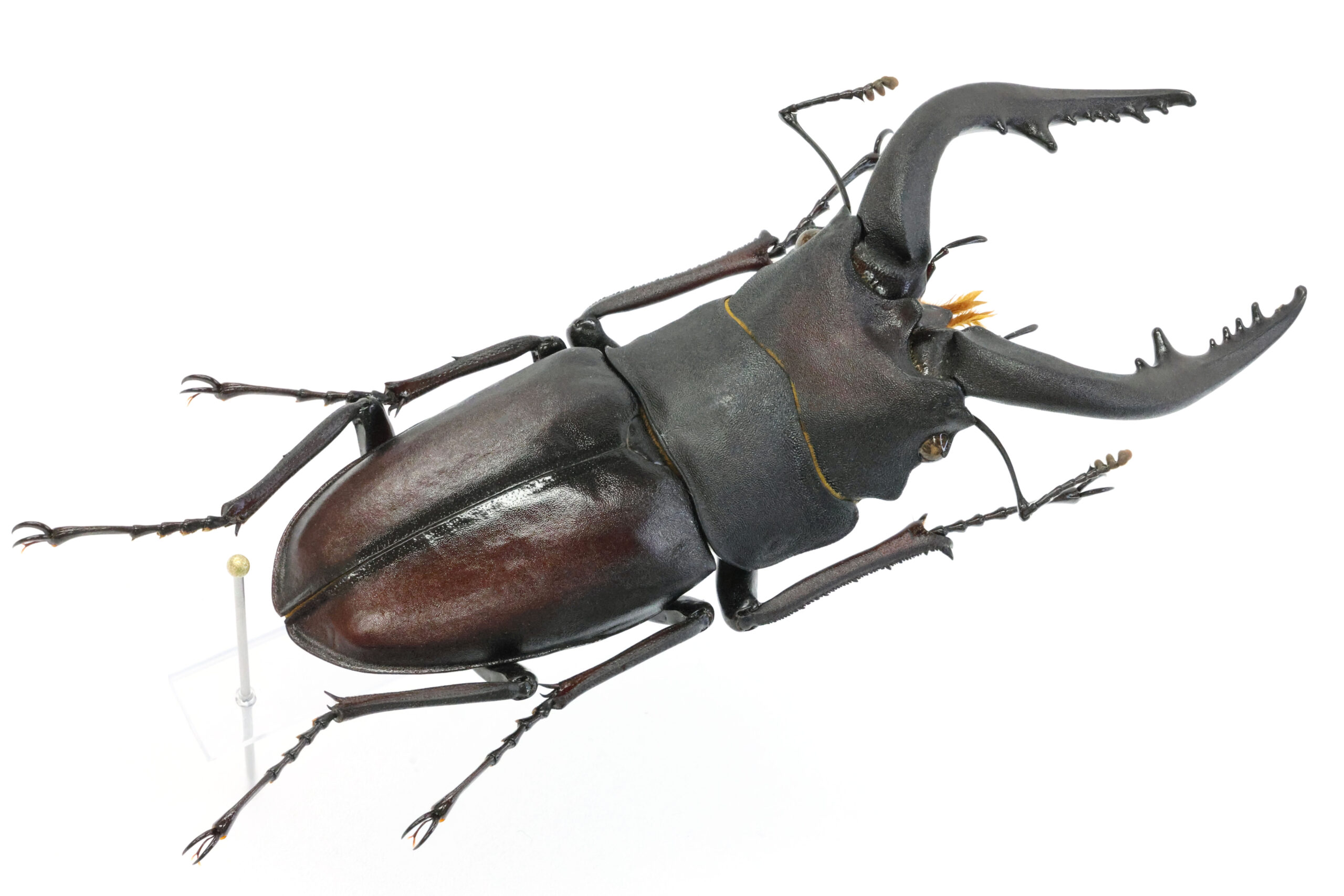 さて、標本を見て下さい。北海道のノコギリクワガタは九州産のように大アゴがスラっと前に伸びる個体は多くないように感じます。どちらかと言うと、大アゴの湾曲も強く、ボディが太い個体をたくさん見かけます。九州の70ミリUPを隣に並べてみても、本個体(69ミリ台)の方が立派に見えます。