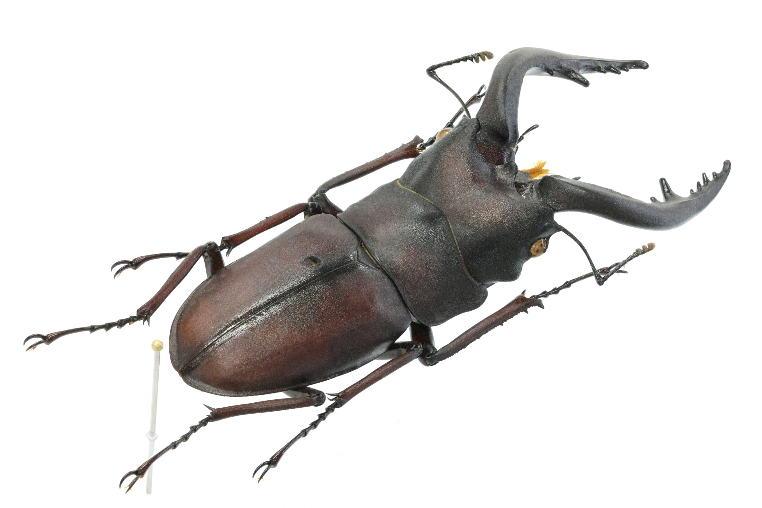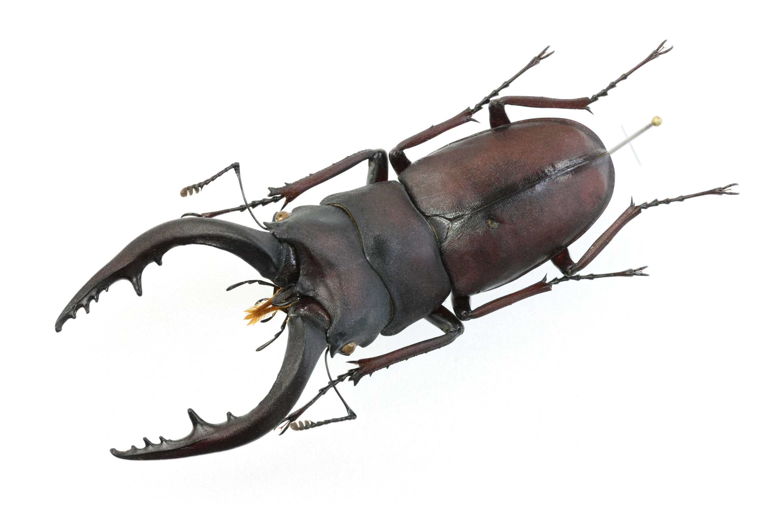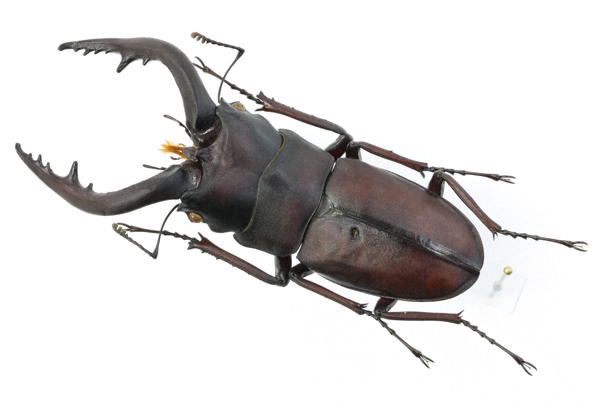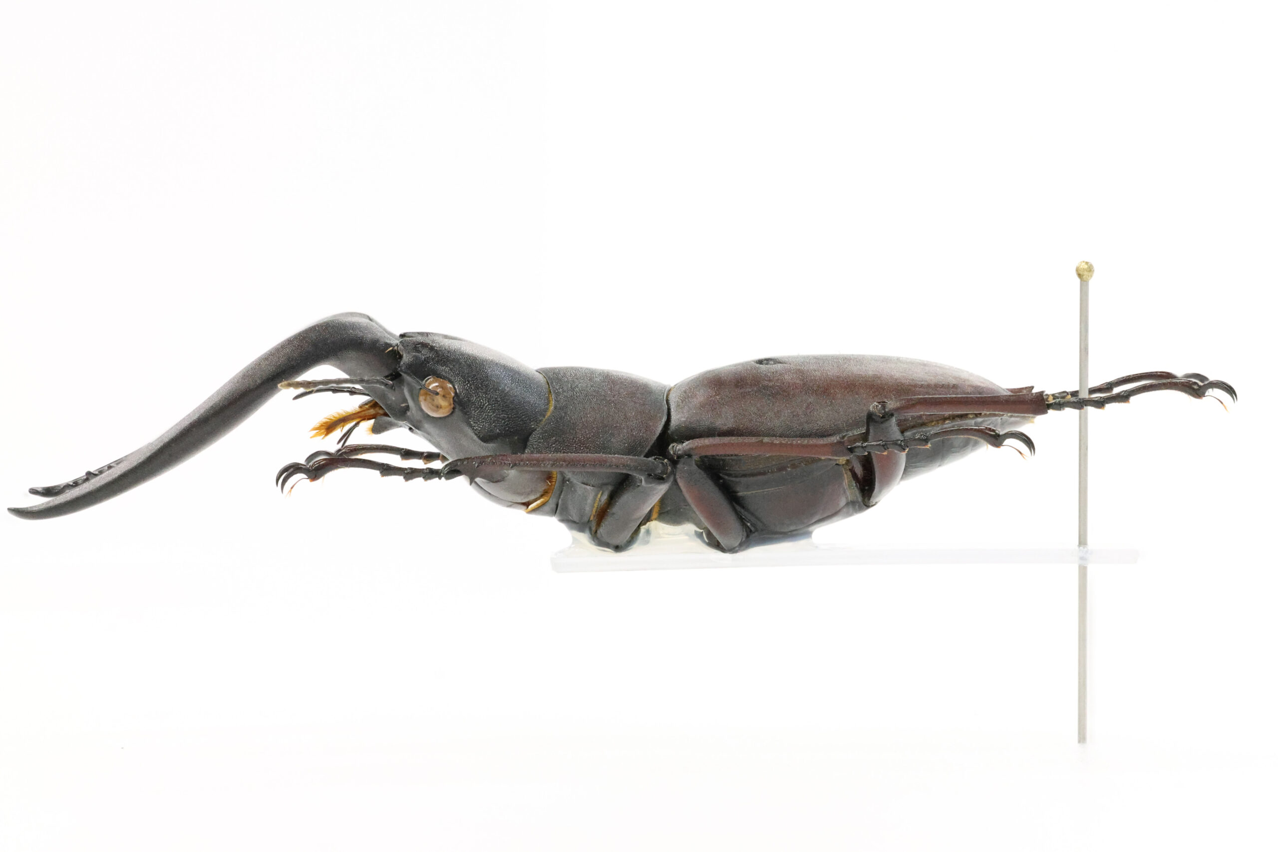標本を見ると、上翅に大きく深い穴が開いています。もう少し差し込まれれば致命傷になっていたかもしれません。これだけの傷を負わせる大きなクワガタと戦って敗れた!仕方なく他の場所を探していたら灯りが目に入った(走光性)。その灯り(外灯)を目がけて飛んで来てみたらIさんに捕まえられてしまった。勝手な想像でございます…。
