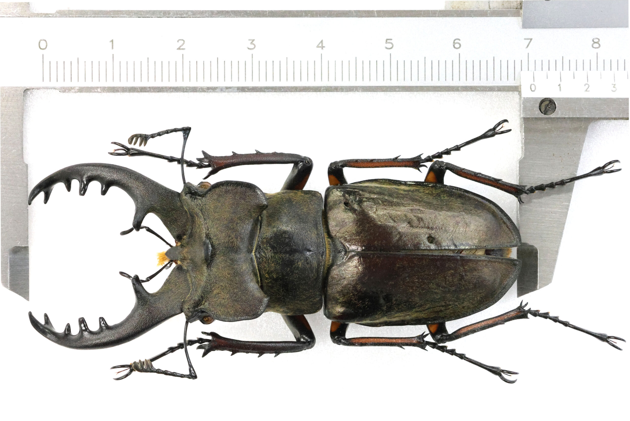 すでに亀岡市のミヤマクワガタを1頭アップしていますが、1週間ほど後に同じ場所で採集された個体をもう1頭紹介させていただきます。同じ場所で採集された個体でも、フォルムが大きく違っていて面白いですね。この個体の方が体長は0.5ミリほど小さいのですが、本個体の方が大きく見えます。そうです!横幅(頭幅)が大きいからなのです。迫力のあるミヤマクワガタだと思います。この年に採集できた75ミリの特大ミヤマは、このようなフォルムだったとのこと。