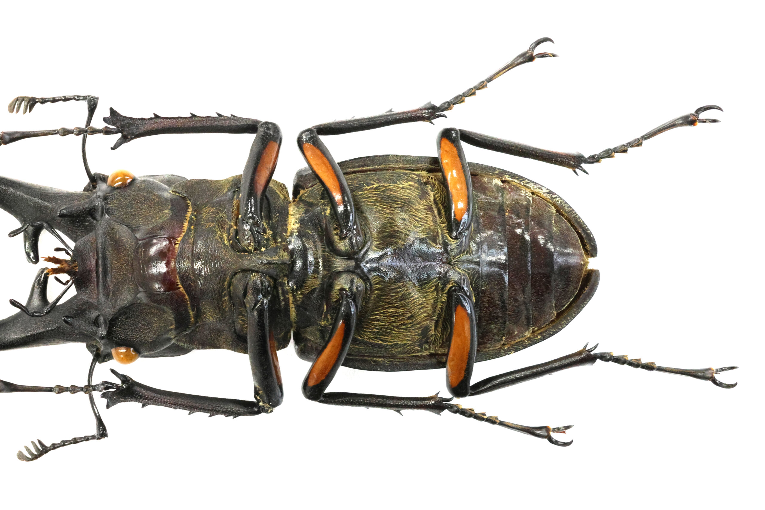 さて、標本を見て下さい。左アゴで計測すると70.5ミリ、右アゴで計測すると69.5ミリです。真ん中をとって70ミリとしています。冷蔵庫の奥底にあるのを知っていたのですが、なかなか時間を作ることができず眠らせておりました。冷蔵庫から引っ張り出して再軟化してみると大アゴが開かない…。冷蔵庫に10年以上保管すると、驚くほど乾燥しますね。再度、時間をかけて軟化してみたのですが、右の大アゴがどうしても開いてくれません。Cassiopeia君のミヤマと同じパターンでした。少し頑張ってみましたが、大切なヒラタクワガタを壊してしまったトラウマも残っているため、あきらめました。もしアゴ先を体幅くらい(左右均等)に開くことができれば、70.5ミリくらいになると思います。頭部の発達はそれほどでもないですが、初めて採ったクワガタが70ミリなんて最高ですね。その凄さを私の娘はわかってないですけどね…笑