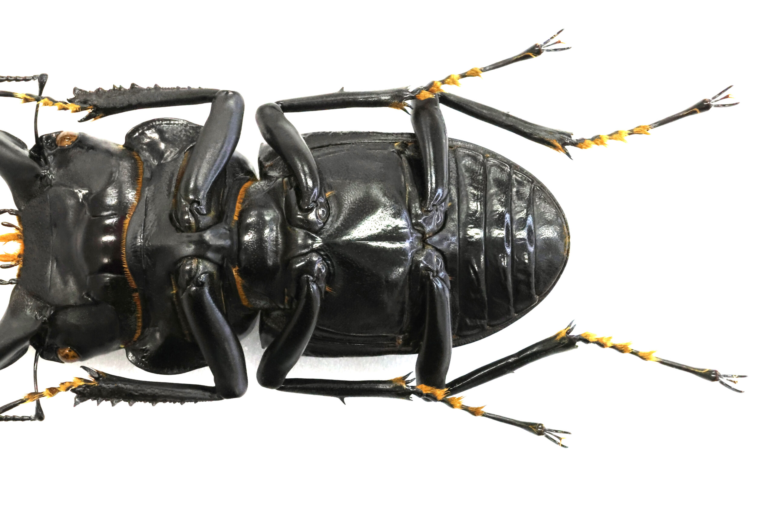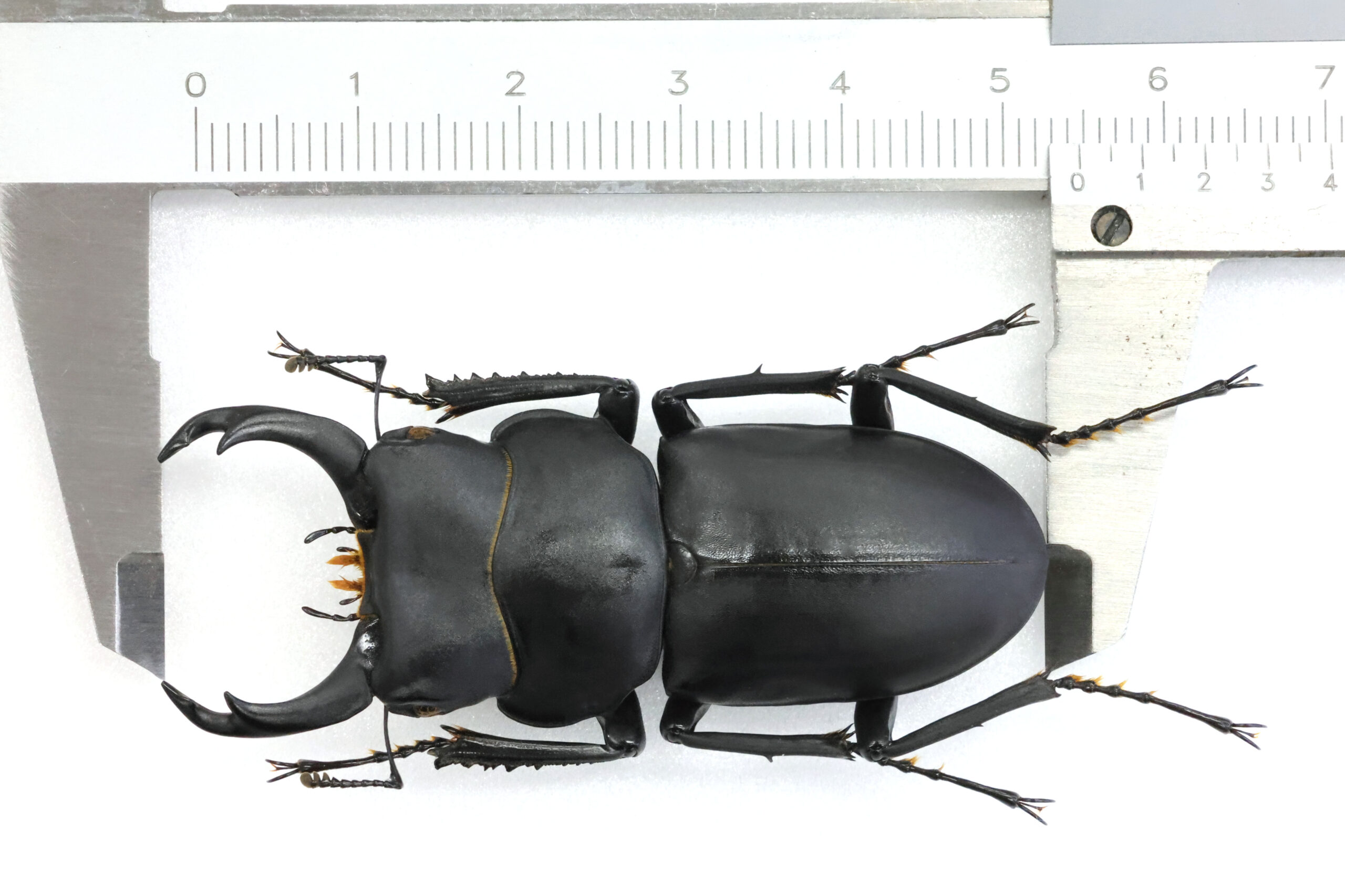 本個体をじっくり見ていただきたいです。横幅があって重量感も感じられる素晴らしいヒメオオクワガタです。これだけ大きくても、ノギスを当てるとギリギリ55ミリを超えていないことがわかりますね。